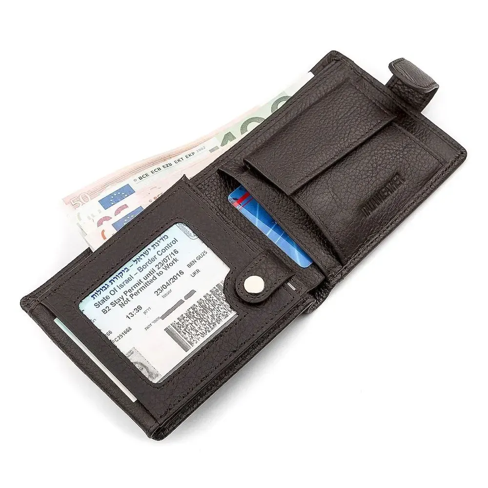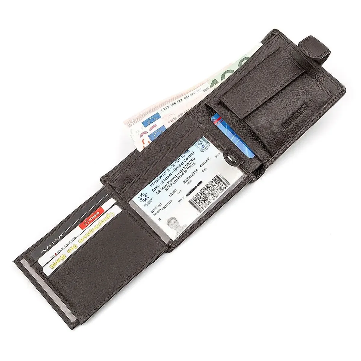 Чоловічий аксесуар у класичному стилі має розширені функціональні можливості. Фіксується за допомогою кнопки. Функціонал гаманця містить: - відділення для паперових купюр – три штуки (два відкритого типу, одна на блискавковій застібці);