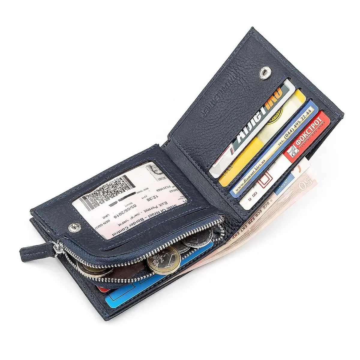 Модель користується величезною популярністю серед чоловіків. Ми з радістю представляємо аксесуар у синьому кольорі. Гаманець дуже компактний, незважаючи на це, він має чудовий функціонал – внутрішні відділи для паперових купюр, відділення на блискавковій застібці, численні осередки, призначені для карток, прилеглі кишеньки, монетне відділення (закривається за допомогою блискавки). У даному гаманці можна чудово розмістити близько 10 карток. Матеріал, який використовували для виробництва гаманців – натуральна шкіра. Як підкладку застосували текстильний матеріал. У нашому інтернет-магазині представлений чудовий асортимент чоловічих гаманців зі шкіри. Ви неодмінно зможете придбати ідеальний аксесуар.