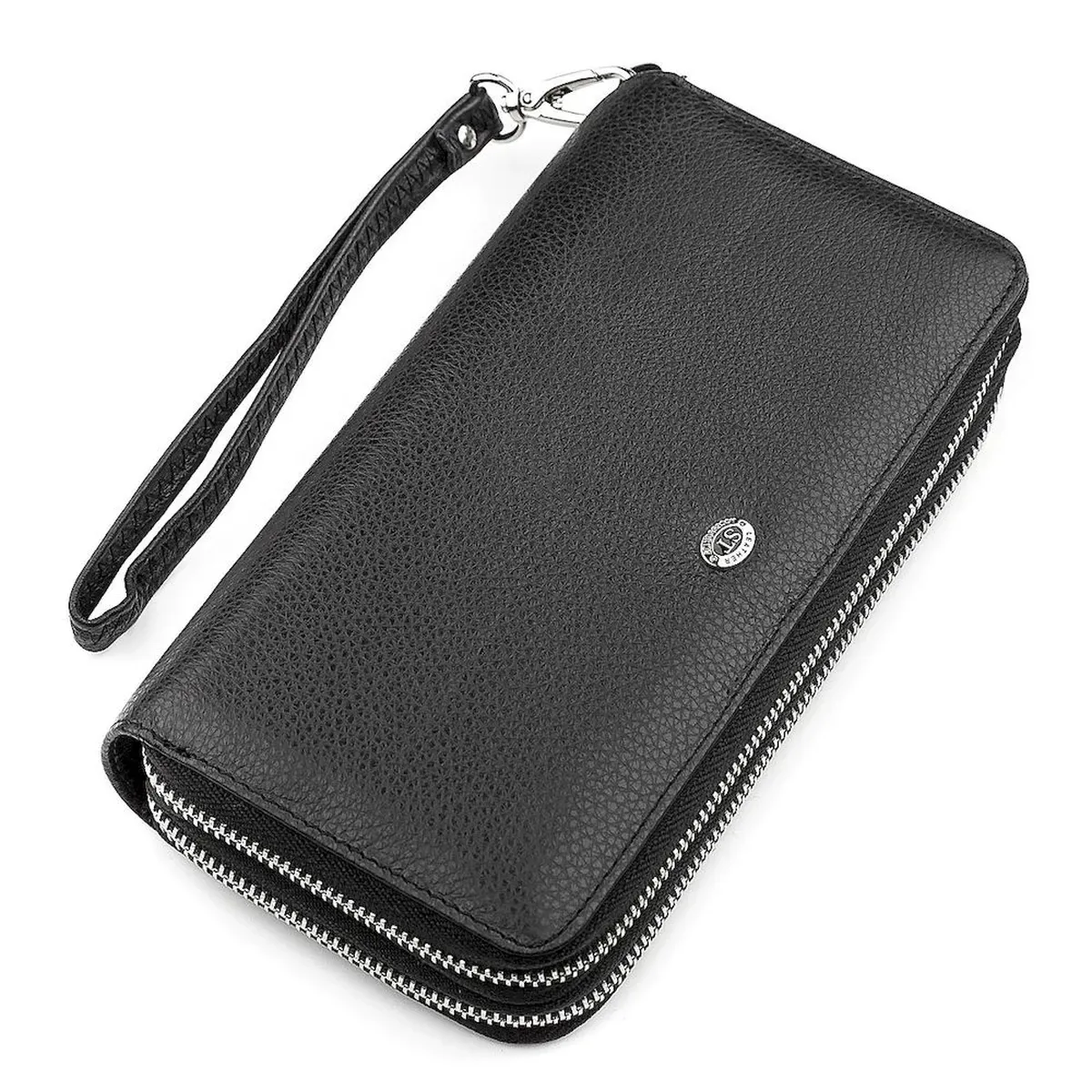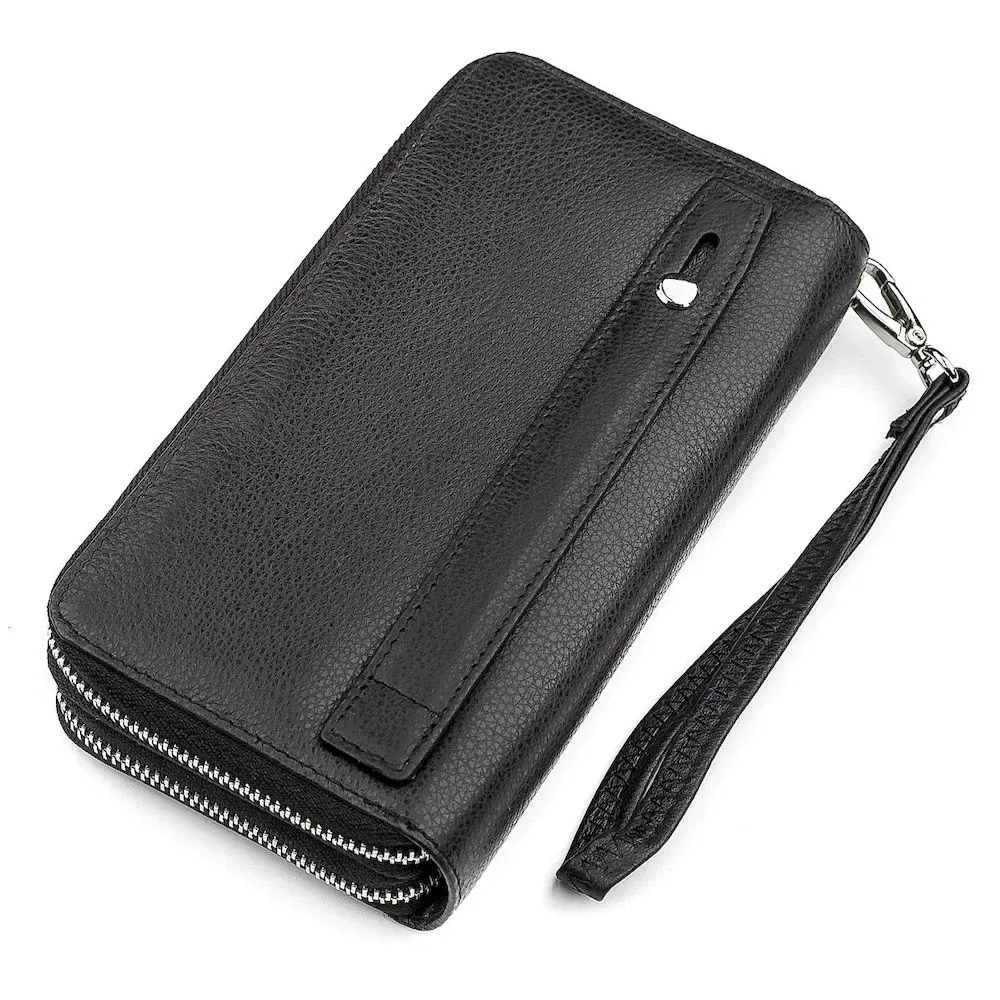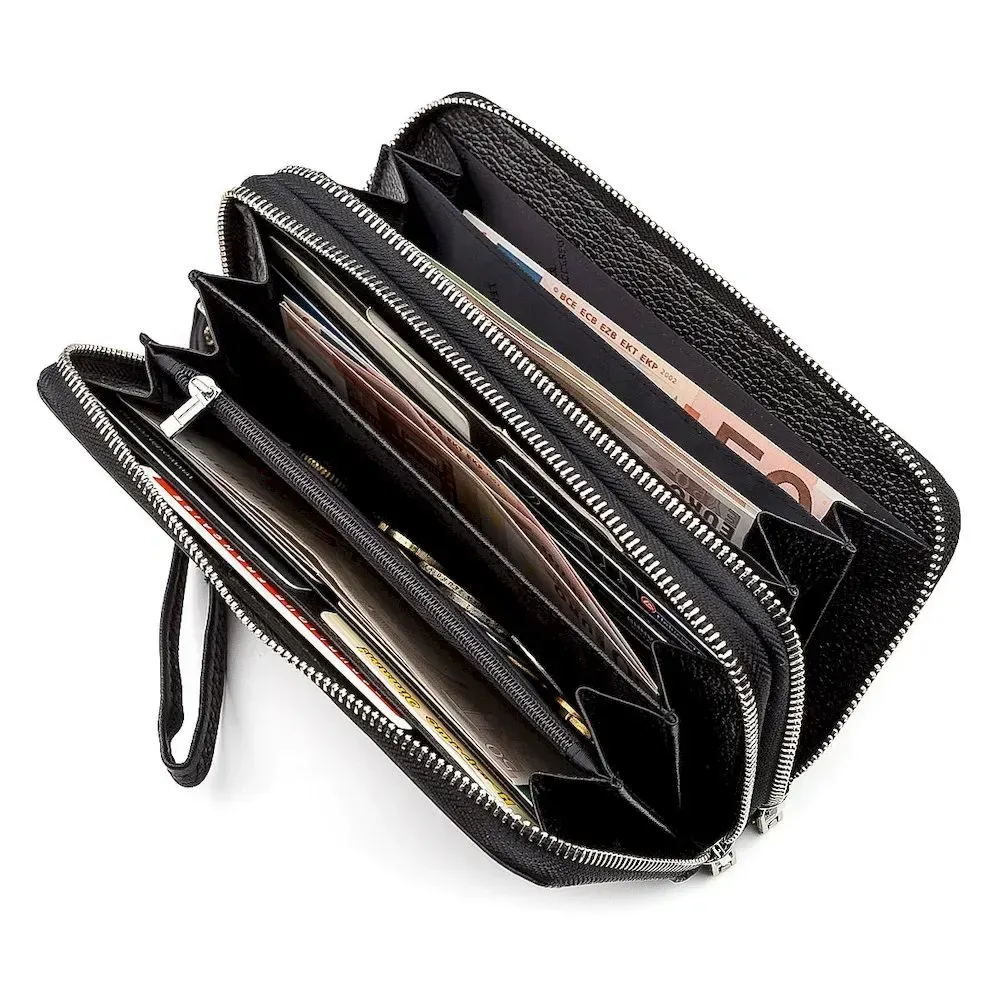 Дана модель виробляється в класичному стилі та солідному чорному кольорі. Для максимальної зручності гаманець розділений на два великі відділення, всередині яких можна без проблем розміщувати паперові банкноти, банківські картки та навіть смартфон. З боків є додаткові відділення та секції для дисконтних карток, а завдяки якісній, натуральній шкірі аксесуар приємно відчувається в руках і не доставляє дискомфорту при носінні. Є також ручка для долоні та ремінець для зап'ястя. Цю модель та багато інших можна придбати на сайті нашого інтернет-магазину, який пропонує якісні вироби за прийнятною вартістю.