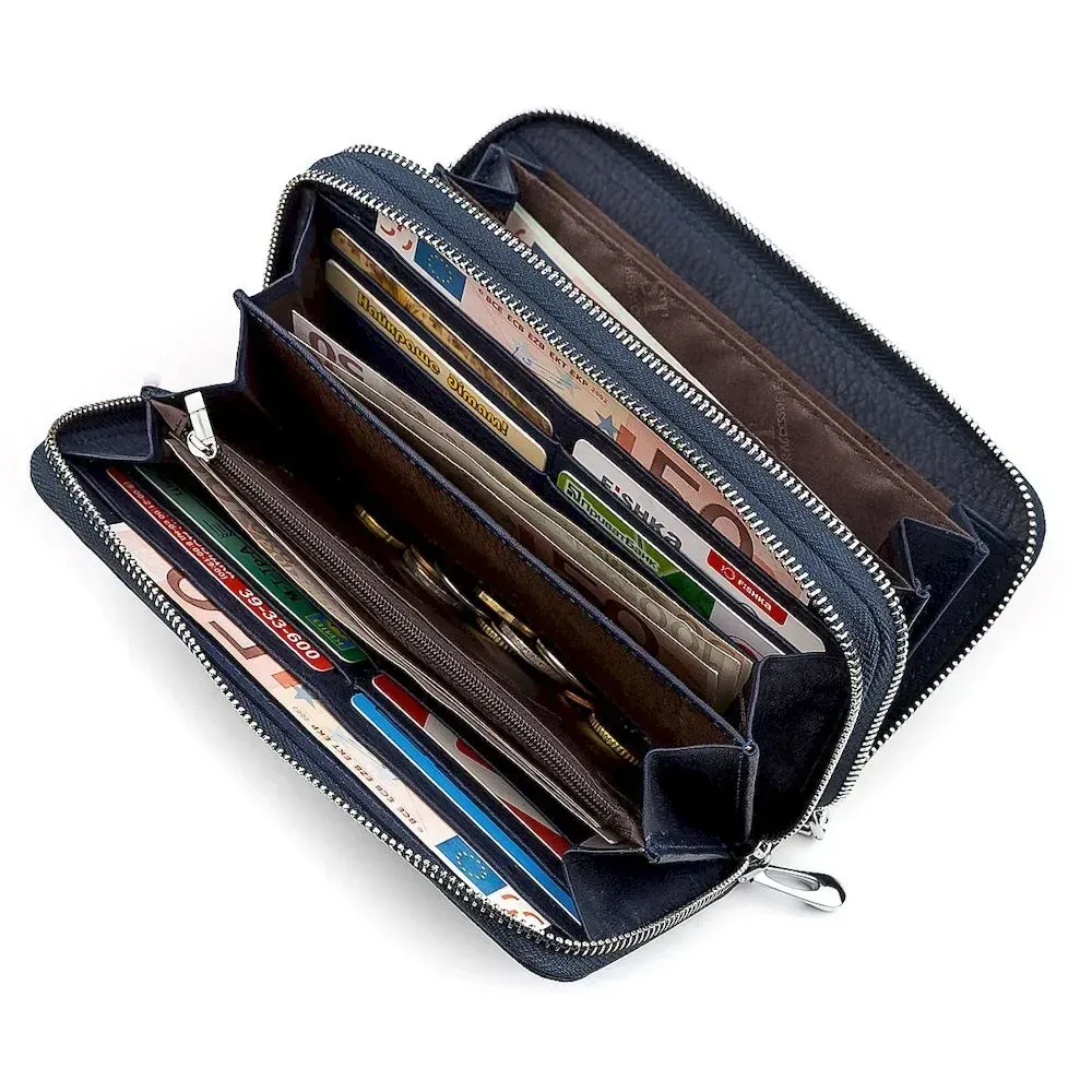 Яскравий і привабливий чоловічий гаманець виконаний у красивому синьому кольорі із зносостійкої та приємної на дотик яловичої шкіри, а всередині є текстильна підкладка. Аксесуар розділений на дві частини, що надійно закриваються на блискавці, з містким внутрішнім простором, де можна комфортно розміщувати купюри, платіжні та дисконтні картки. Гаманець носиться з великим задоволенням, а для використання у вигляді клатчу передбачені ремінці для долоні та зап'ястя. Великий асортимент якісних та надійних аксесуарів представлений на сайті нашого інтернет-магазину, де багато хто зможе підібрати собі необхідне за прийнятною ціною.