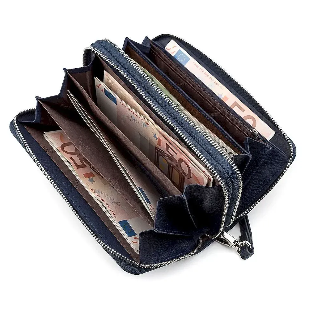 Особливості:< 9 великих відділень для купюр; 4 прихованих кишені; кишеня-перегородка на блискавці; 8 осередків під пластикові картки; ремінь-петля та ручка для долоні .