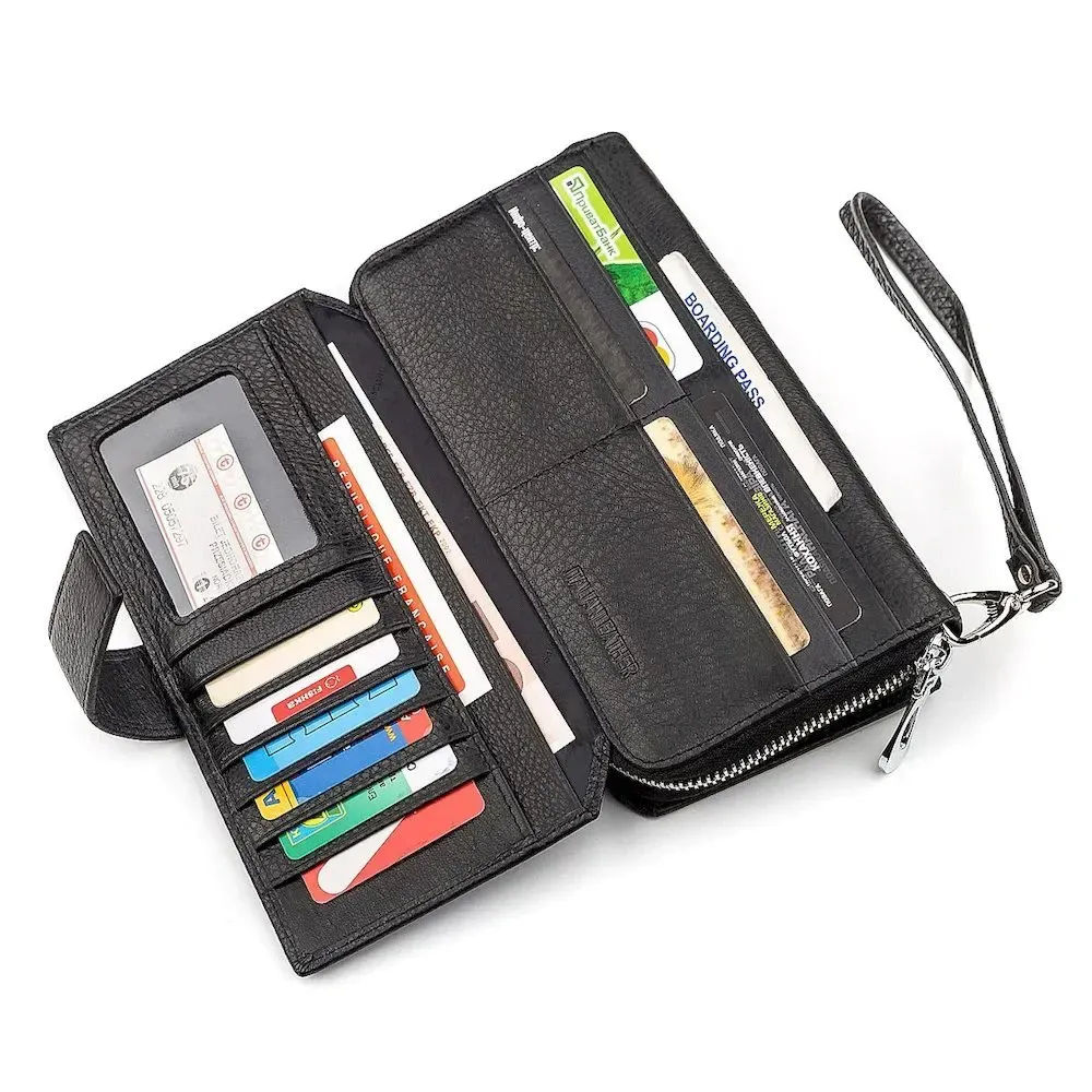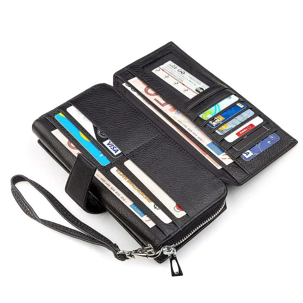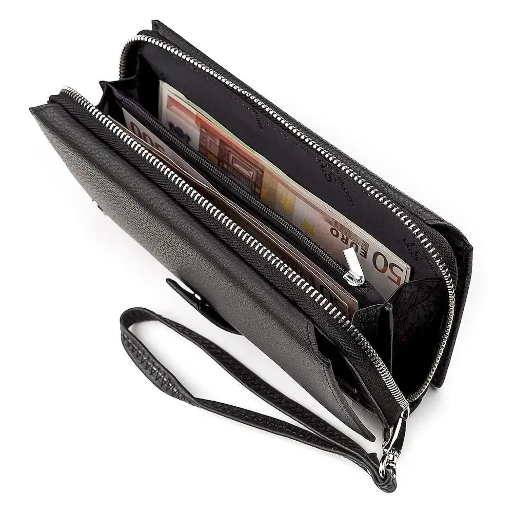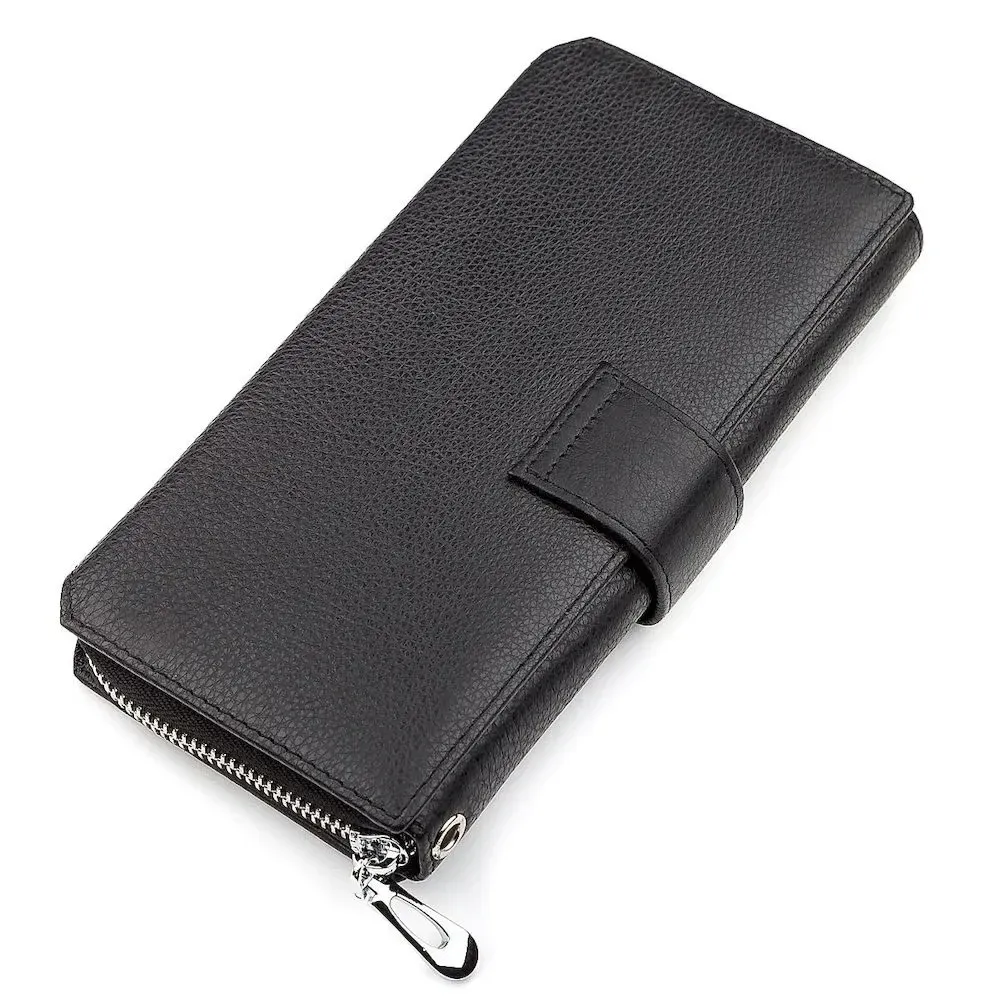Представлена модель має класичний дизайн, виконаний у чорному кольорі з використанням зносостійкої та якісної шкіри, доповненої усередині текстильної підкладки. Місткість гаманця відмінна, а окремий блок осередків для платіжних карток дозволяє вміщувати цілих 20 візиток, дисконтних та банківських карток. Додатково є прилеглі кишені, прозорі відділи для документів та відсік на блискавці для дрібниці з іншими невеликими предметами. У комплектації є ремінець на зап'ястя та гарна коробка.
