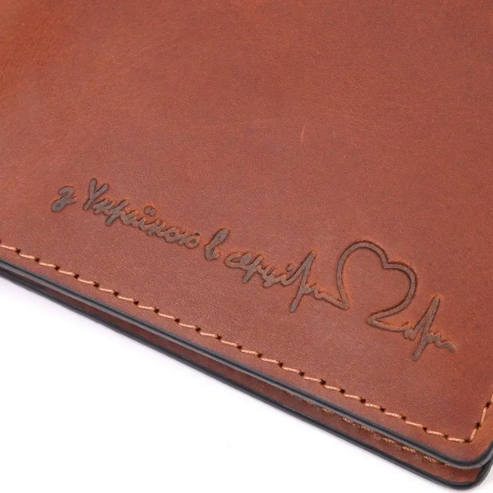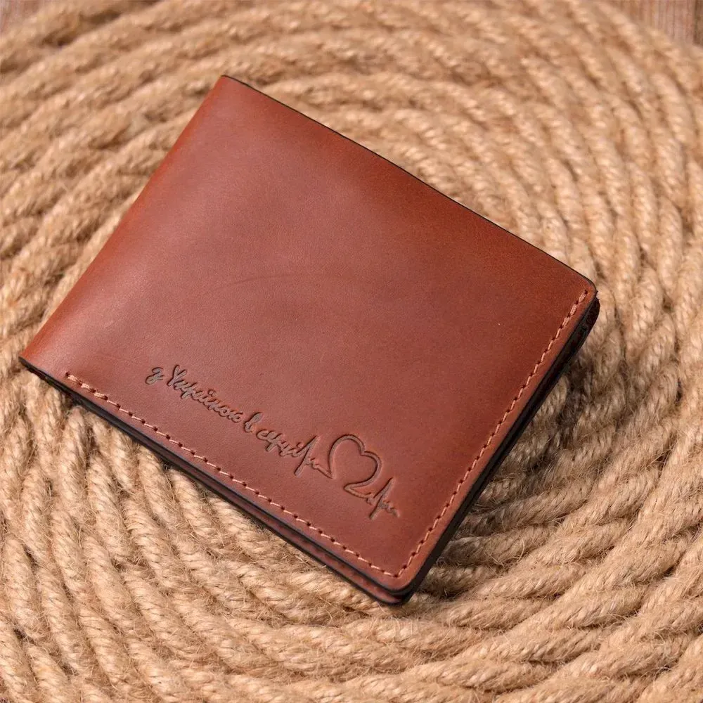 Надійний шкіряний гаманець світло-коричневого кольору, з патріотичним написом “З Україною в сердці”. Виріб пошитий із якісної шкіри, з високими показниками зносостійкості. Портмоне має одне велике відділення для купюр усіх номіналів, а також достатню кількість відділень для карток, без застібки. Шкіряний гаманець стане чудовим подарунком на всі свята для коханих та близьких.