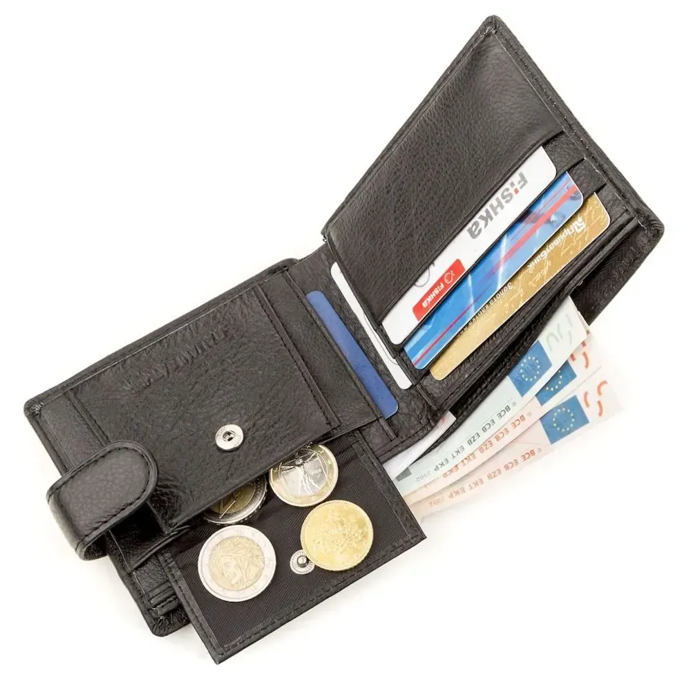 Гаманець із застібкою для чоловіків з подвійним додаванням відрізняється унікальним дизайном та зручністю в експлуатації. У цій моделі ви можете розмістити все необхідне: кредитка, дрібниця і банкноти. Для виготовлення використано чорну натуральну шкіру. Відмінним знаком бренду є рівний рядок по канту та фірмовий логотип.