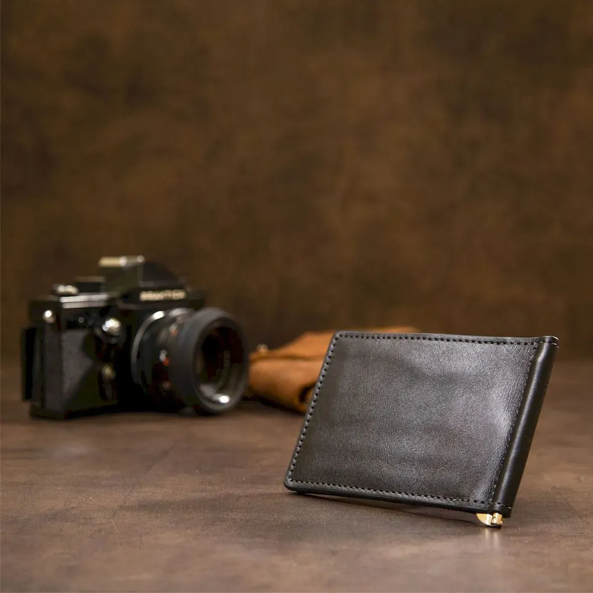 Чудовий шкіряний затискач для грошей у класичному універсальному чорному кольору. Завдяки своїм компактним розмірам поміщається і в сумку, і в будь-яку кишеню. Крім того, всередині також є слоти для карток та візиток, що дуже зручно та практично. Такий аксесуар стане чудовим подарунком для рідної людини чи колеги по роботі.