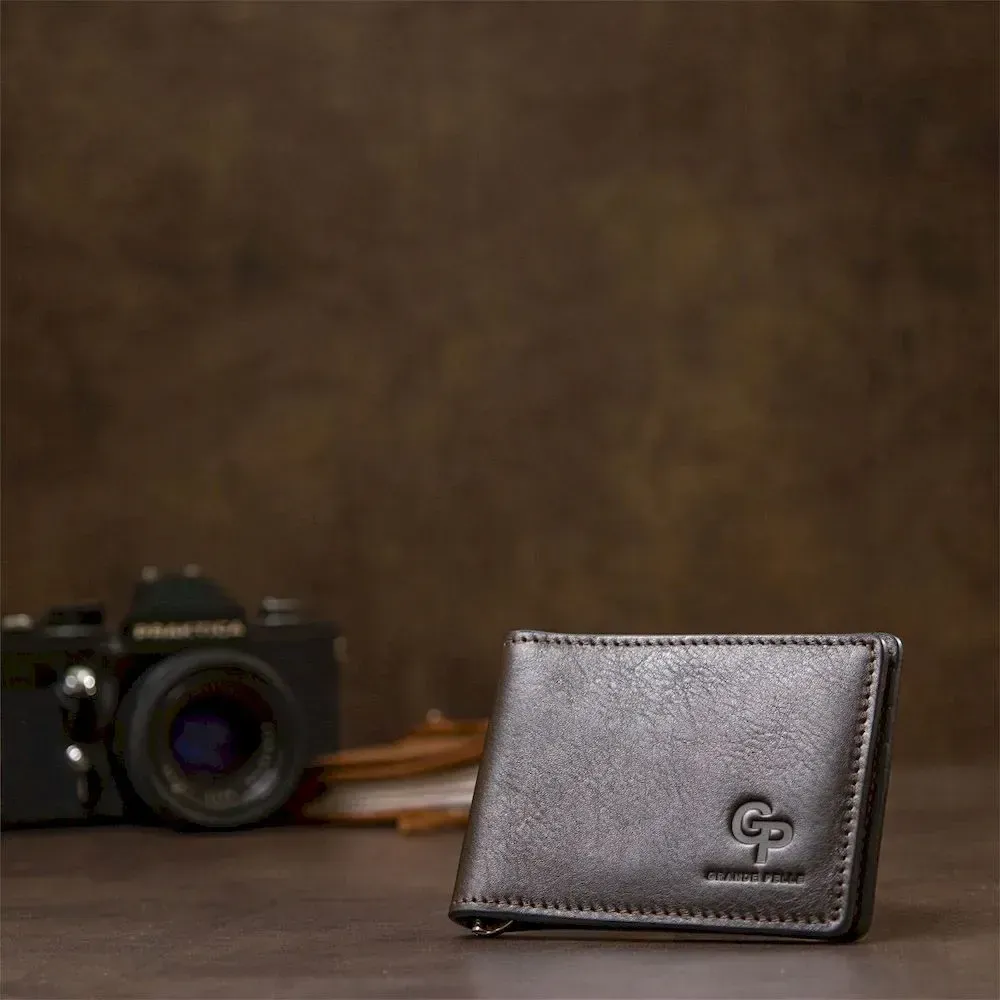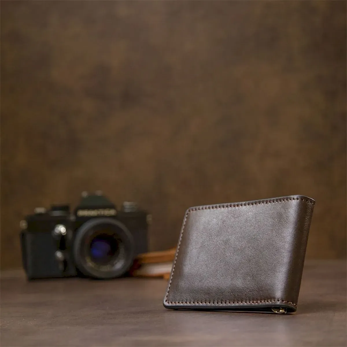 Гарний шкіряний затискач для грошей для тих, кому набридли великі гаманці. Даний виріб легко поміститься в сумку або кишеню штанів, при цьому Ви не відчуєте дискомфорт. Колір – темно-коричневий із глянцевим відливом. Шкіра на дотик м'яка та приємна. Прекрасно підійде як подарунок, для цього він упакований у спеціальний фірмовий чохол.