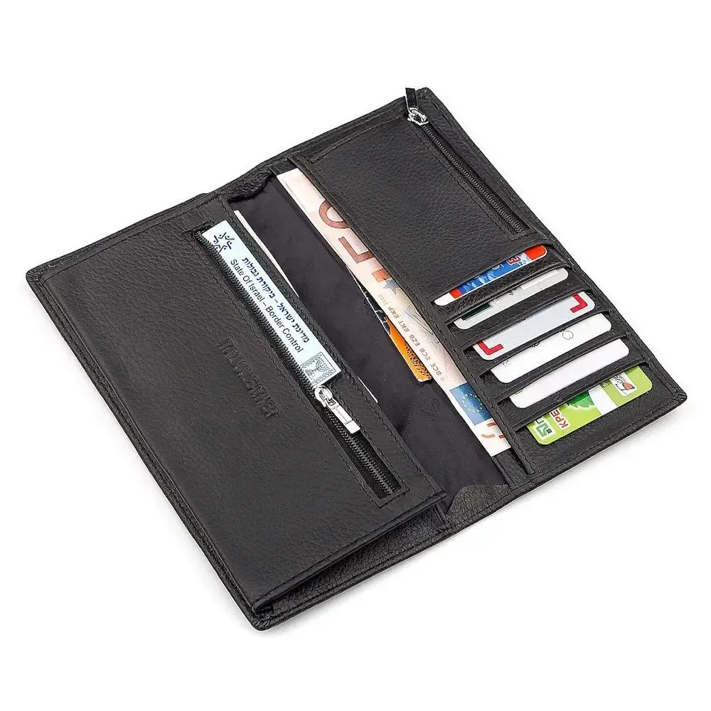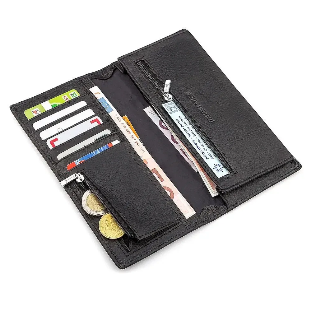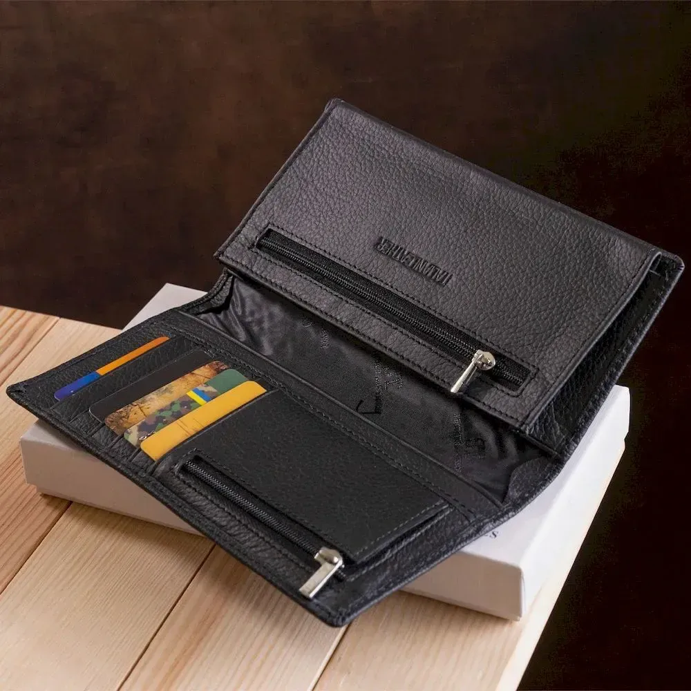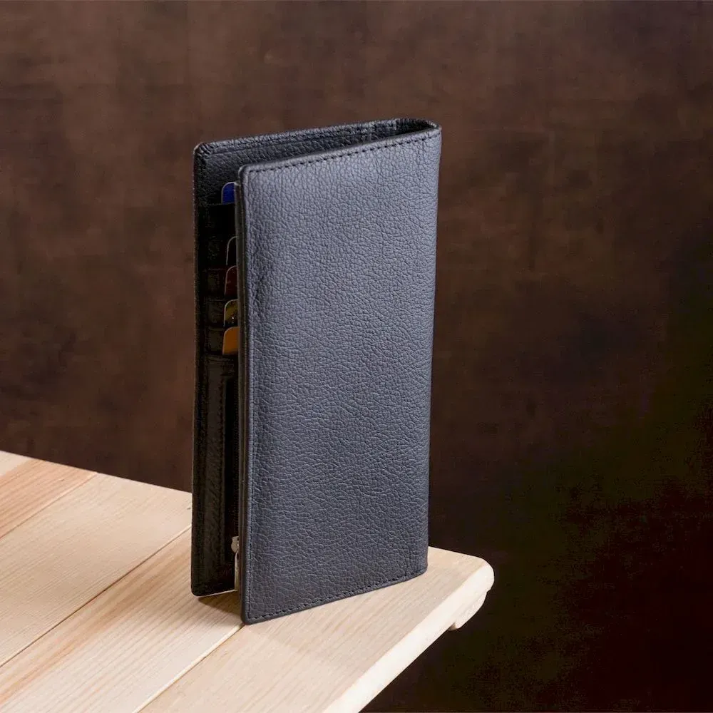 Гаманець-книжка вертикального типу не передбачає фіксацію клапана під час експлуатації. Дана модель виготовлена у чорному кольорі з натуральної шкіри. У дизайні аксесуара є широка кишеня для зберігання купюр. Є кілька секцій для зберігання чеків, талонів та інших документів, для карток чи візиток є спеціальні слоти та кілька внутрішніх кишень різних розмірів на застібках. У нашому інтернет-магазині ви можете замовити оригінальний гаманець із натуральних матеріалів у фірмовій коробці будь-яким зручним для вас способом.