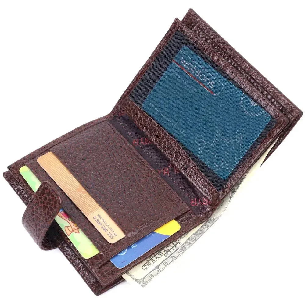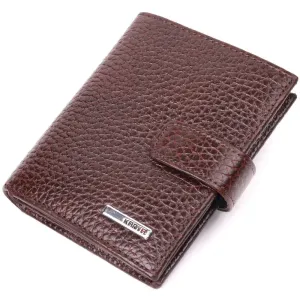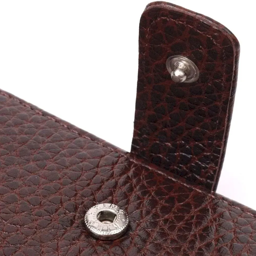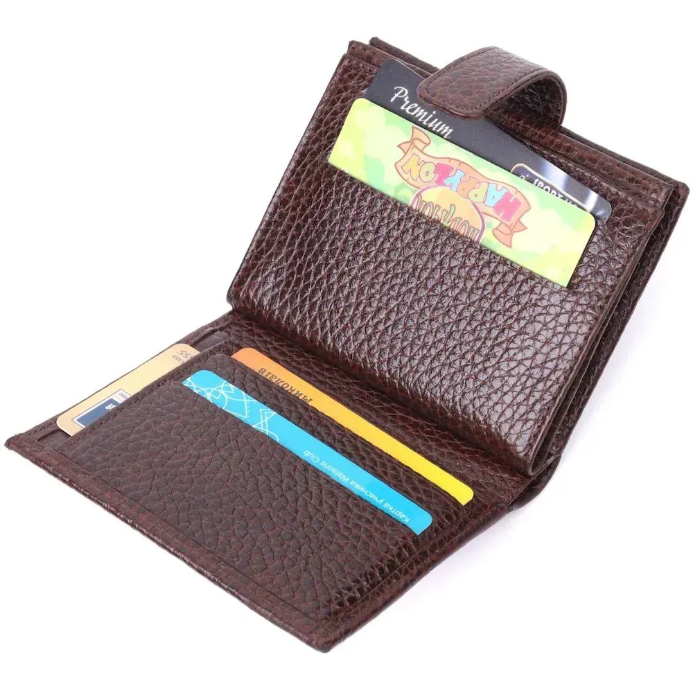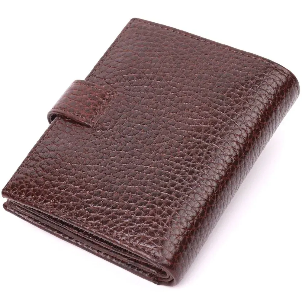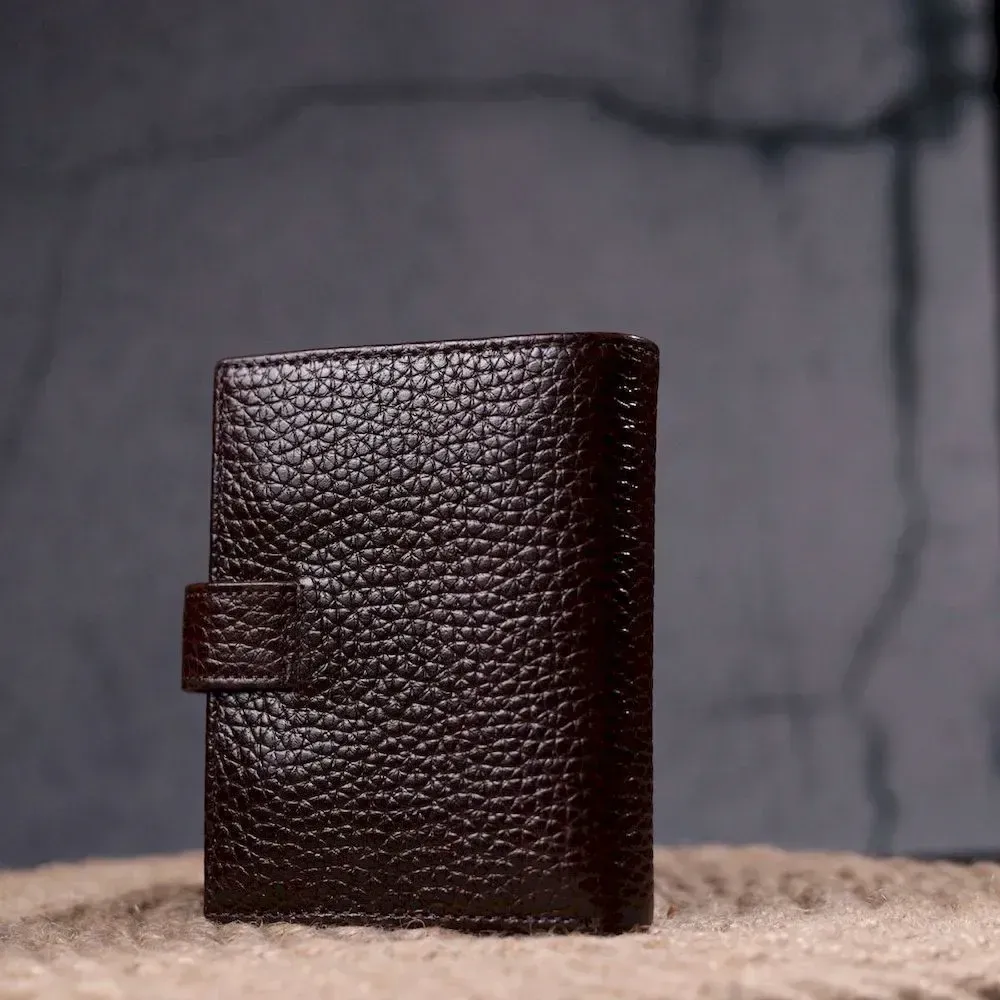 Практичний компактний портмоне з натуральної крупнозернистої шкіри, що закривається хлястиком на кнопку. Виріб має велику кишеню для купюр. Усередині достатньо осередків для кредиток. Виріб продуманий для сучасної людини. Виріб має насичений коричневий колір. Оригінальний аксесуар вигідно виділить вас із натовпу. Гаманець стане чудовим подарунком для Ваших близьких.