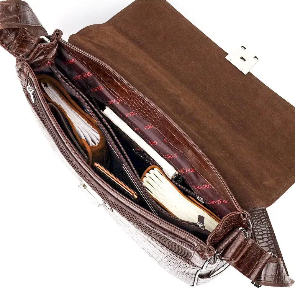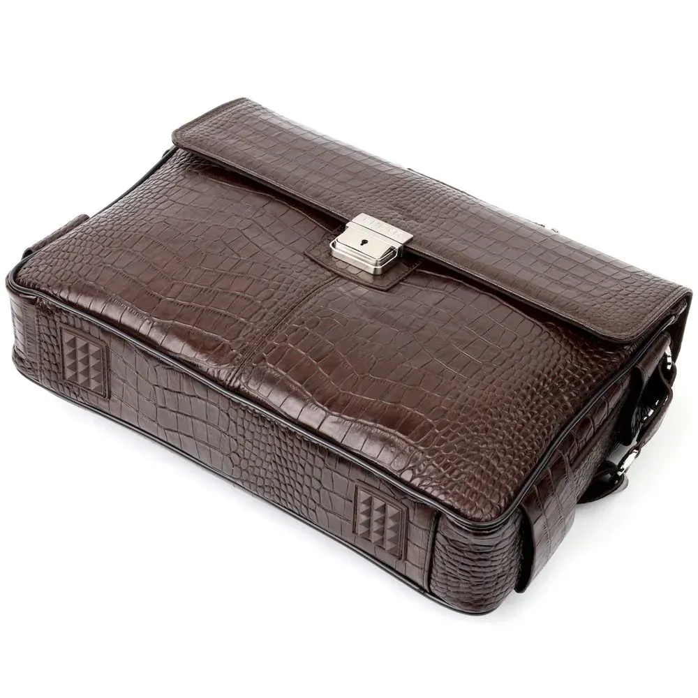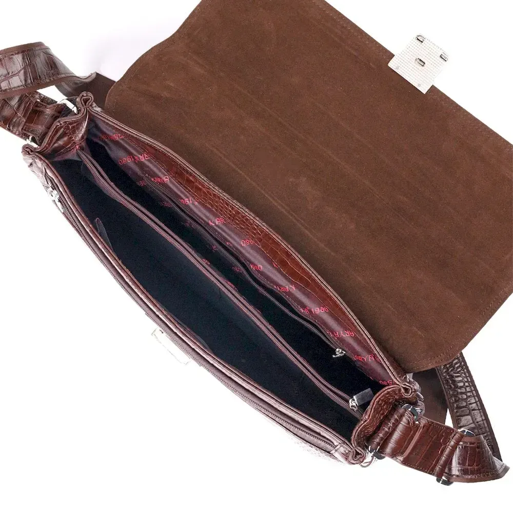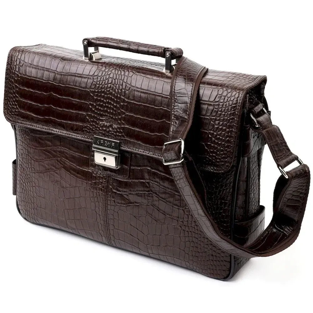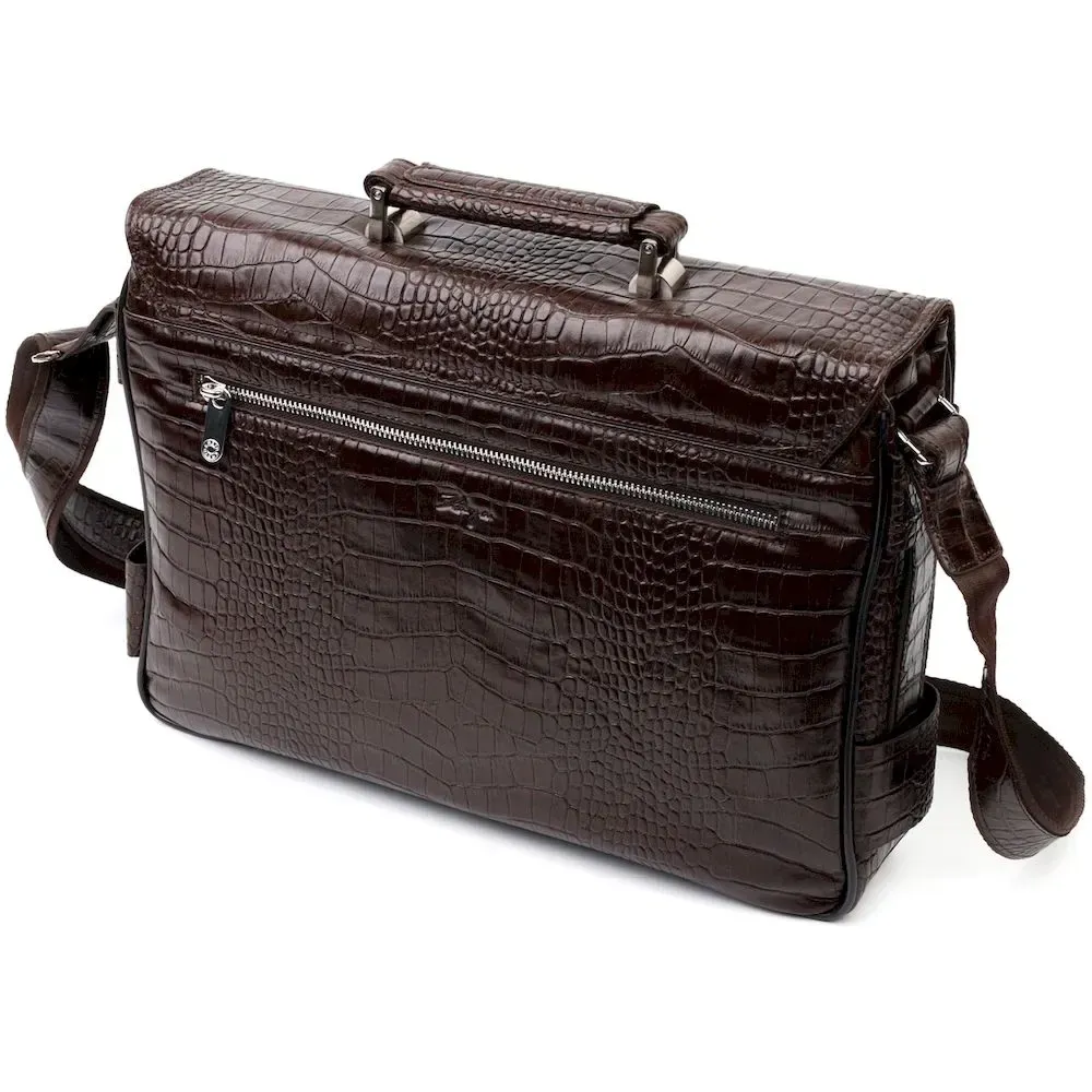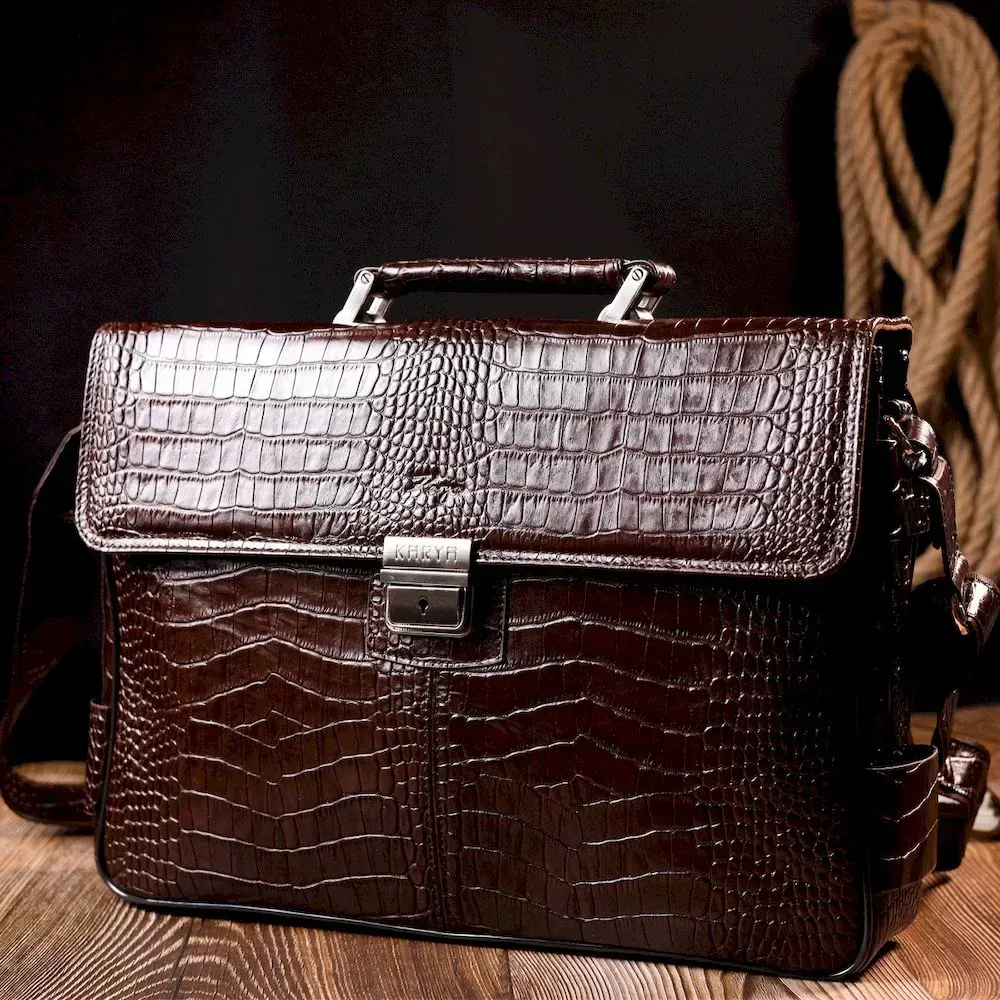 Практичний портфель з натуральної шкіри з тисненням під крокодила, коричневого кольору. Зручна та багатофункціональна модель, клямка закривається на ключик Модель доповнена фурнітурою кольору срібла плюс гумові ніжки для захисту зовнішнього дна сумки. Усередині сумки якісна підкладка. Сумку можна переносити в руці за допомогою зручної шкіряної ручки, а також через плече (у комплекті не знімний, регульований плечовий ремінь, який виконаний у комбінації текстильного матеріалу та натуральної шкіри). Буде ідеальним варіантом для подарунка близькій людині.