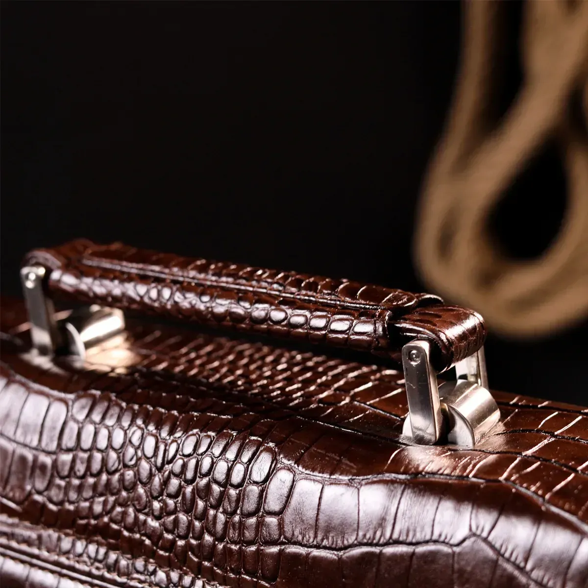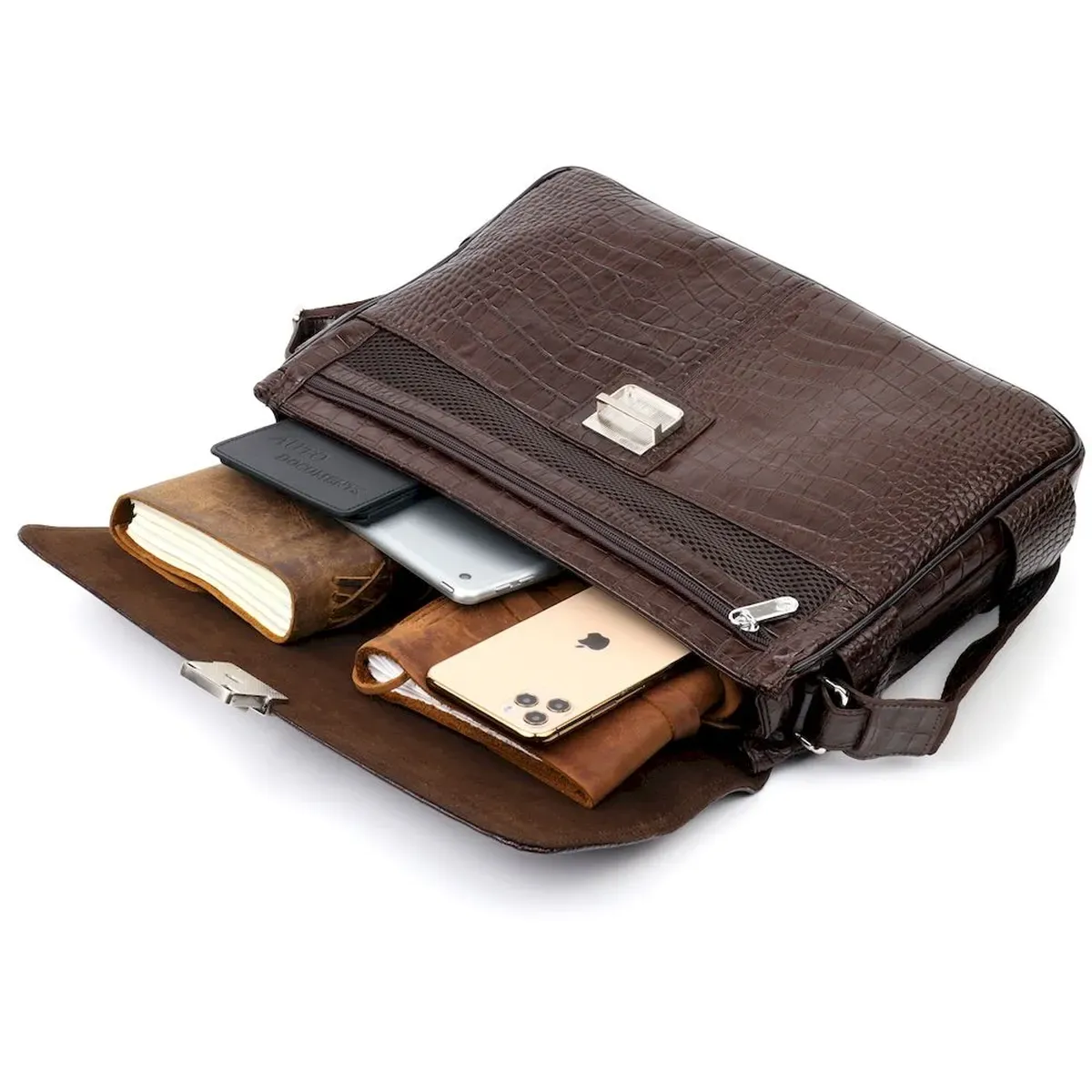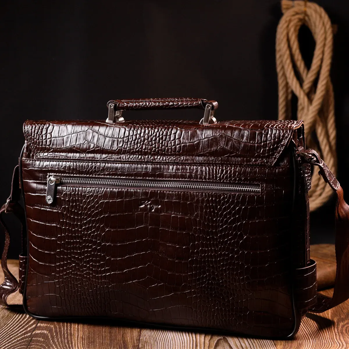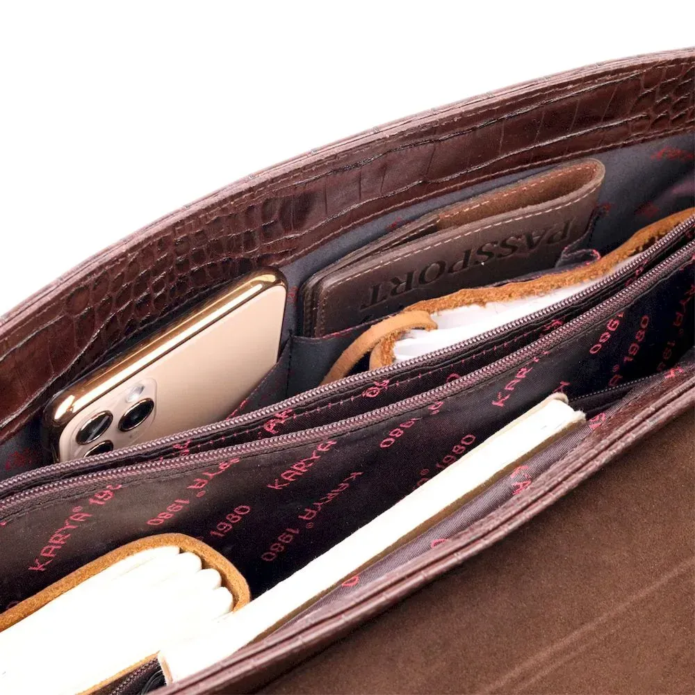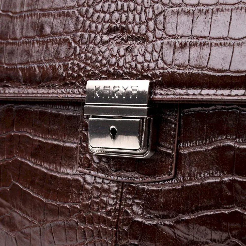 Практичний портфель з натуральної шкіри з тисненням під крокодила, коричневого кольору. Зручна та багатофункціональна модель, клямка закривається на ключик Модель доповнена фурнітурою кольору срібла плюс гумові ніжки для захисту зовнішнього дна сумки. Усередині сумки якісна підкладка. Сумку можна переносити в руці за допомогою зручної шкіряної ручки, а також через плече (у комплекті не знімний, регульований плечовий ремінь, який виконаний у комбінації текстильного матеріалу та натуральної шкіри). Буде ідеальним варіантом для подарунка близькій людині.