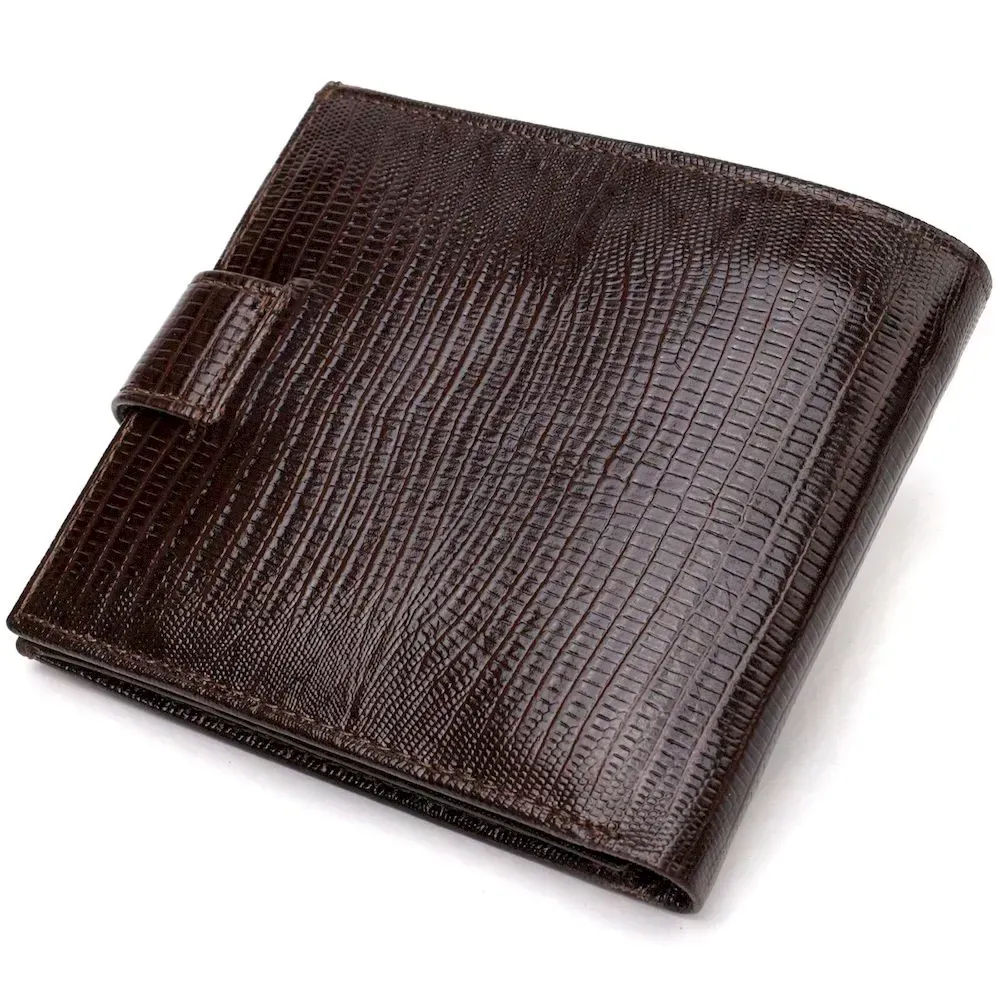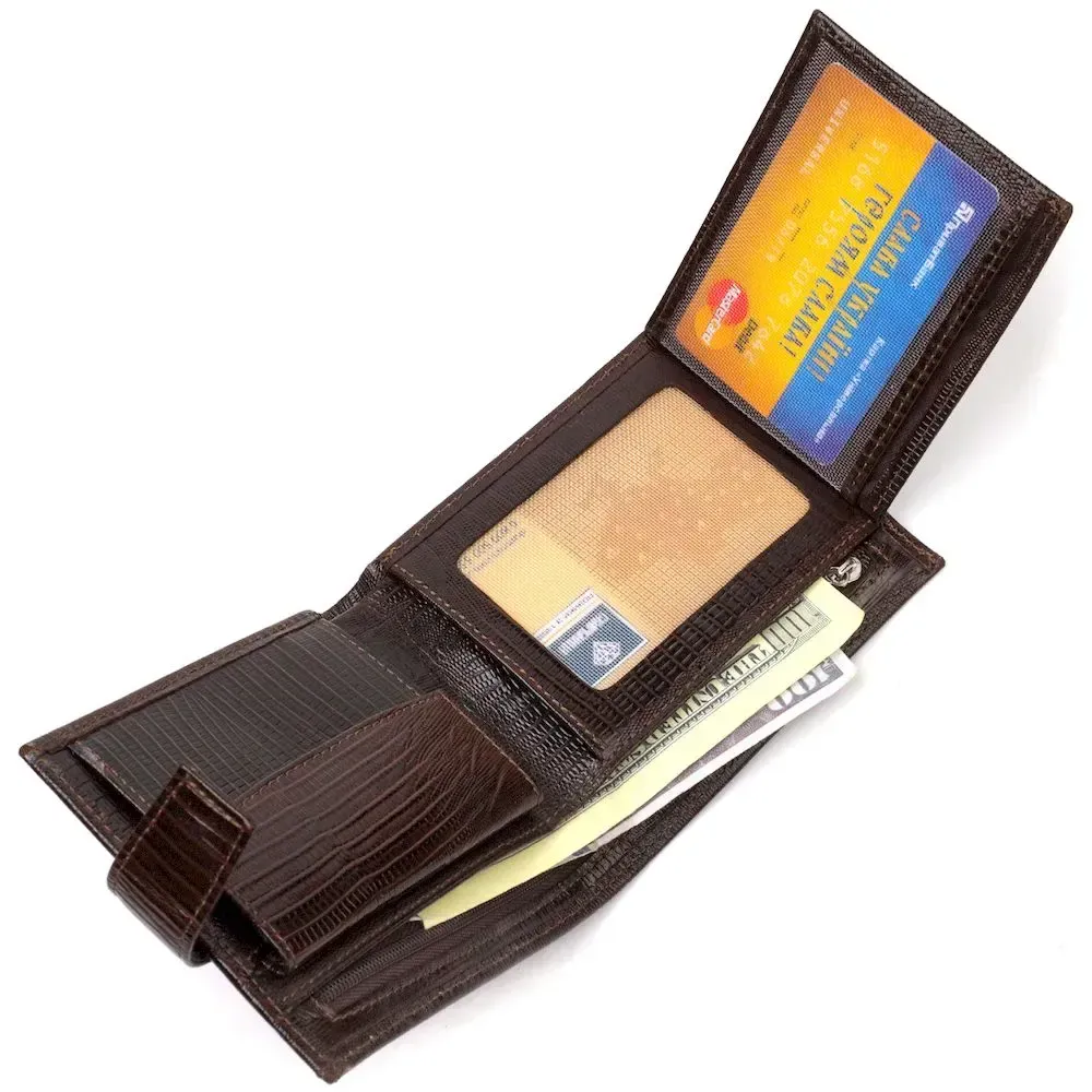 Місткий чоловічий гаманець з натуральної фактурної шкіри . Аксесуар має основне відділення для купюр, три осередки для карток, дві кишені під сіточкою, кишеню на блискавці через усю довжину та монетницю, що закривається клапаном на кнопку. Гаманець складається навпіл і закривається хлястиком на кнопку. На лицьовій стороні в правому нижньому кутку розташований металевий логотип компанії виробника. Багатофункціональний чоловічий гаманець з дуже міцної шкіри чудовий вибір подарунка для солідного чоловіка.