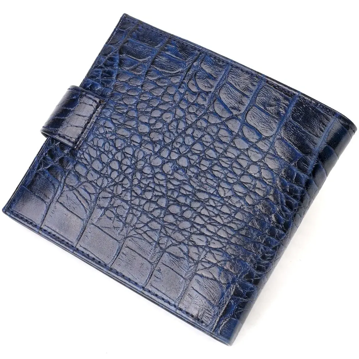 Стильний чоловічий гаманець із натуральної фактурної шкіри з тиснення під крокодила. Аксесуар має основне відділення для купюр, три осередки для карток, дві кишені під сіточкою, кишеню на блискавці через усю довжину та монетницю, що закривається клапаном на кнопку. Гаманець складається навпіл і закривається хлястиком на кнопку. На лицьовій стороні в правому нижньому кутку розташований металевий логотип компанії виробника. Багатофункціональний чоловічий гаманець з дуже міцної шкіри чудовий вибір подарунка для солідного чоловіка.