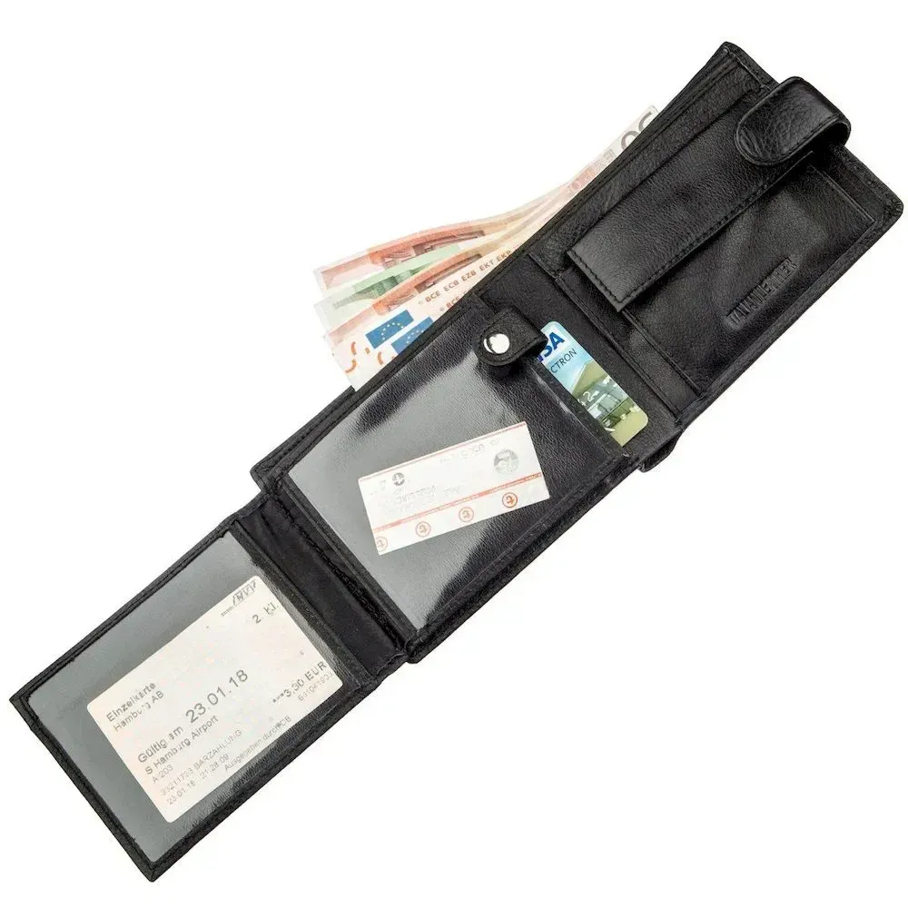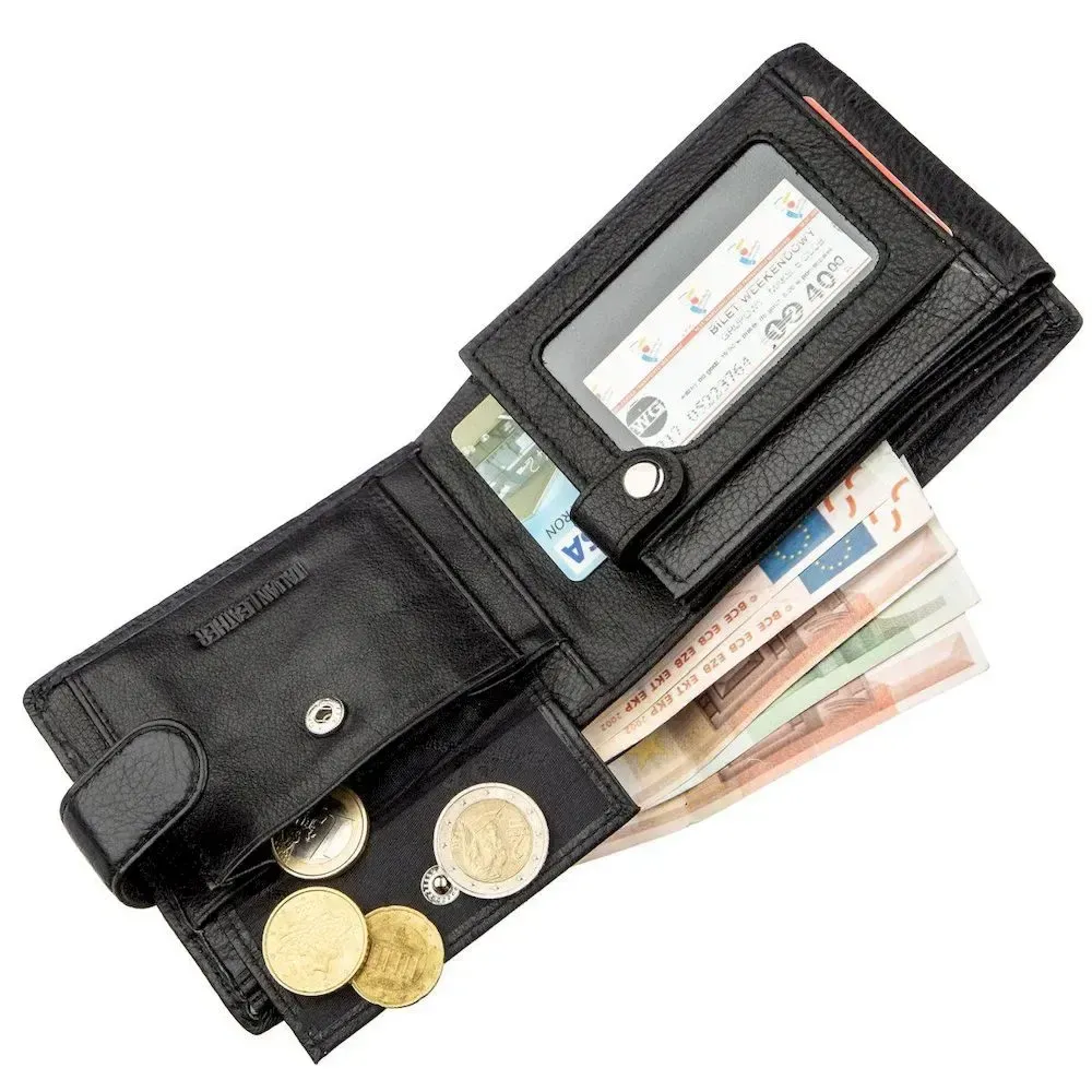 Універсальний гаманець для чоловіків із натуральної високоякісної шкіри на кнопці. Виконаний у чорному аристократичному кольорі, що дуже практично та зручно. У гаманці є достатня кількість відділень та кишень для різних цінностей, у тому числі монетниця на кнопці. Розміри виробу дозволяють носити його як у кишені, так і в сумці чи борсетці. Гаманець має діловий та стриманий дизайн та підійде для чоловіків різного соціального статусу. Цей аксесуар стане чудовим придбанням для Вас особисто або чудовим презентом для коханої людини. Упаковка гаманця представлена у вигляді картонної коробки з фірмовим логотипом білого кольору.