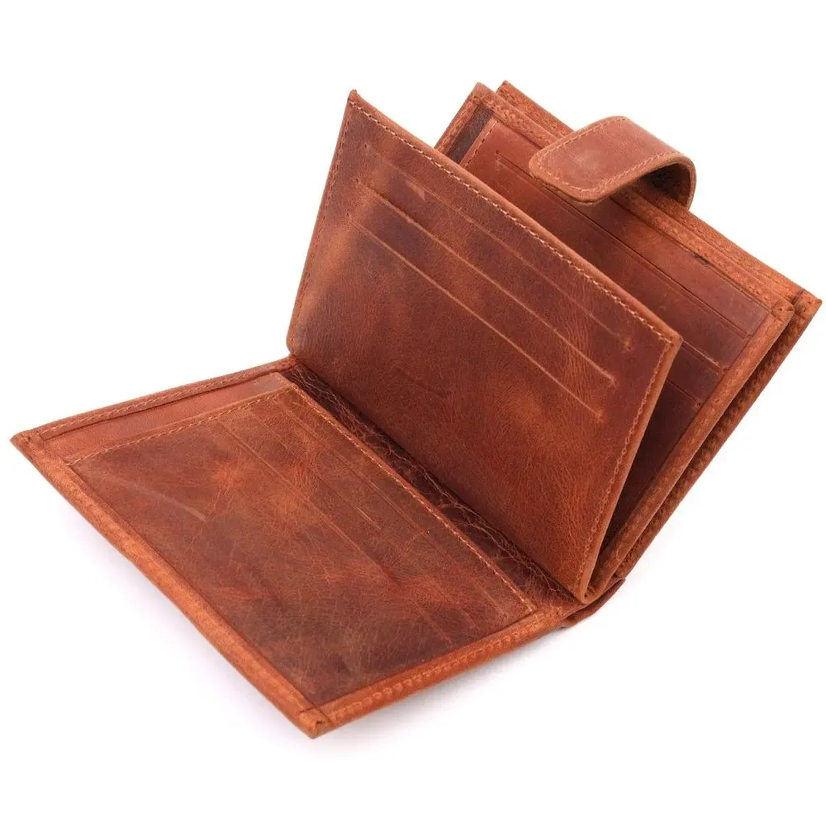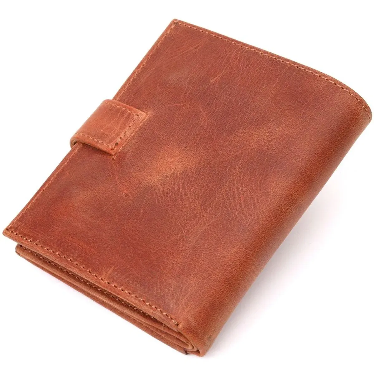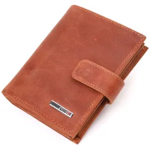 Чудовий чоловічий гаманець з натуральної вінтажної шкіри, що закривається хлястиком на кнопку. Виріб має велику кишеню для купюр. Усередині достатньо осередків для кредиток. Виріб продуманий для сучасної людини. Виріб має незвичайний рудий колір. Оригінальний аксесуар вигідно виділить вас із натовпу. Гаманець стане чудовим подарунком для Ваших близьких.