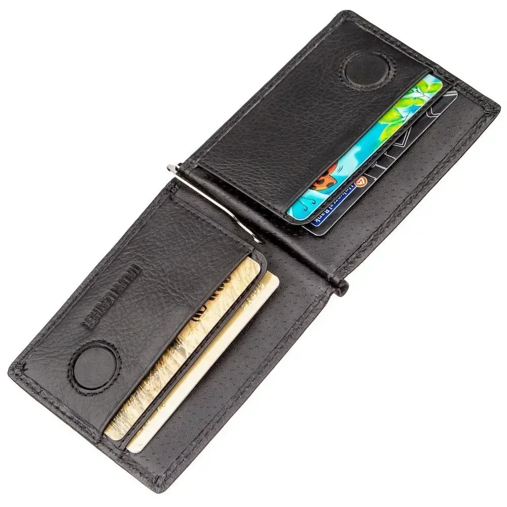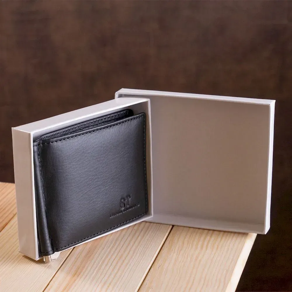 Відмінний затиск для грошей для чоловіків, які не звикли носити з собою громіздкі та незручні гаманці. Так, як цей аксесуар завдяки своїм компактним розмірам поміститься не тільки в сумку будь-яких розмірів, а й навіть у кишеню. Виготовлений затискач з натуральної шкіри з відмінними експлуатаційними властивостями та має найпрактичніший та універсальний колір – ndash; чорний. Сама шкіра на дотик м'яка та зерниста. Такий аксесуар може стати приємною покупкою не тільки для Вас, а й чудовим подарунком Вашій близькій людині. Запакований виріб у щільну картонну коробку білого кольору.