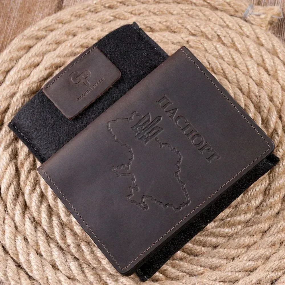 Обкладинка з вінтажної шкіри для захисту з якісної італійської шкіри з патріотичним тисненням картки України. Особливістю шкіряної обкладинки є те, що вона надійно захищає документ від пошкоджень та має довгий термін служби. Виріб без застібки, упакований у фірмовий чохол із фетру. Шкіряна обкладинка на паспорт стане чудовим подарунком на будь-яке свято.