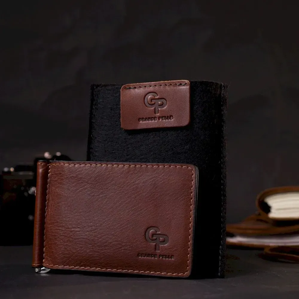 Стильний шкіряний затискач ручної роботи з натуральної висококласної шкіри. На лицьовій стороні виріб має тиснений логотип виробника Grande Pelle. Аксесуар складається з шести відділень під картки та металевого якісного затиску. Відмінний аксесуар для сучасної людини.