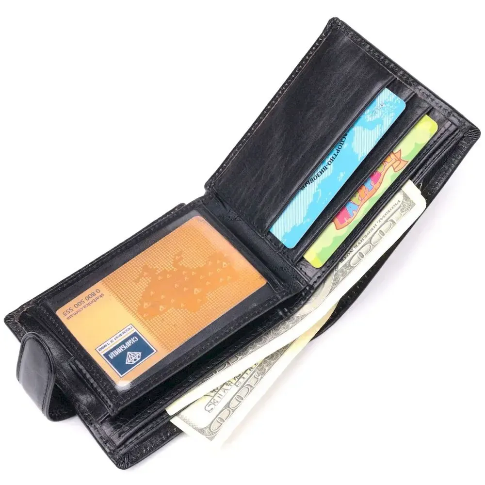 Стильний чоловічий гаманець у два складення з натуральної гладкої шкіри. Для перегородки між відділеннями використовується натуральна шкіра та міцний текстиль. Виріб складається з трьох великих відділень для купюр, двох прилеглих кишень, двох прозорих відділень, трьох осередків для карток та монетниці на кнопці. Продається гаманець у гарній коробці від виробника. Закривається гаманець хлястиком на кнопку.