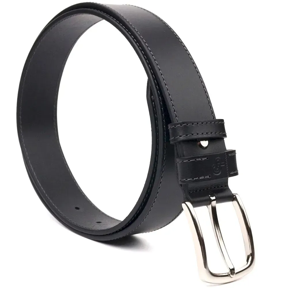 Якісний шкіряний ремінь чорного кольору з натуральної шкіри від українського виробника. Хороший ремінь здатний ідеально завершити образ та підкреслити ваш статус. Ремінь виготовлений із цілісного полотна шкіри. Аксесуар має гладку фактуру, акуратно пошитий, довжина регулюється у менший бік. Доповнено ремінець сріблястою пряжкою із закругленими кутами. Шкіряний ремінь один із найвдаліших і потрібних подарунків для будь-якого чоловіка.