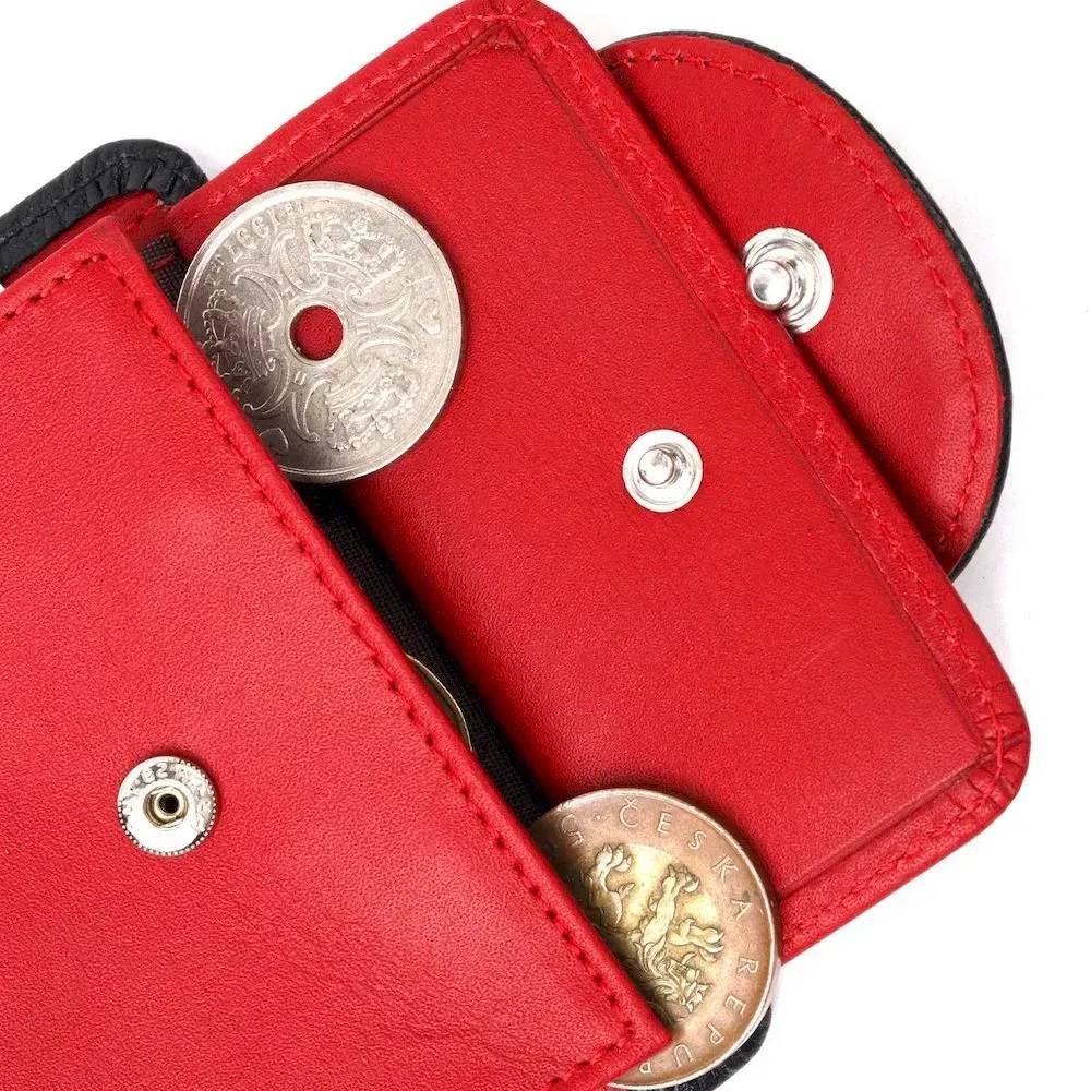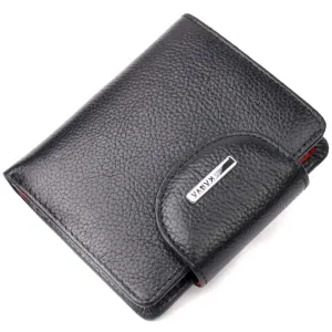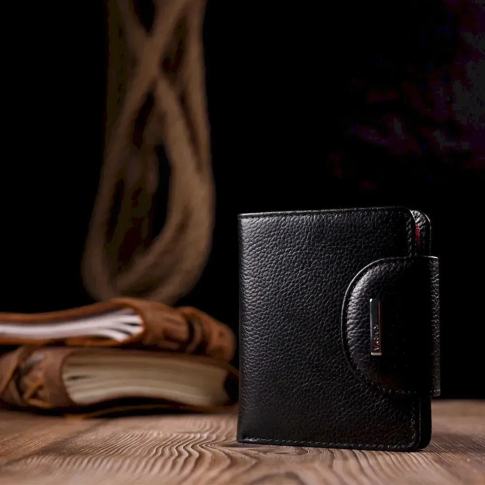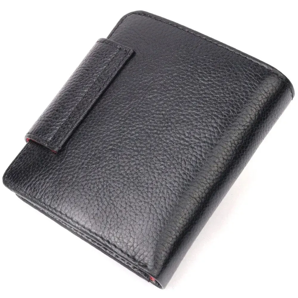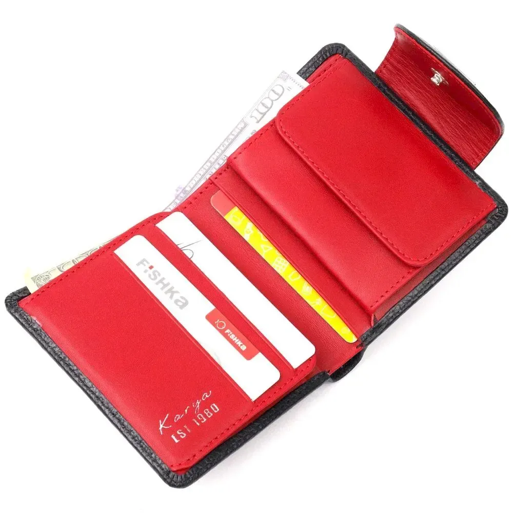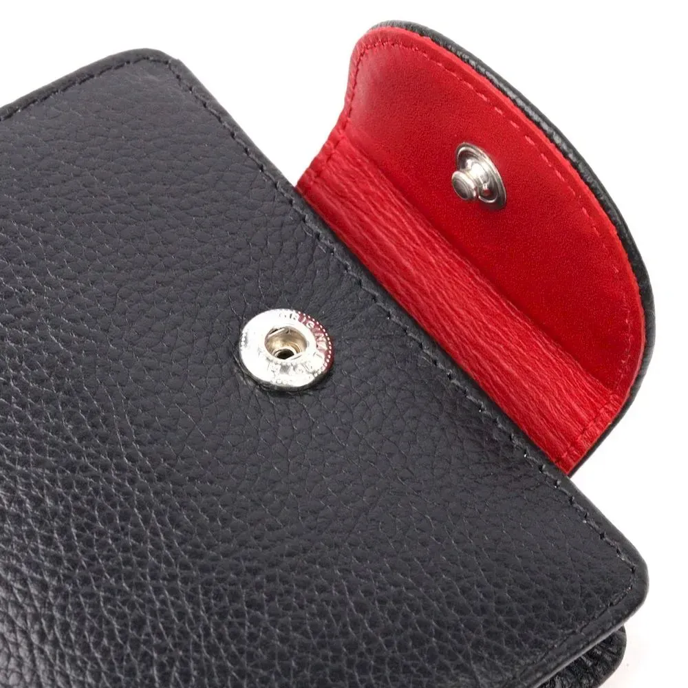 Класичний жіночий гаманець з натуральної шкіри чорний зовні та червоний всередині. Складається аксесуар навпіл, закривається клапаном на кнопку. Якісна фурнітура доповнює та прикрашає виріб. Такий гаманець з натуральної шкіри - це ідеальний варіант на кожен день для тих, хто цінує якість, зручність та комфорт, а також чудово доповнюватиме Ваш повсякденний образ. Запакований аксесуар у фірмову коробку та пакет бренду. Вироби з натуральної шкіри завжди будуть чудовим подарунком для близької людини.