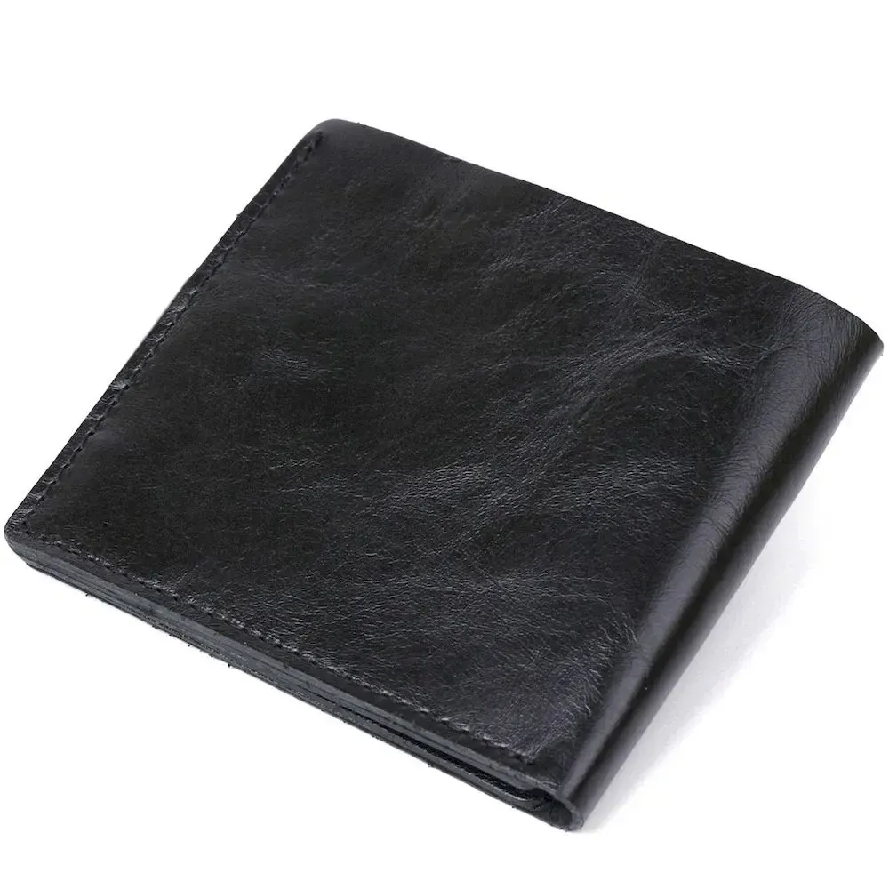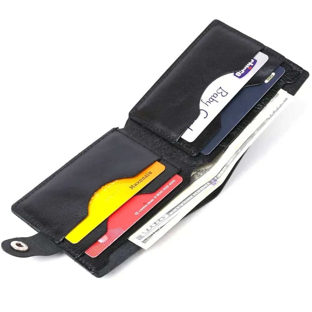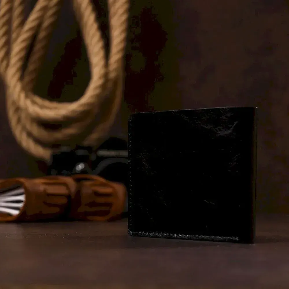 Компактне портмоне для чоловіків будь-якого віку та статусу, яке з легкістю поміститься у будь-яку сумку чи кишеню. Виготовлено воно з натуральної висококласної шкіри з відмінними експлуатаційними характеристиками. Усередині є відділення для купюр на всю довжину та слоти для пластикових карток. Колір аксесуара – універсальний чорний із легким блиском.