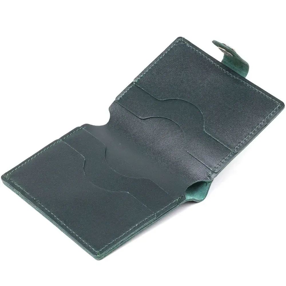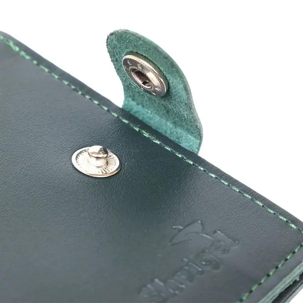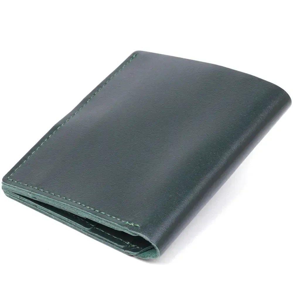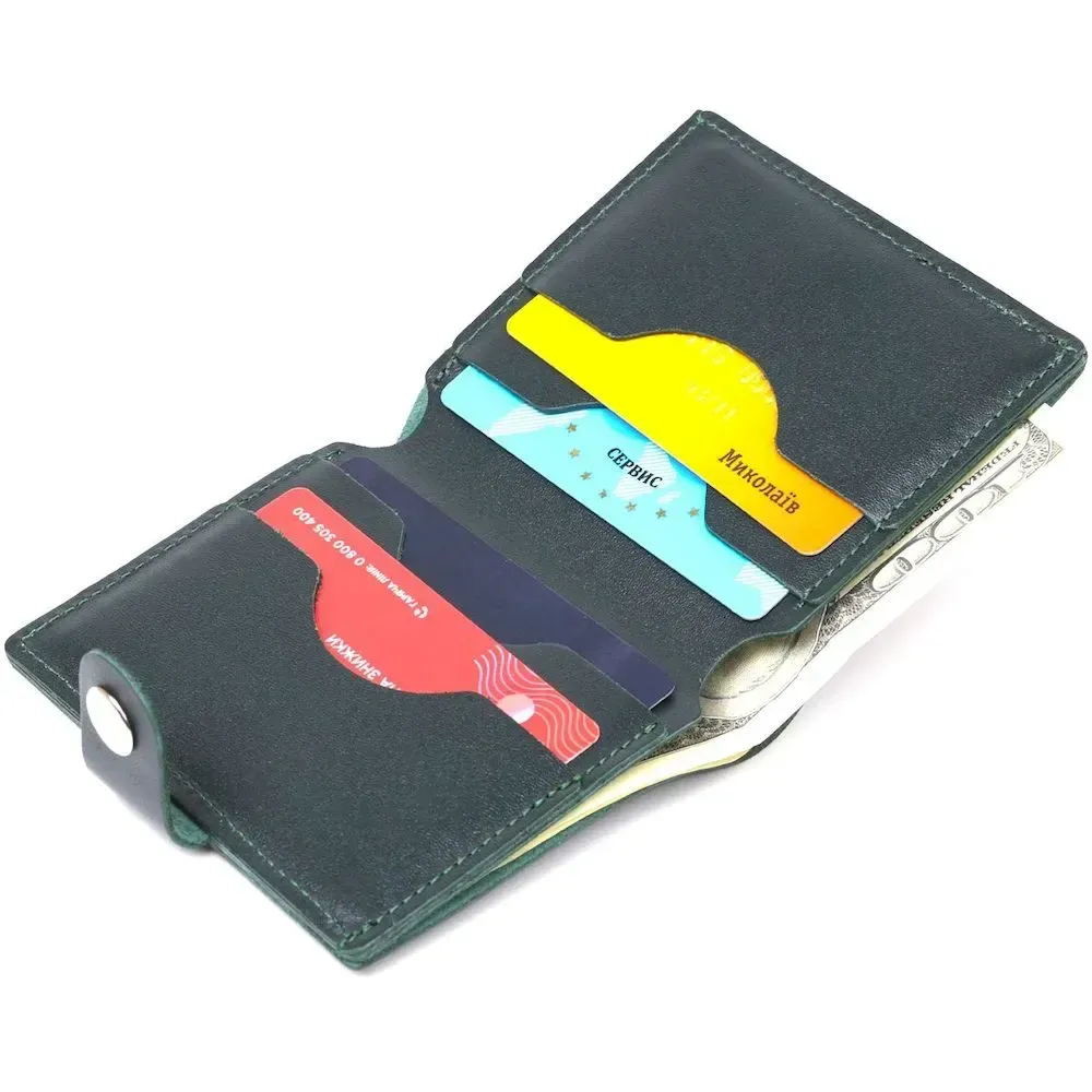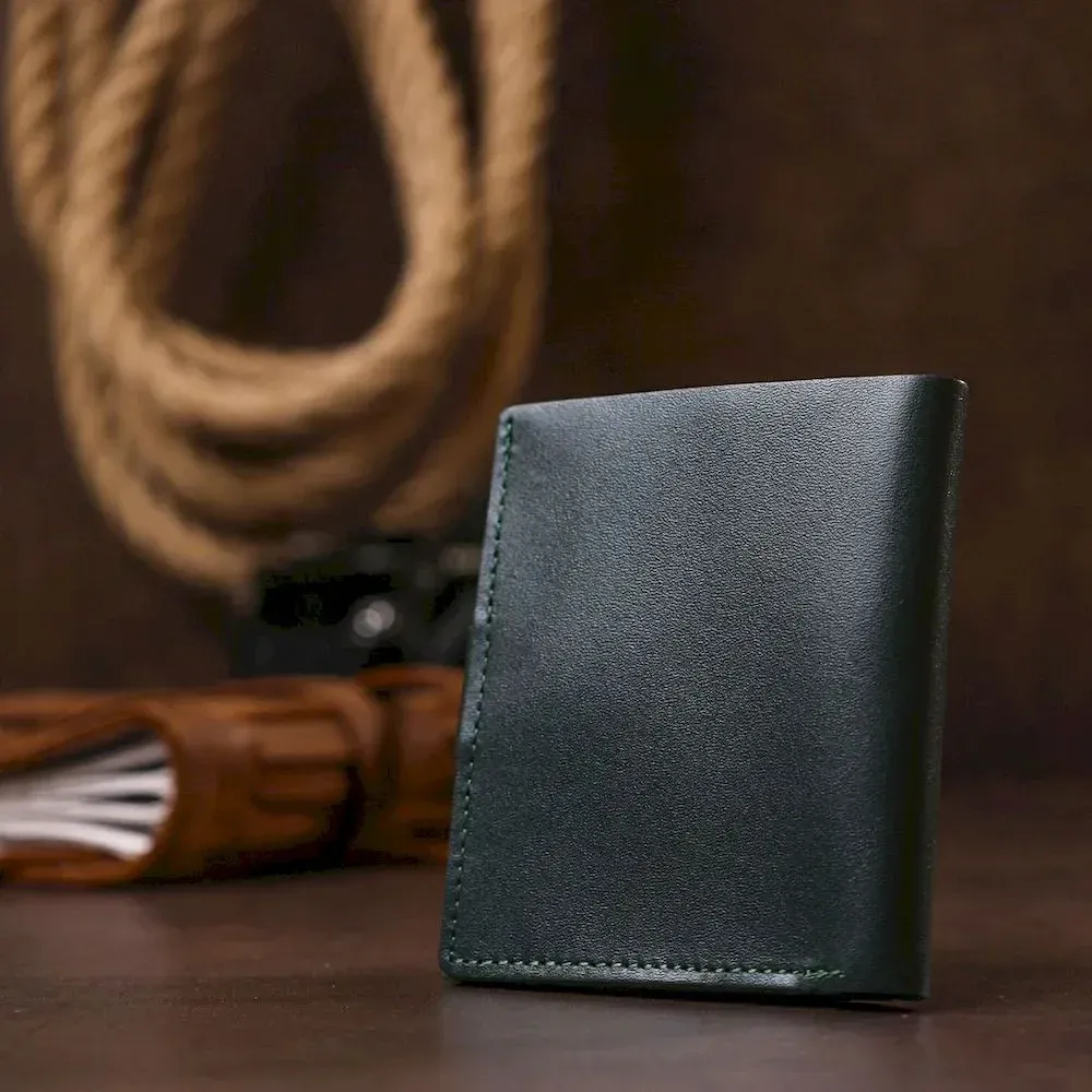 Невелике, але містке портмоне , що легко поміститься в сумку, рюкзак або кишеню. Виготовлено воно із натуральної шкіри високої якості з відмінними показниками стійкості до зношування. Внутрішнє наповнення вас порадує містким відділенням для купюр на всю довжину та слотами для пластикових карток. Колір аксесуара – темно-зелений, фактура – гладка.