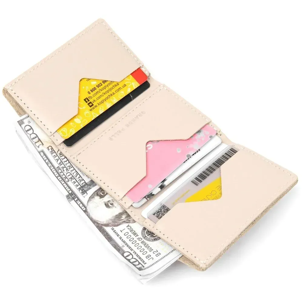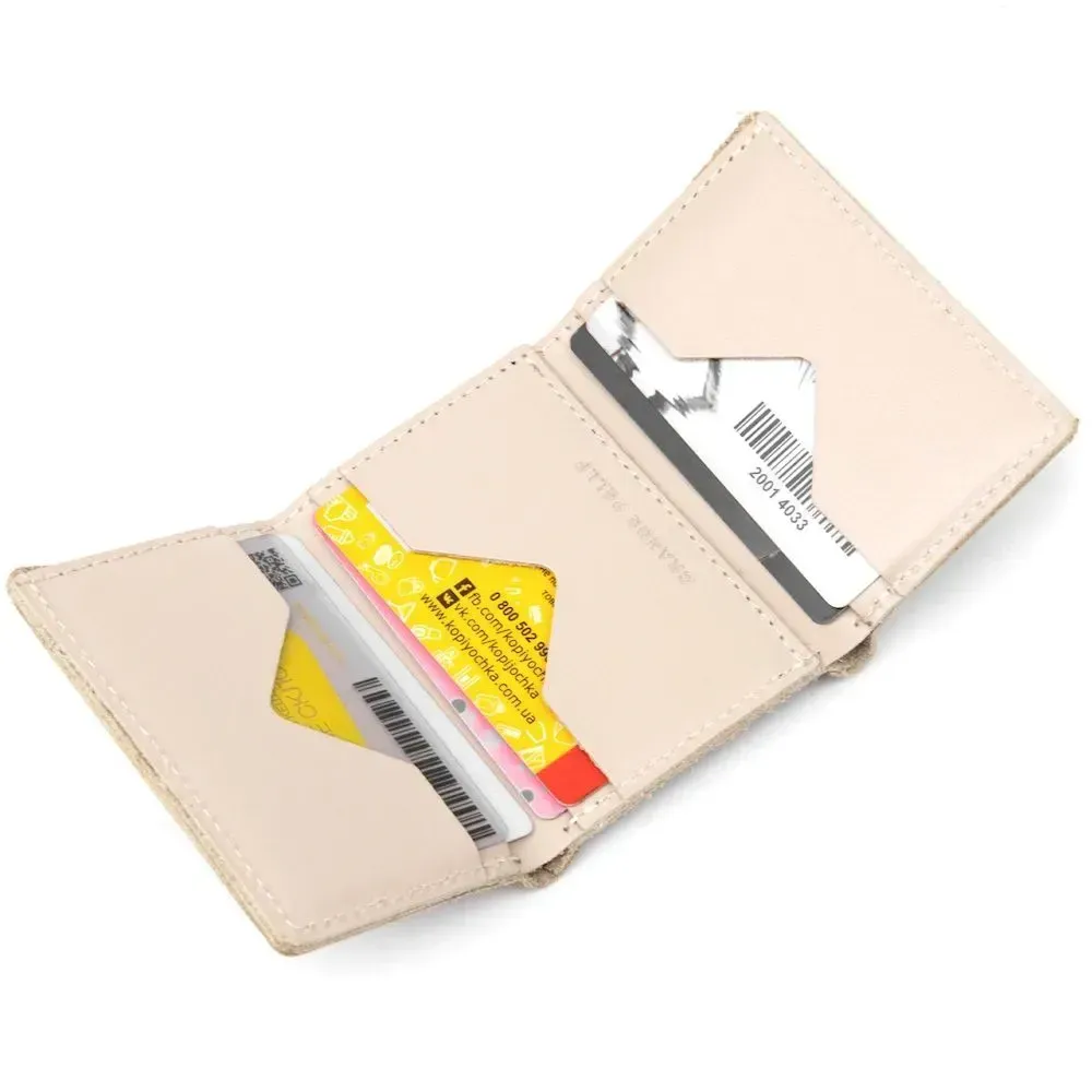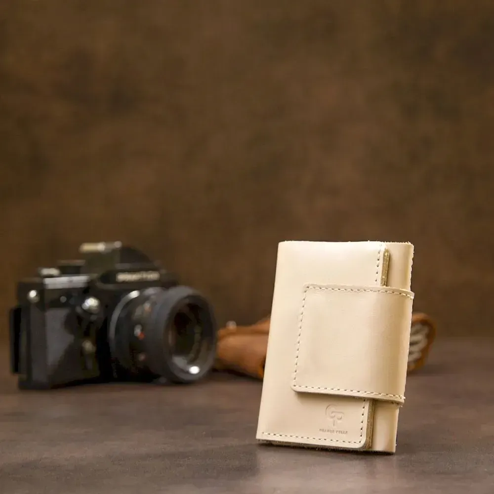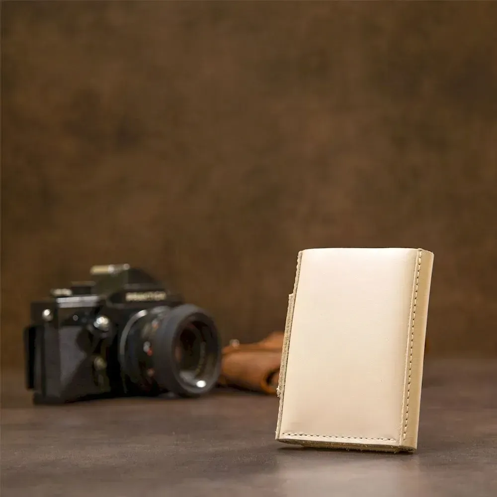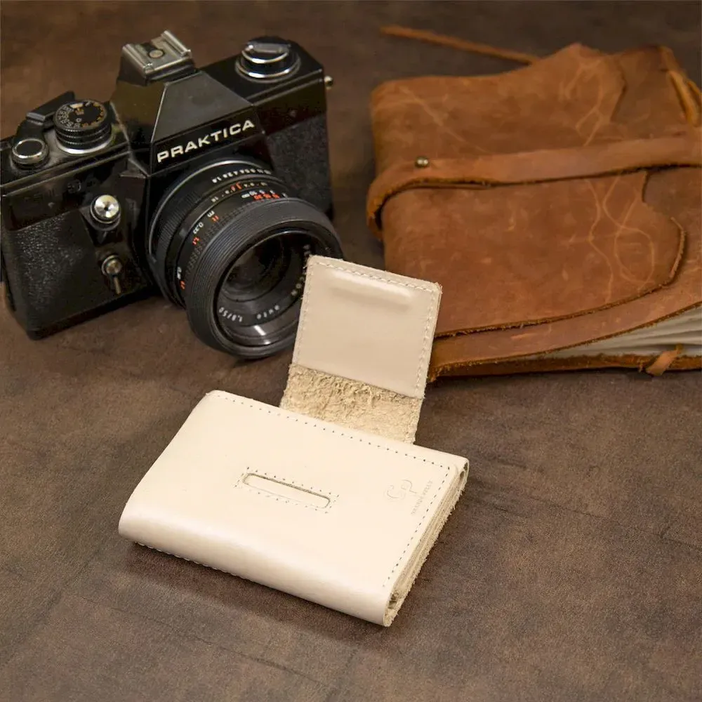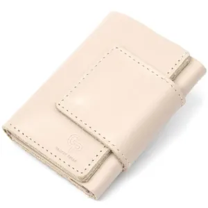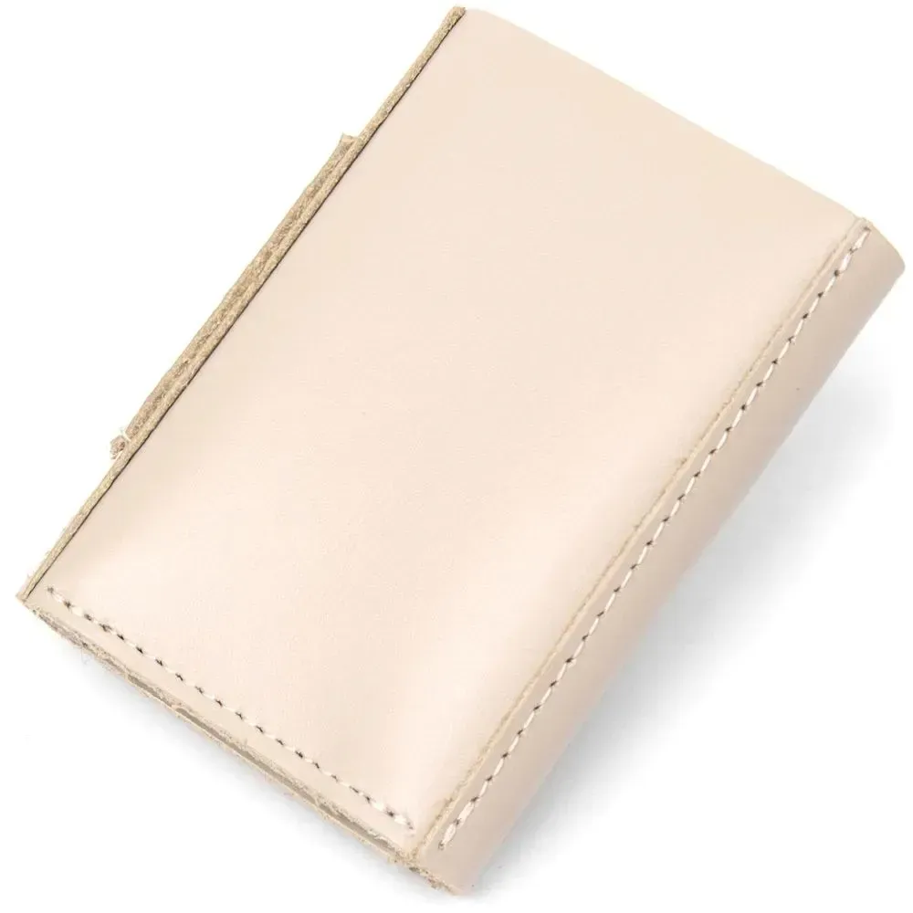 Невелике, але оригінальне портмоне з натуральної шкіри, яке підійде як для жінок, так чоловіків. Завдяки своїм розмірам легко поміститься у сумці чи кишені. Має красивий бежевий колір з молочним відтінком, шкіра гладка і приємна на дотик. Упаковка представлена у вигляді фірмового чохла.