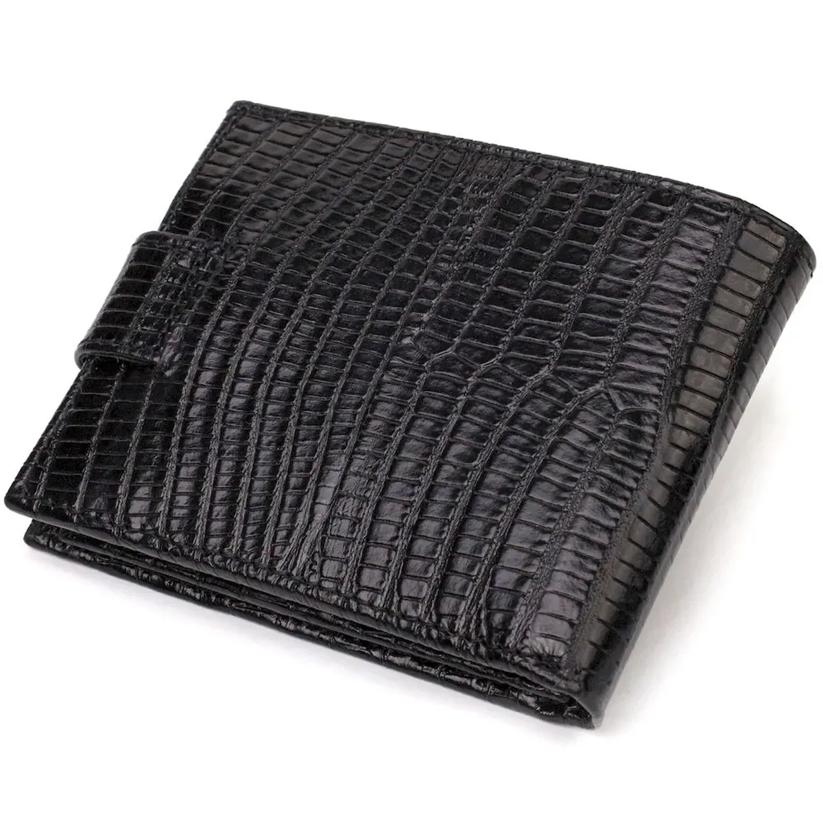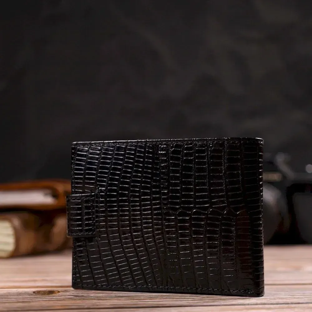 Оригінальний чоловічий гаманець, з натуральної фактурної шкіри з тисненням. Аксесуар має одне основне відділення з перегородкою, в яке поміщаються купюри всіх номіналів, дев'ять кишень для карток, дві з яких під сіточкою, монетниця та дві прилеглі кишені. Закривається аксесуар хлястиком на кнопку. Колір фурнітури – срібло. Ви легко зможете помістити його в кишеню штанів чи маленьку сумку. Запакований гаманець картонну коробку. Шкіряний гаманець є чудовим подарунком для рідних та близьких людей.