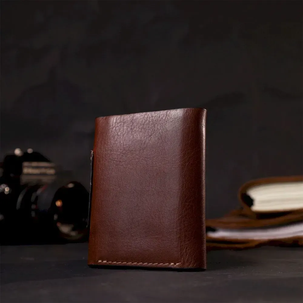 Оригінальний чоловічий гаманець з італійської гладкої шкіри найвищої якості в красивому коричневому кольорі. Сучасний дизайн, елітна шкіра, якісна фурнітура – все це підкреслює справді якісну річ. Всередині портмоне виконаний також з натуральної шкіри, без тканинної підкладки. Аксесуар підкреслить вашу індивідуальність та відмінний смак. Впевнені, що такий подарунок оцінить будь-який чоловік. Запакований гаманець у фірмовий чохол.