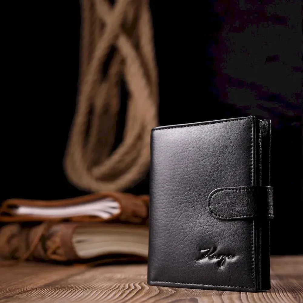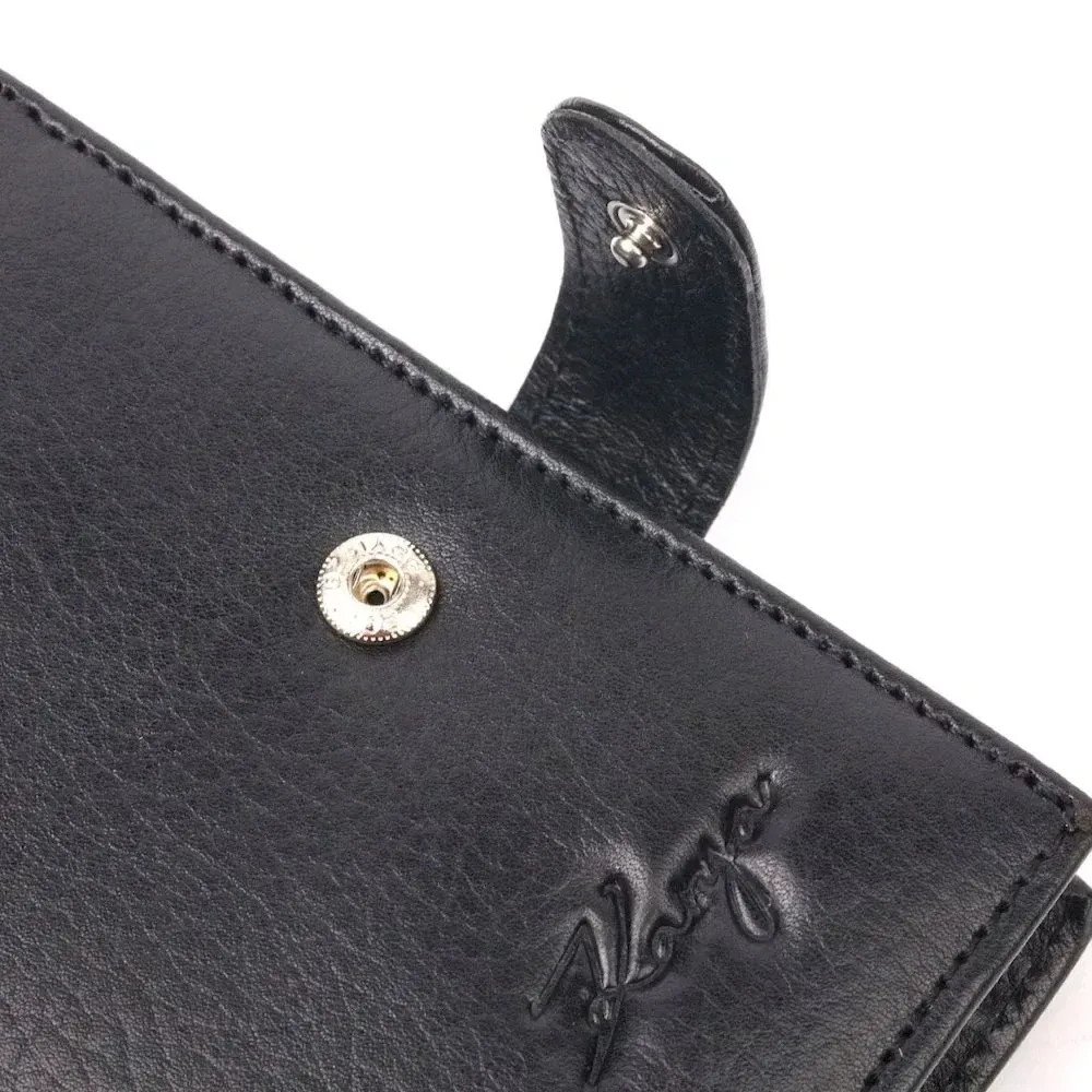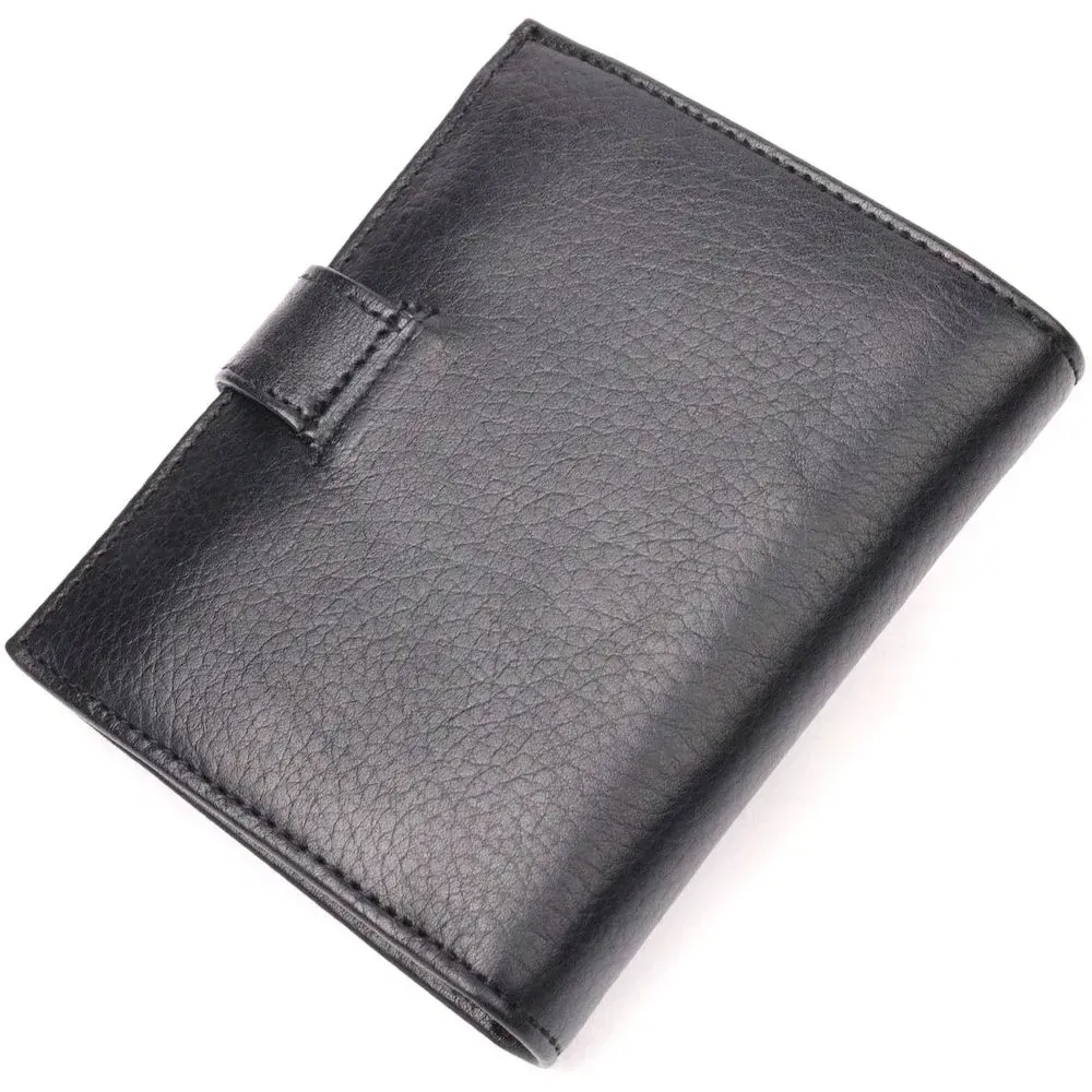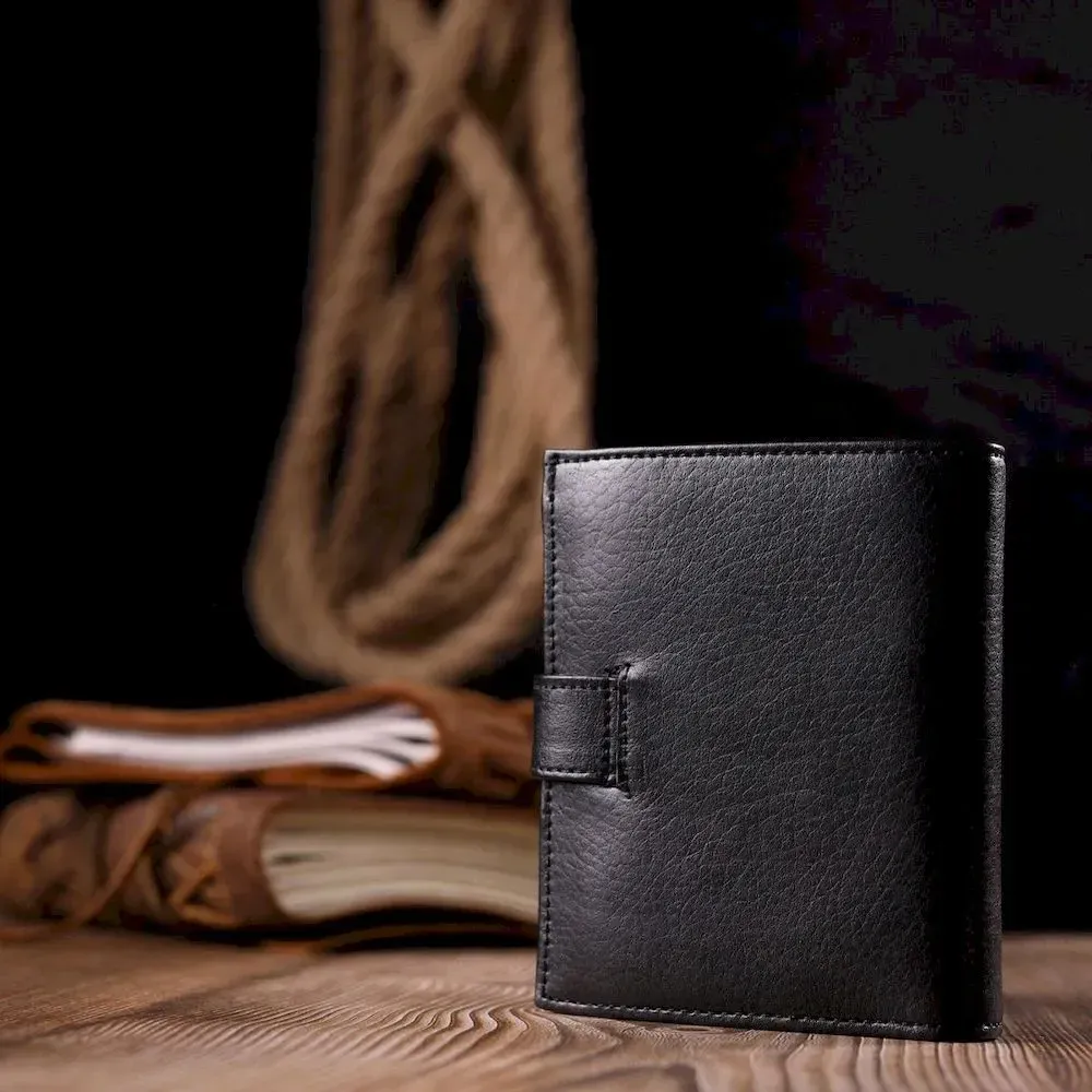 Невеликий чоловічий гаманець із якісної натуральної шкіри в класичному чорному кольорі. Особливістю цього аксесуара є наявність блоку для кредитних карток, що закривається хлястиком на кнопку . Виріб закривається на хлястик із кнопкою . На лицьовій стороні у вигляді декору розташований металевий логотип виробника. Аксесуар упакований у фірмову коробочку. Вироби з натуральної шкіри завжди будуть чудовим подарунком для близької людини.