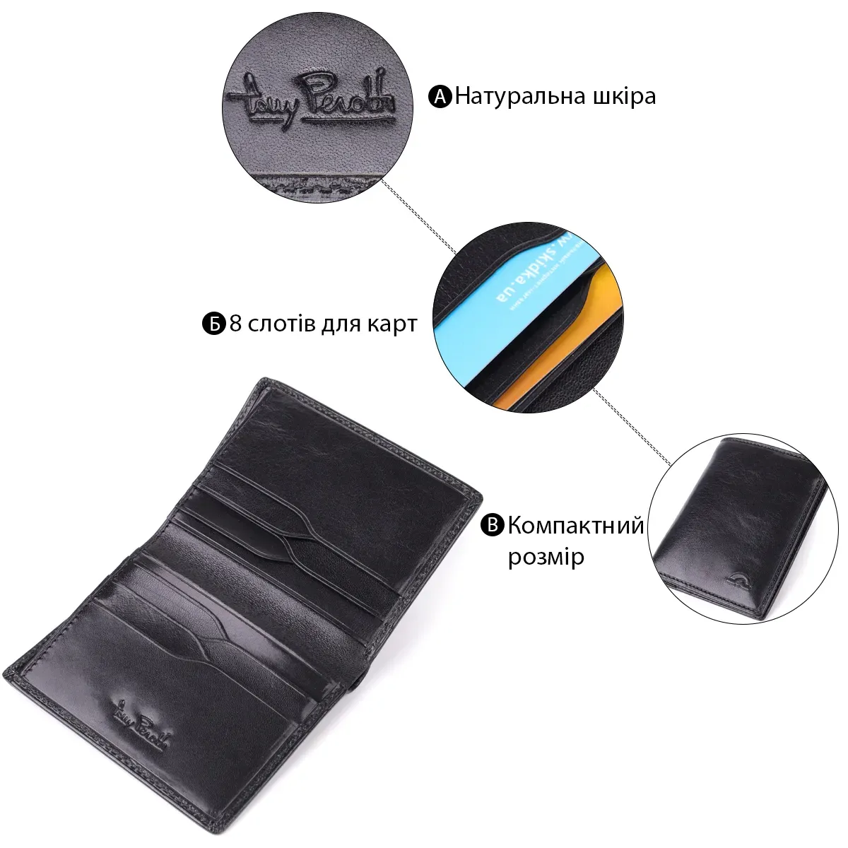 - 8 слотів для банківських та дисконтних карток;