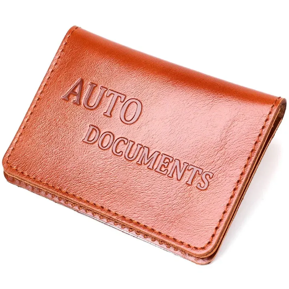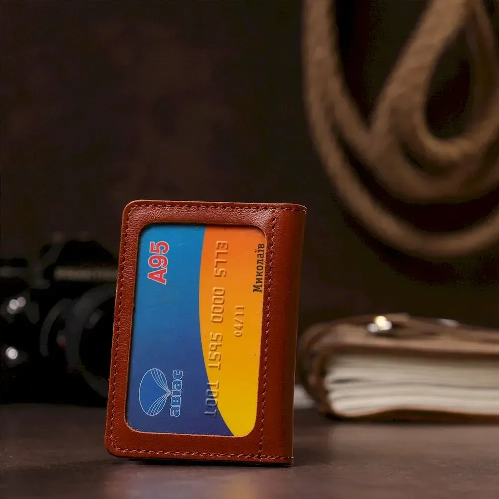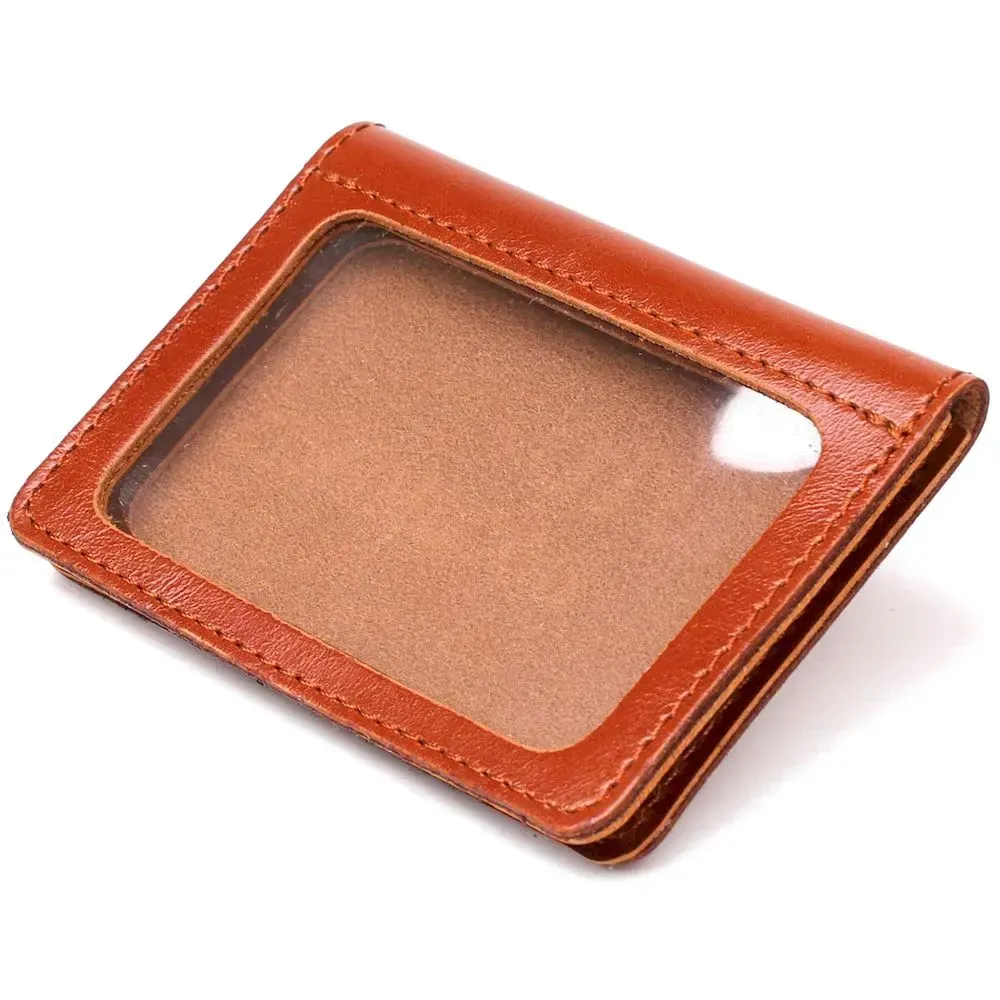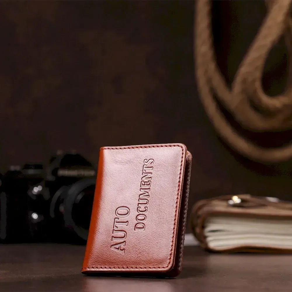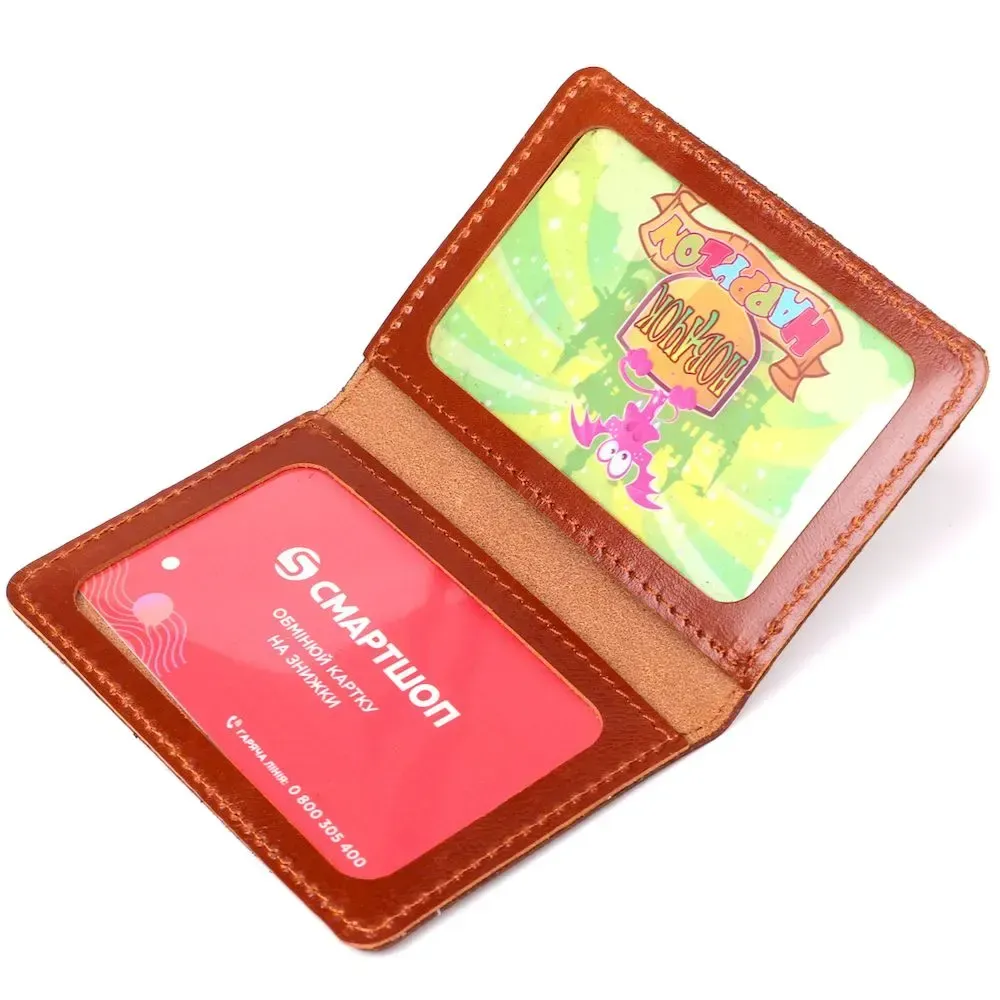 Чудова та стильна обкладинка для посвідчень, світло-коричневого кольору, виготовлена із високоякісної натуральної шкіри. Складається виріб із трьох прозорих відділень для документів.