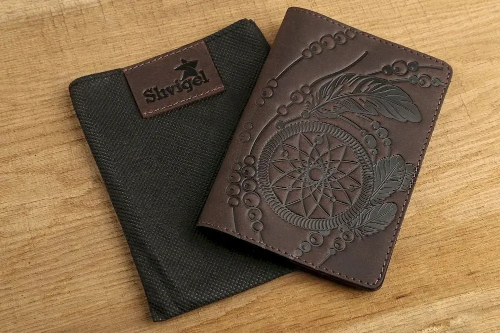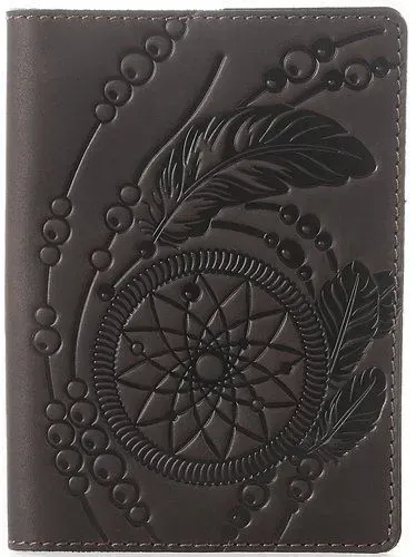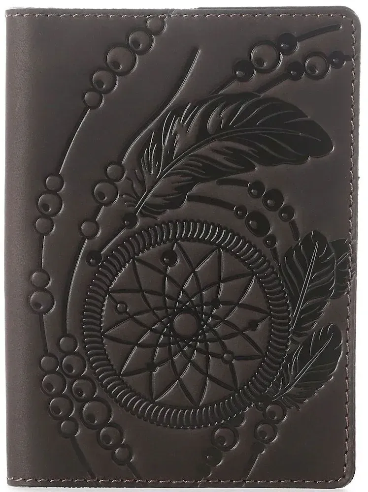 Чудова шкіряна обкладинка з дизайнерським тісненням Ловця Снов (dreamcatcher) на лицьовій стороні. Цей індіанський амулет символізує захист сплячої людини від злих духів і пропускає лише гарні сни, тоді як погані заплутуються в павутинні. Ця обкладинка на паспорт упакована в гарний, фірмовий текстильний мішечок.