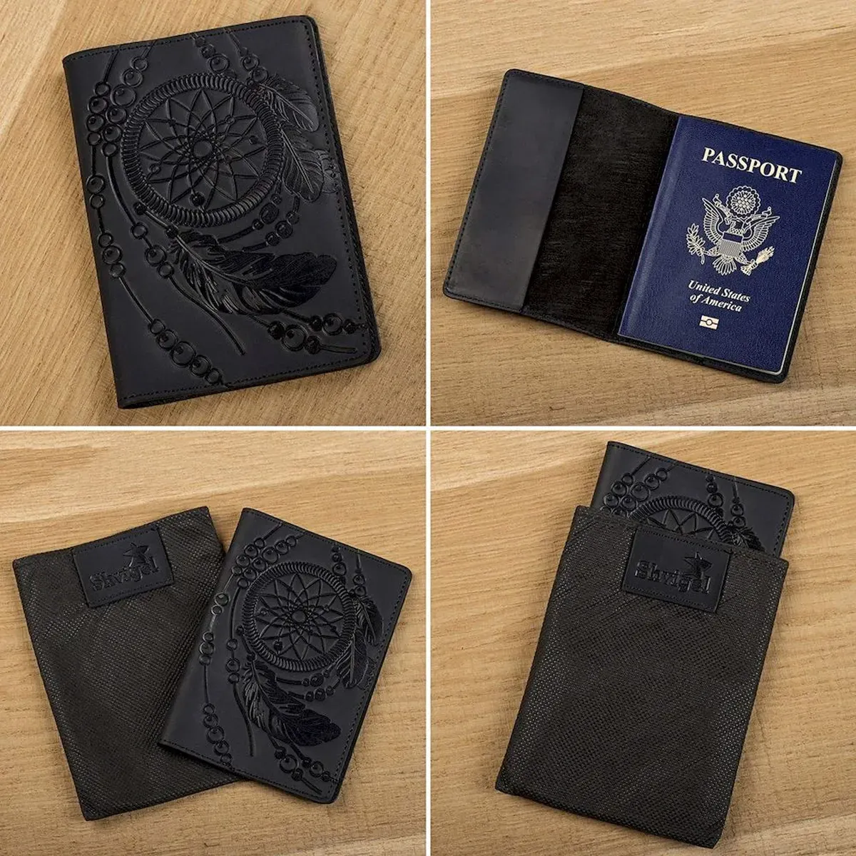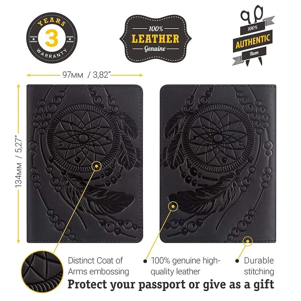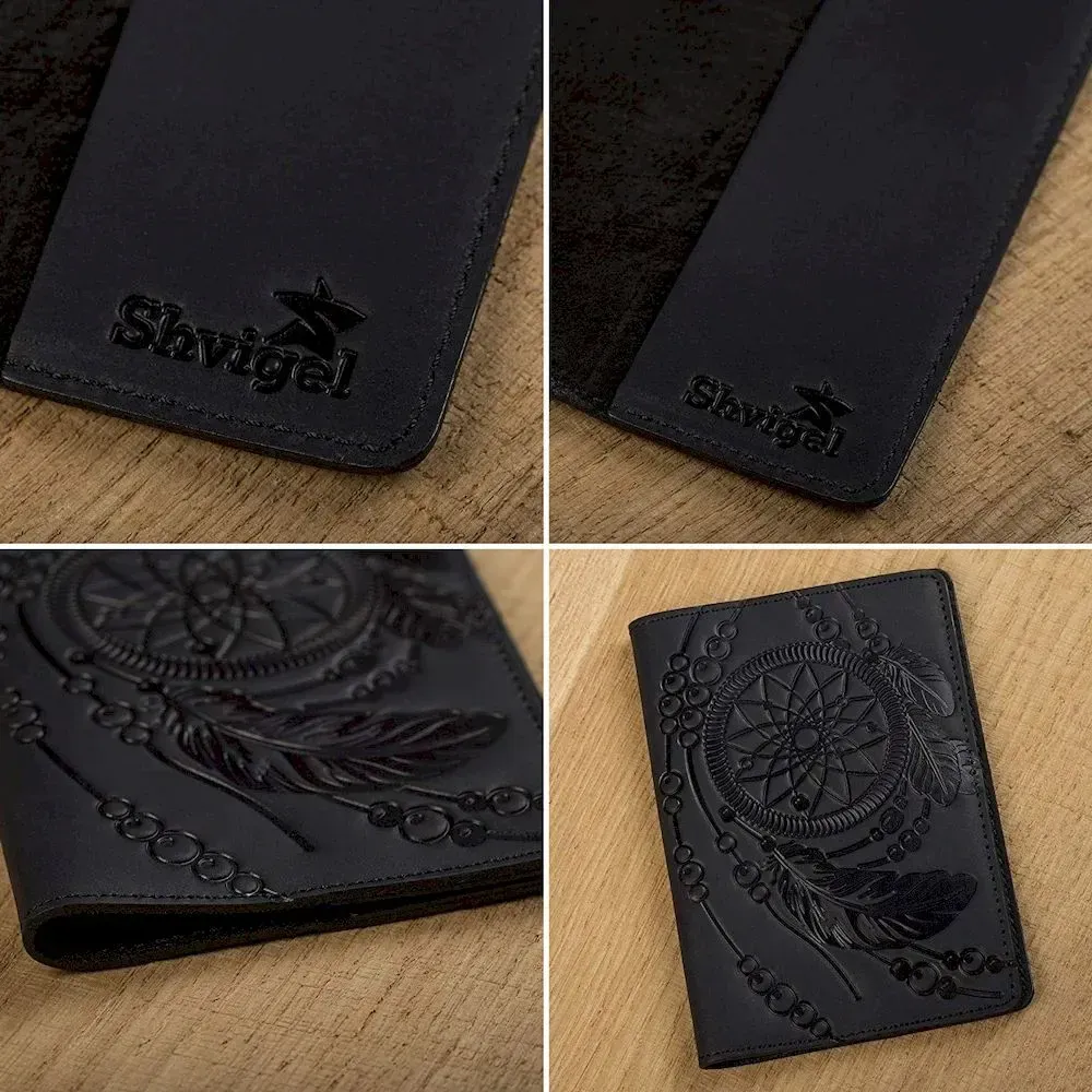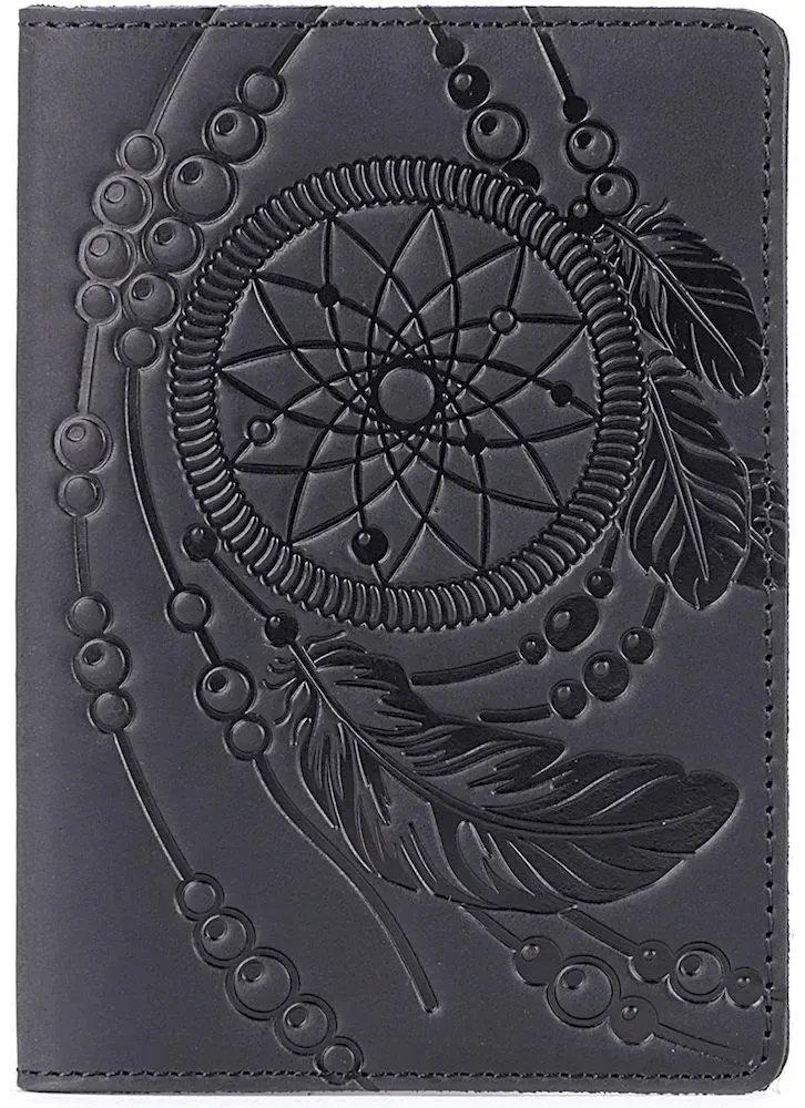 Дизайнерська обкладинка на паспорт із натуральної шкіри. Малюнок на лицьовій стороні виробу зроблений в стилі індійського талісмана Ловця Снов (dreamcatcher). Усередині обкладинки Ви знайдете тісний логотип компанії-виробника SHVIGEL. Обкладинка на паспорт поставляється у фірмовому текстильному мішечку.
