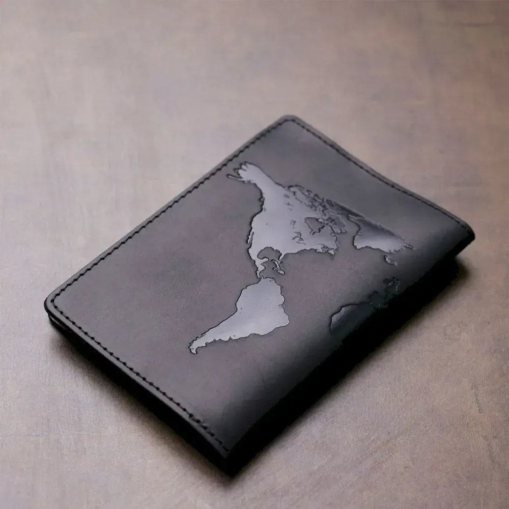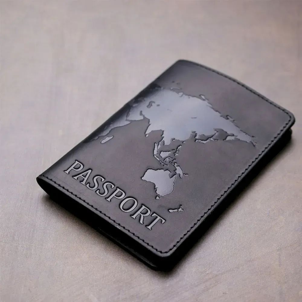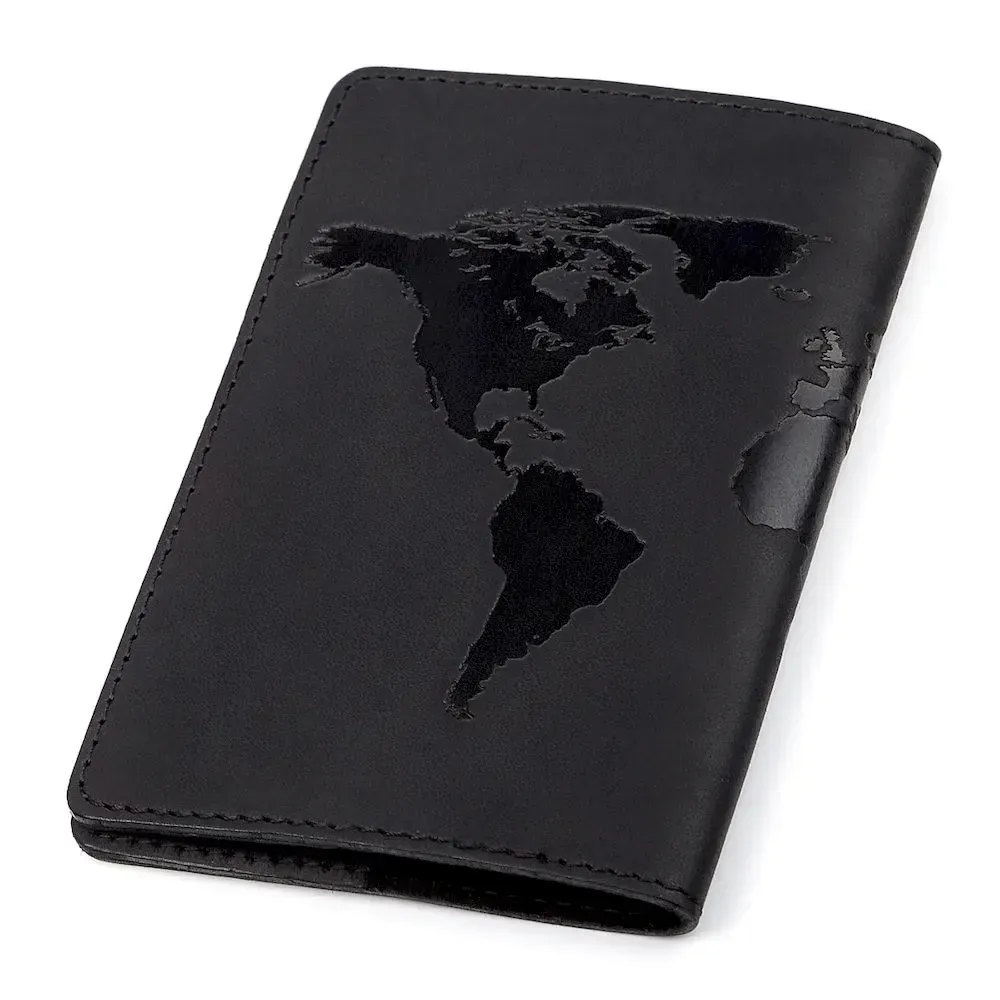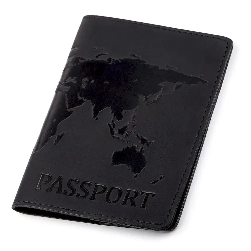 Зручна та стильна обкладинка на паспорт, чорного кольору із зображенням карти світу, виготовлена з високоякісної натуральної шкіри. Сучасний висококласний аксесуар, який стане незабутнім подарунком для Ваших коханих та близьких.