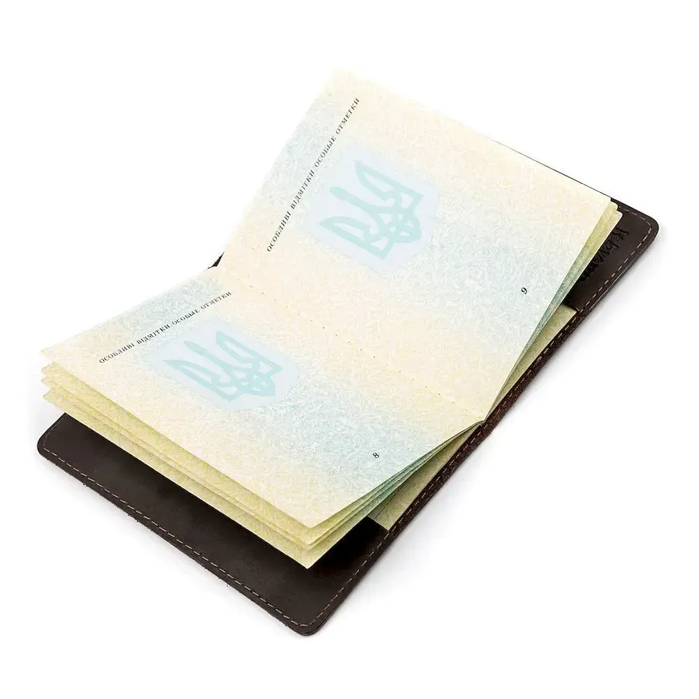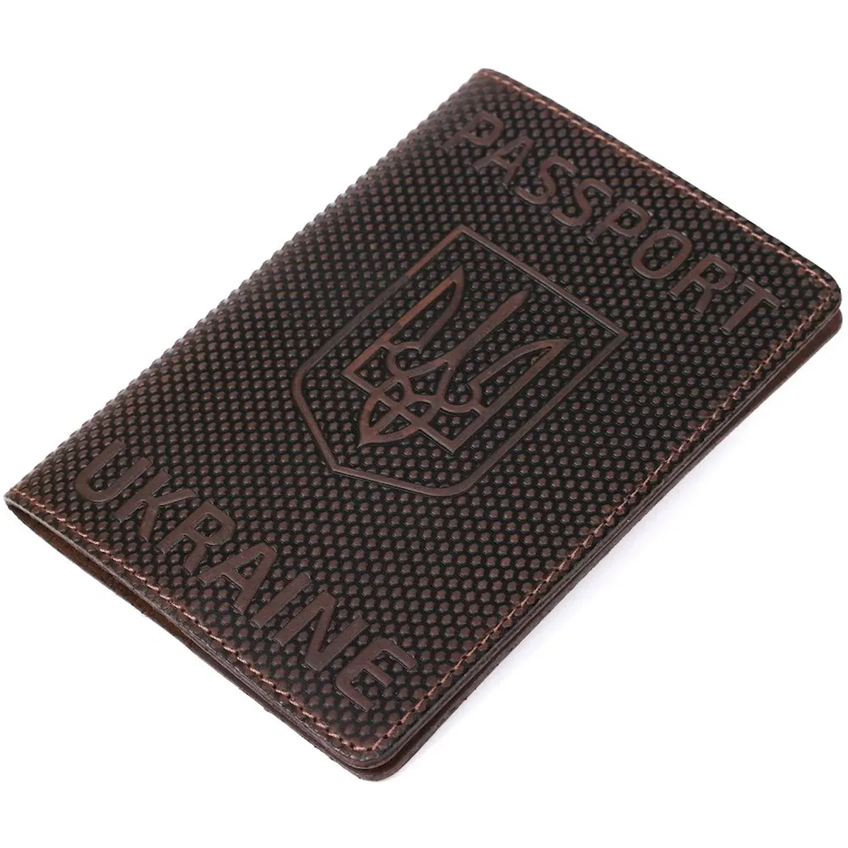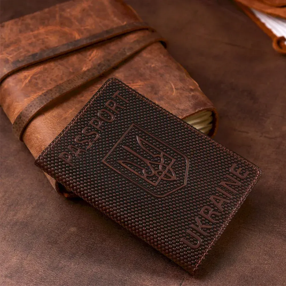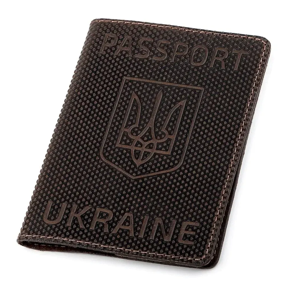 Надійна обкладинка на паспорт, коричневого кольору з тризубом і точковим тисненням, виготовлена з високоякісної натуральної шкіри. Сучасний висококласний аксесуар, який стане незабутнім подарунком для Ваших коханих та близьких.