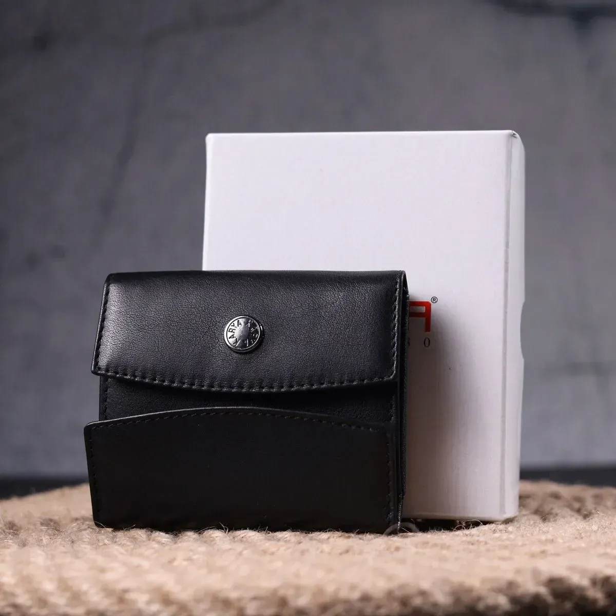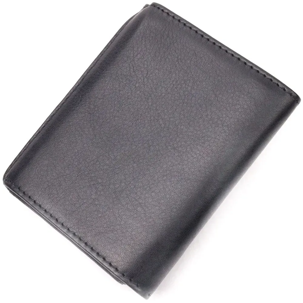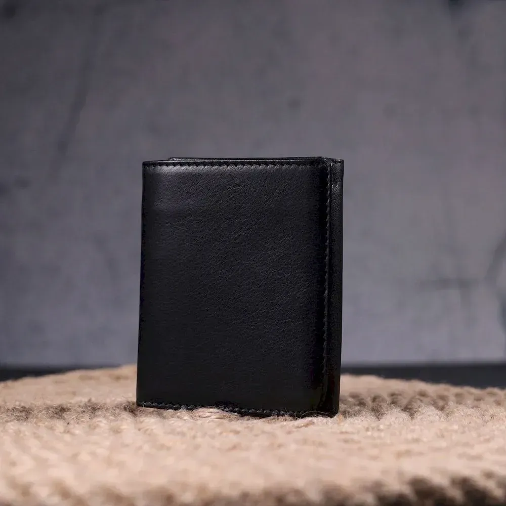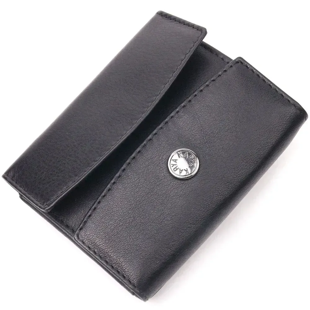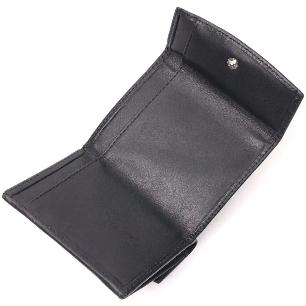 Невеликий але продуманий жіночий гаманець з натуральної шкіри, в класичному чорному кольорі. Складається аксесуар у три додавання і закривається клапаном на кнопку. Такий гаманець з натуральної шкіри - це ідеальний варіант на кожен день для тих, хто цінує якість, зручність та комфорт, а також чудово доповнюватиме Ваш повсякденний образ.