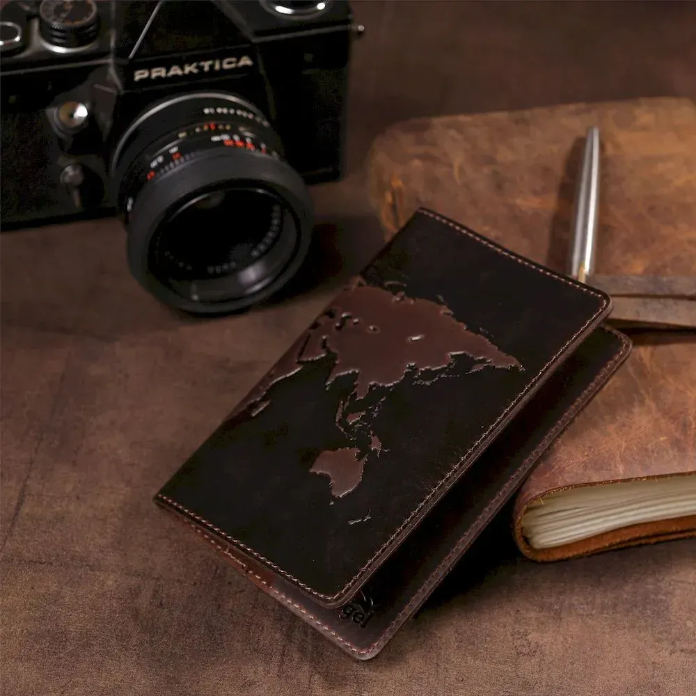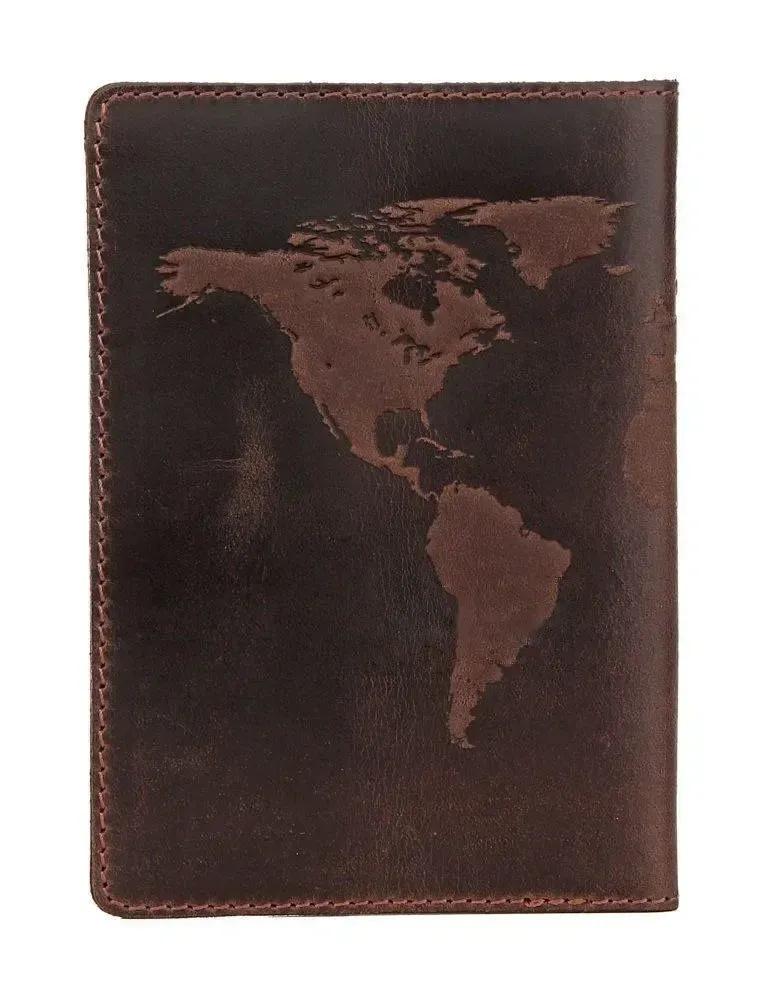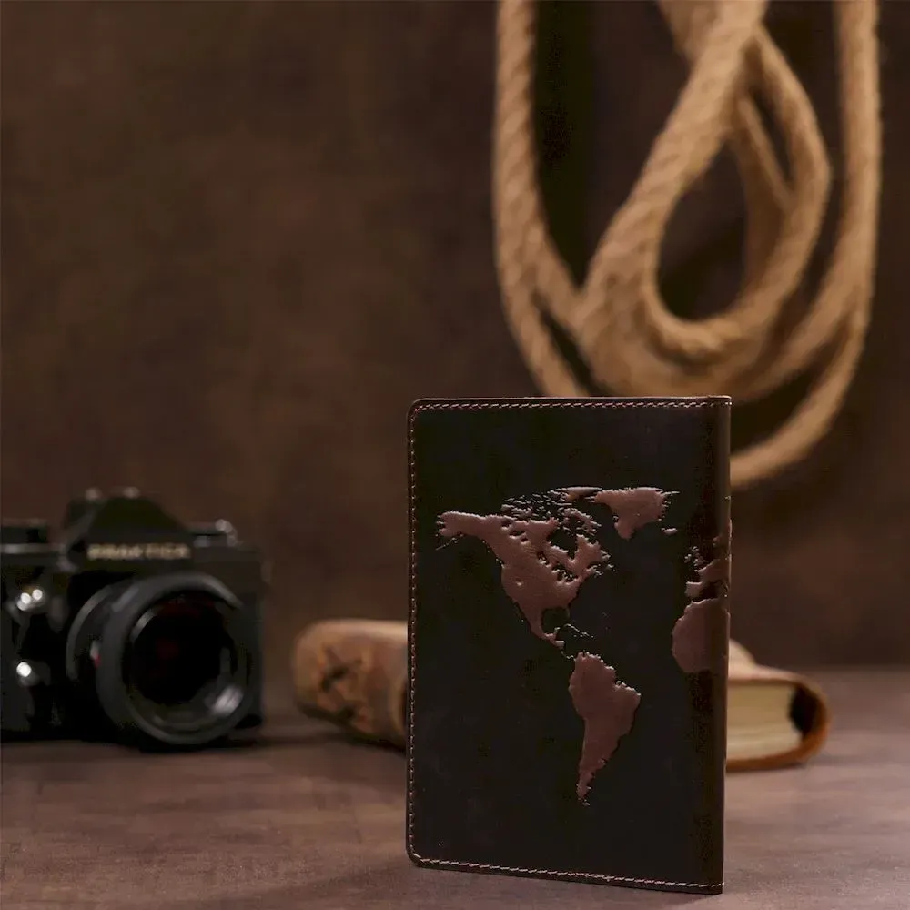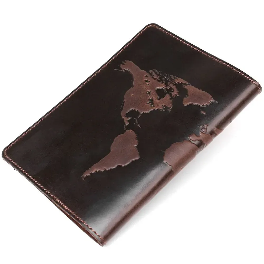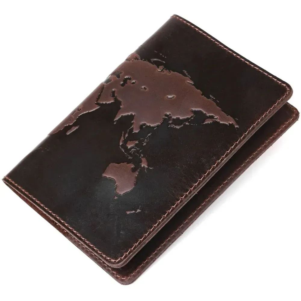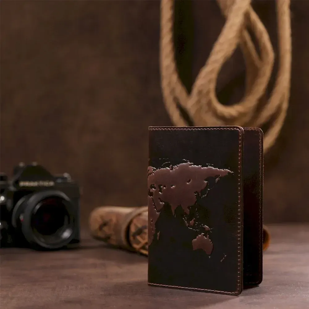 Чудова обкладинка для паспорта , коричневого кольору з тисненням карти світу, виготовлена з натуральної шкіри високої якості.