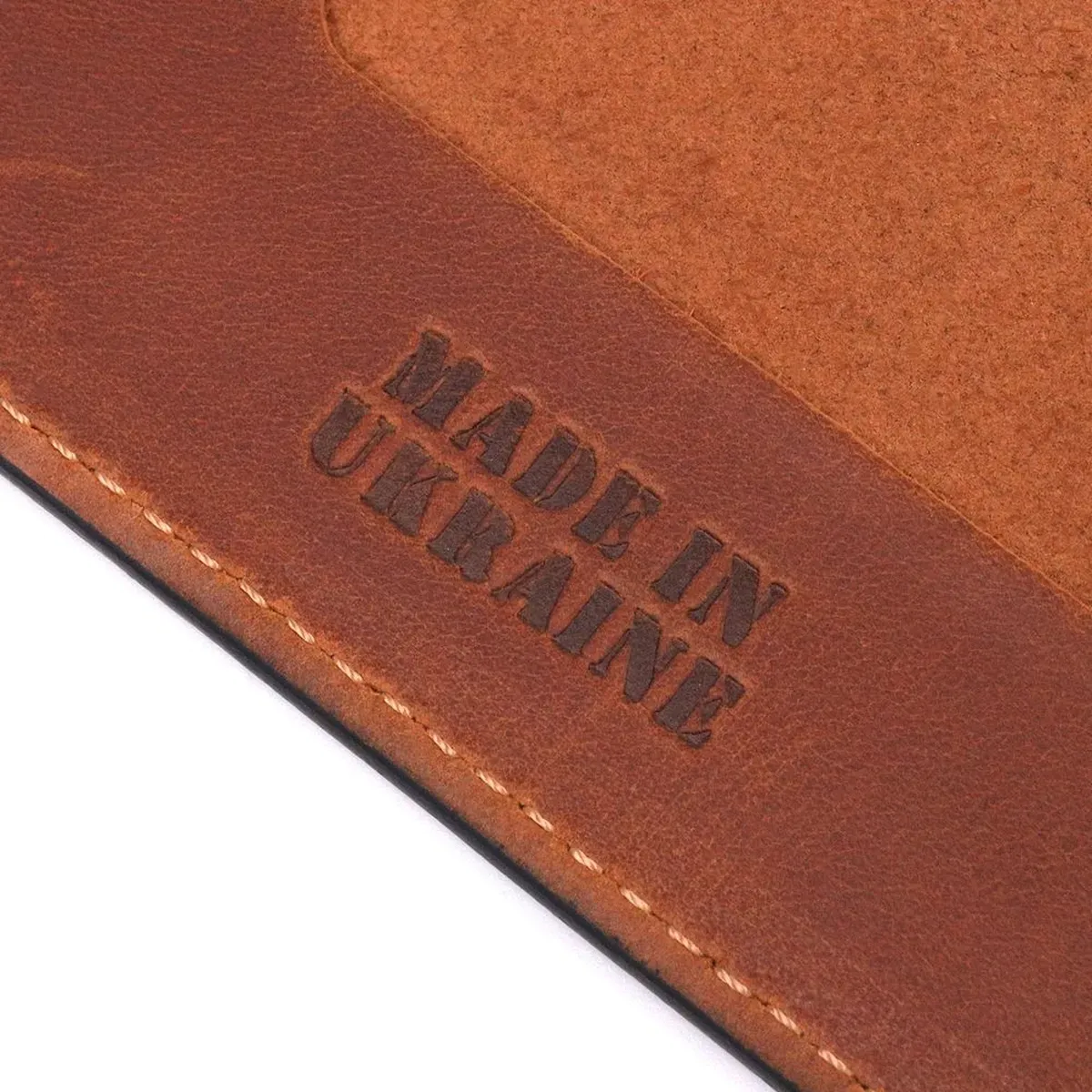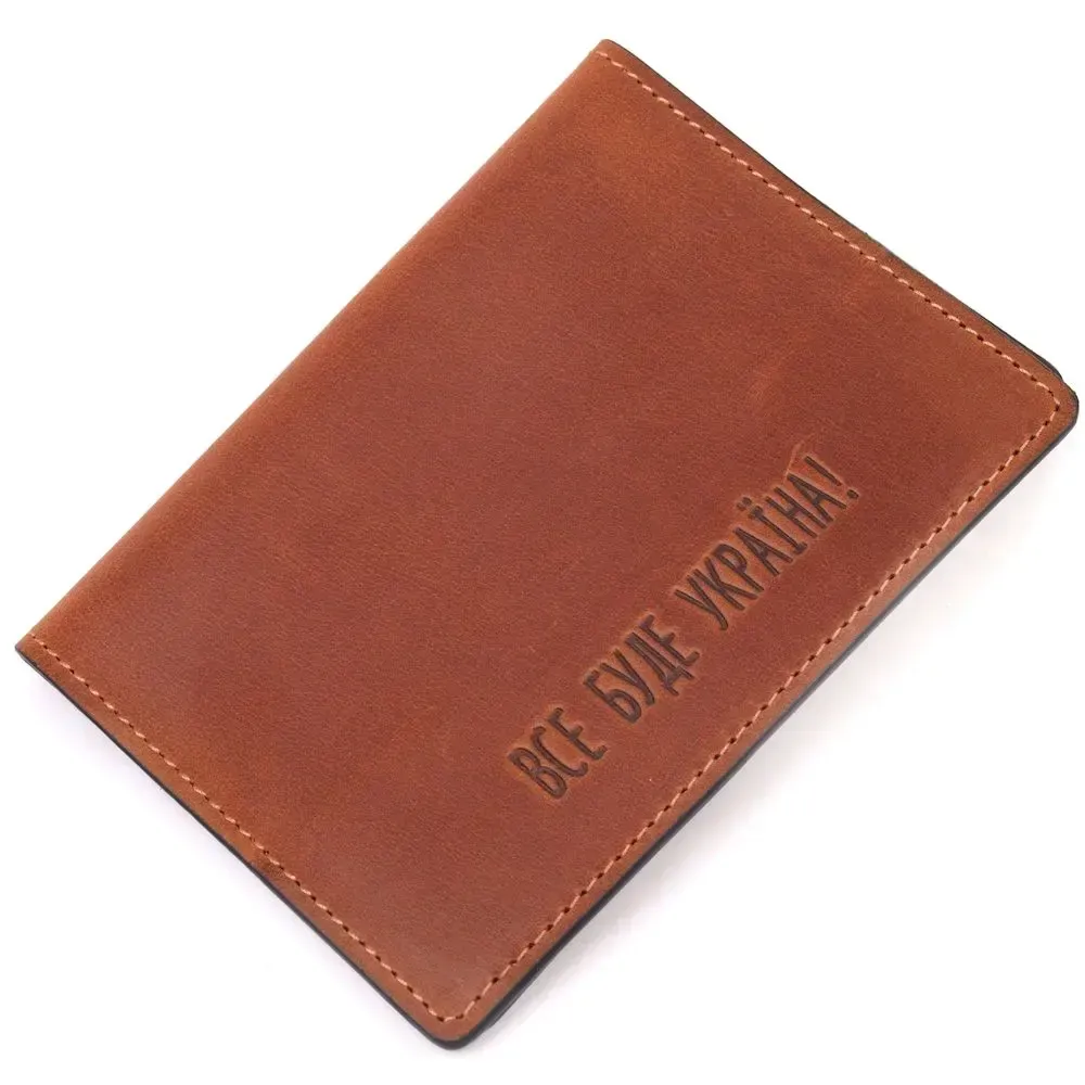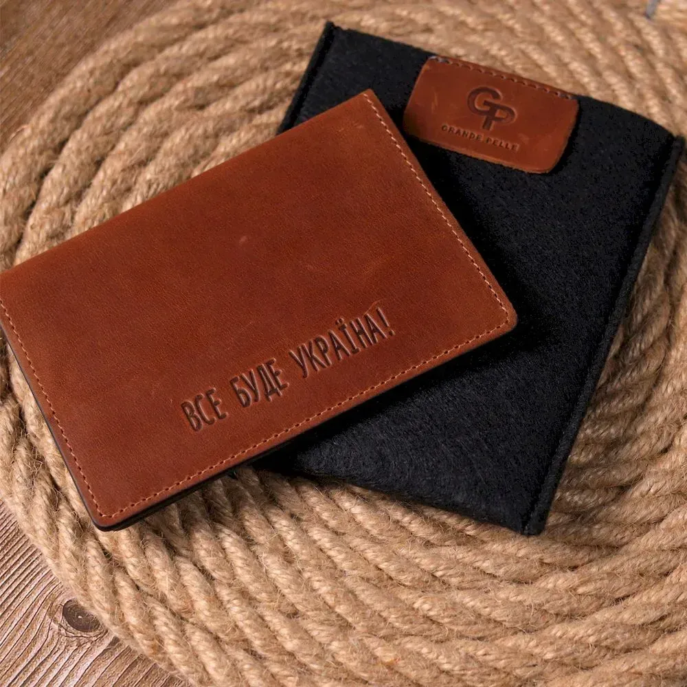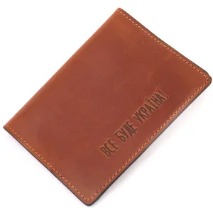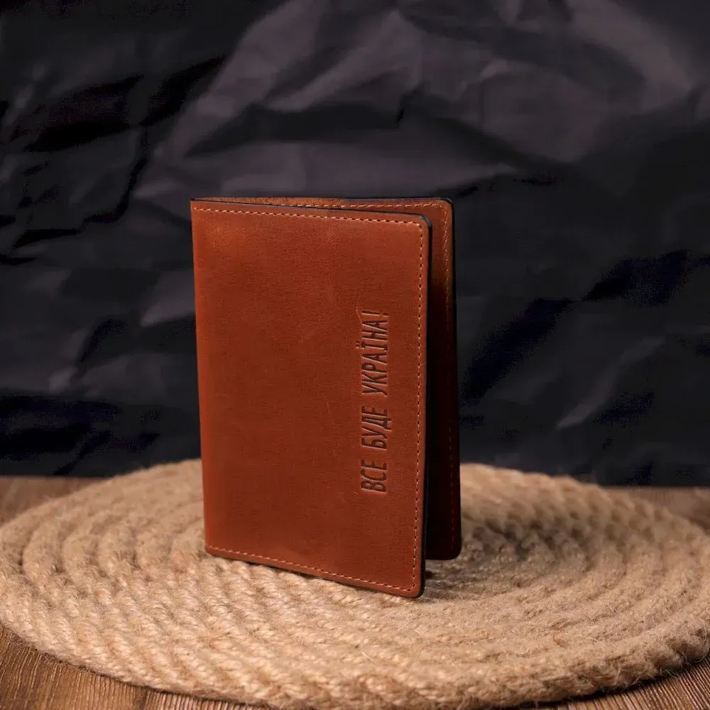 Добротна обкладинка на паспорт з якісної італійської шкіри, з патріотичним написом “Все буде Україна”. Особливістю шкіряної обкладинки є те, що вона надійно захищає документ від пошкоджень та має довгий термін служби. Виріб без застібки, упакований у фірмовий чохол із фетру. Шкіряна обкладинка на паспорт стане чудовим подарунком на будь-яке свято.