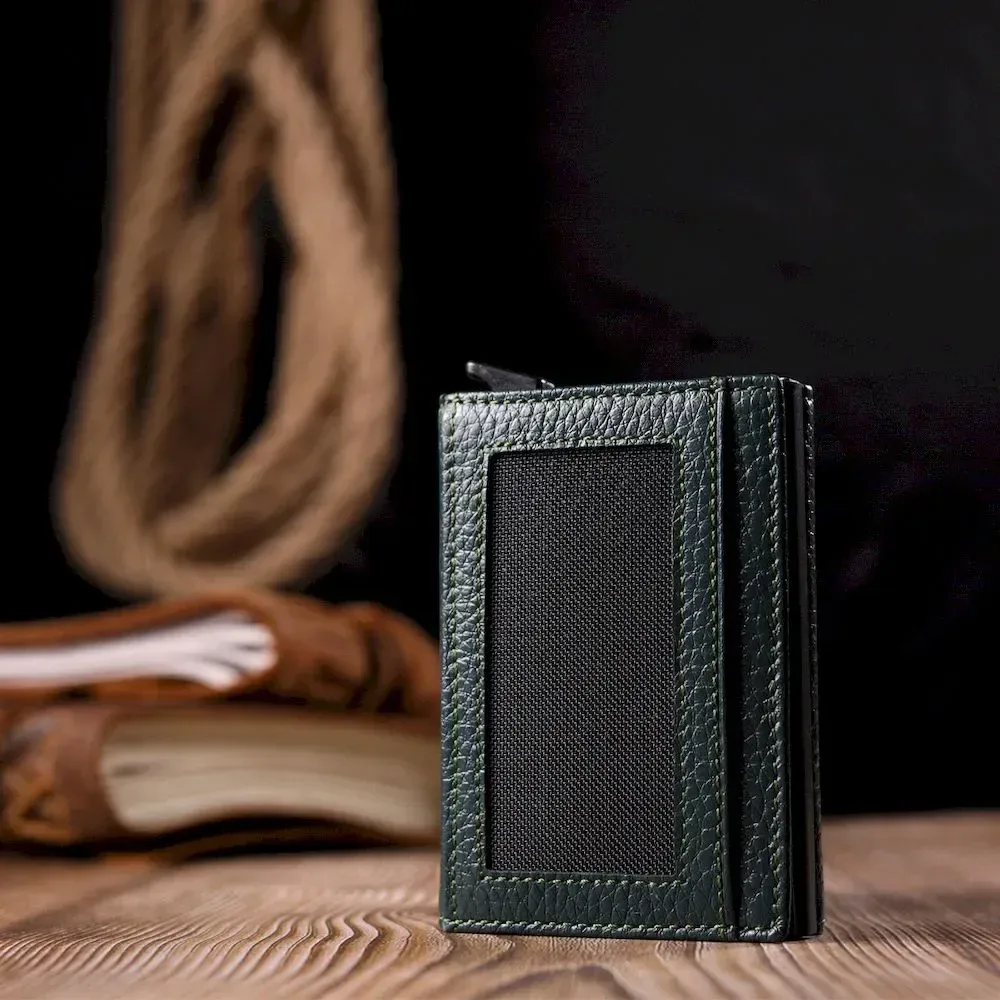 Зручний картхолдер з натуральної шкіри, призначений для зберігання банківських і дисконтних карток і невеликої кількості готівки. Має лаконічний дизайн, відмінно лягає в руку, поміщається в кишеню, а також будь-яку сумку. Шкіра м'яка, приємна на дотик. Механізм працює надійно та зручний у використанні; картки добре закріплені в аксесуарі. Відмінна ідея для подарунка близькій людині.