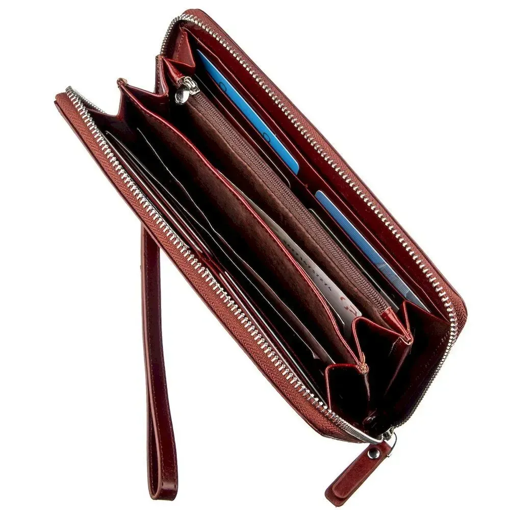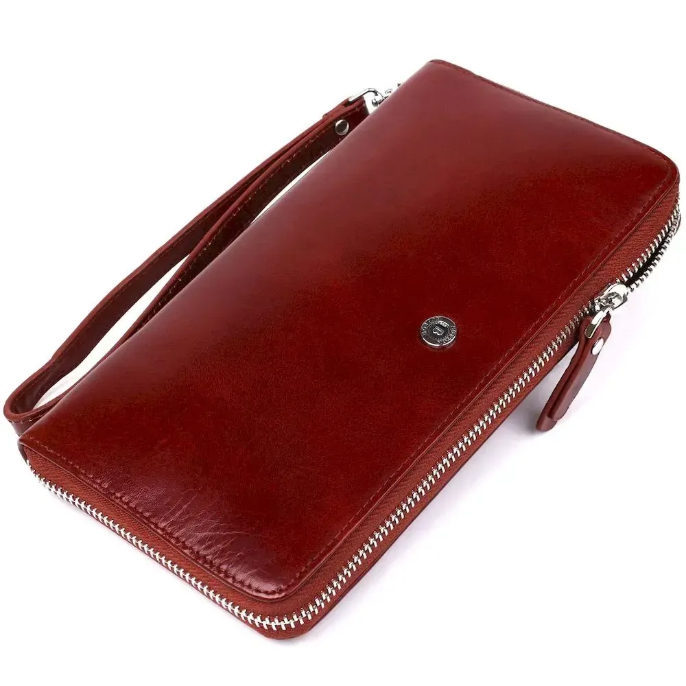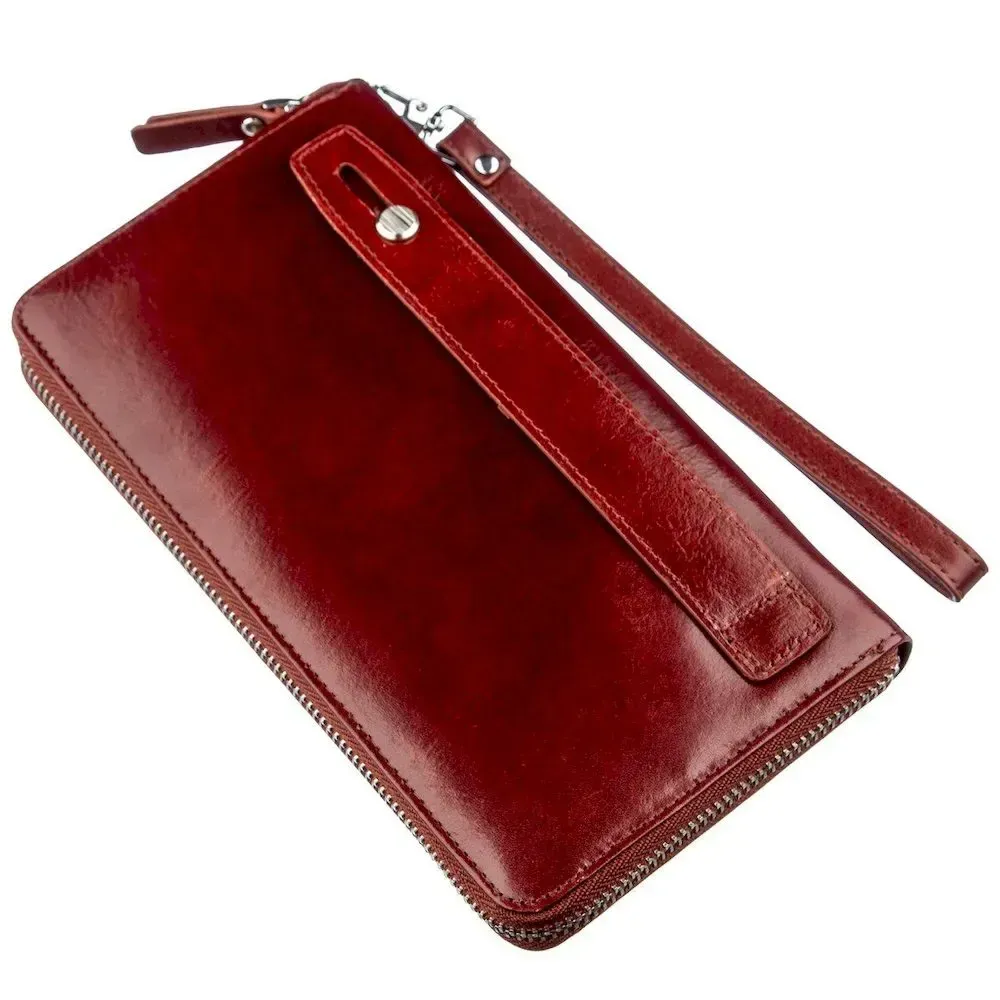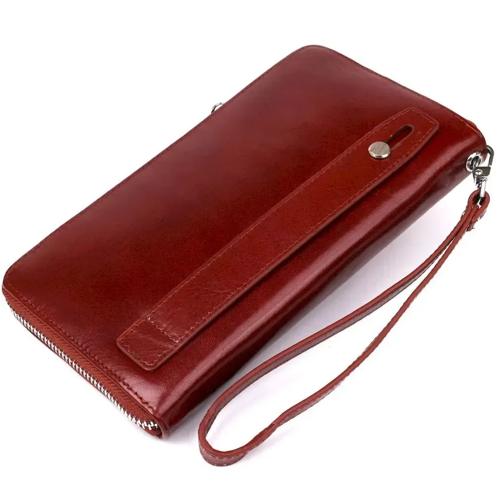 Стильний чоловічий портмоне-клатч з безліччю відділень та кишень. Портмоне красивий стильний коричневий з червоним відтінком. Виконано з приємної на дотик натуральної шкіри високої якості. Дане портмоне обов'язково підкреслить Вашу безпосередність та відмінний смак. Воно досить практичне та оригінальне. Портмоне може виконувати функцію як звичайного гаманця, так і окремого щоденного аксесуара, який легко носитися за допомогою ременя на зап'ястя або ручки на тильній стороні. Цей виріб чудово підійде на подарунок Вашому коханому чоловікові. Запаковано воно у фірмову картонну коробку.