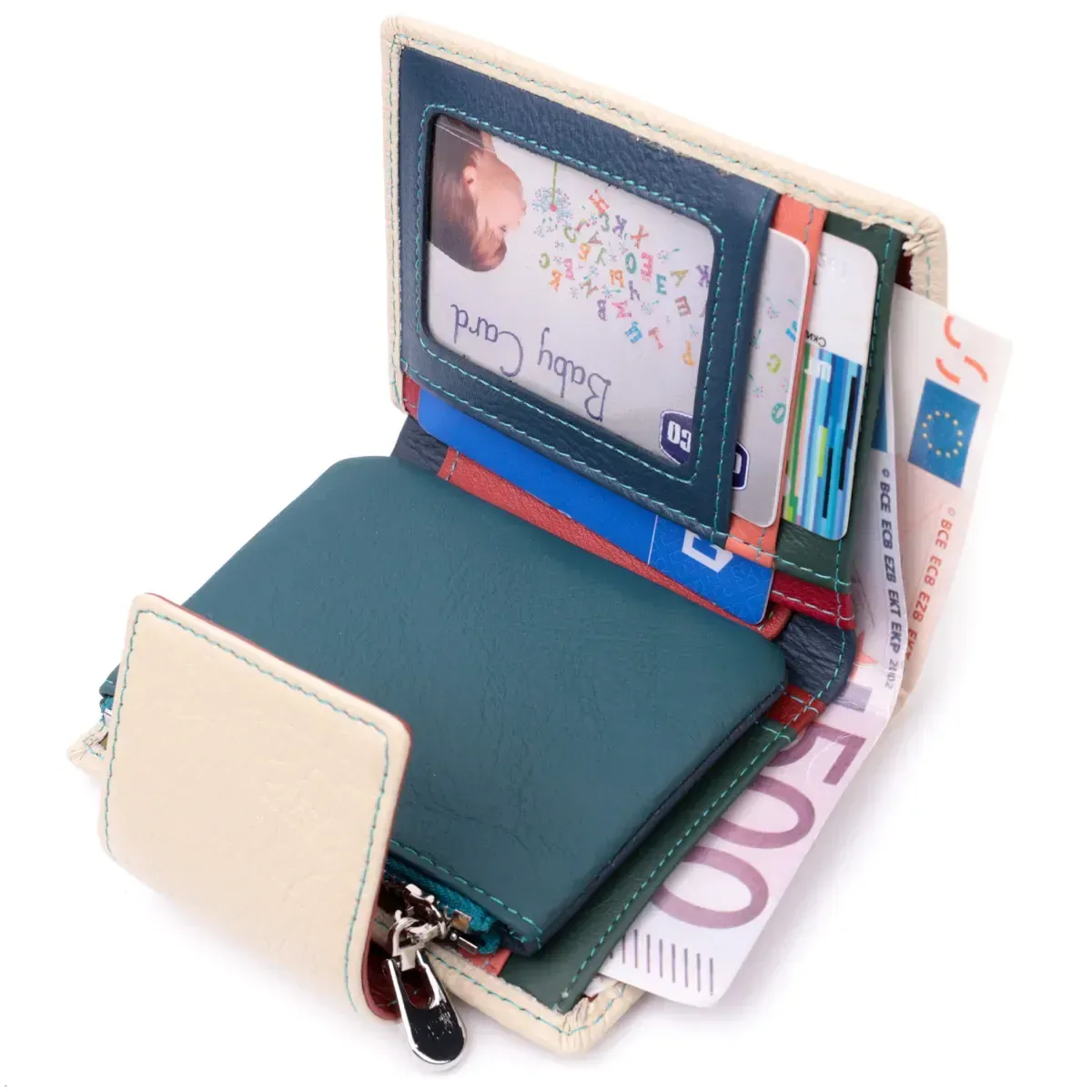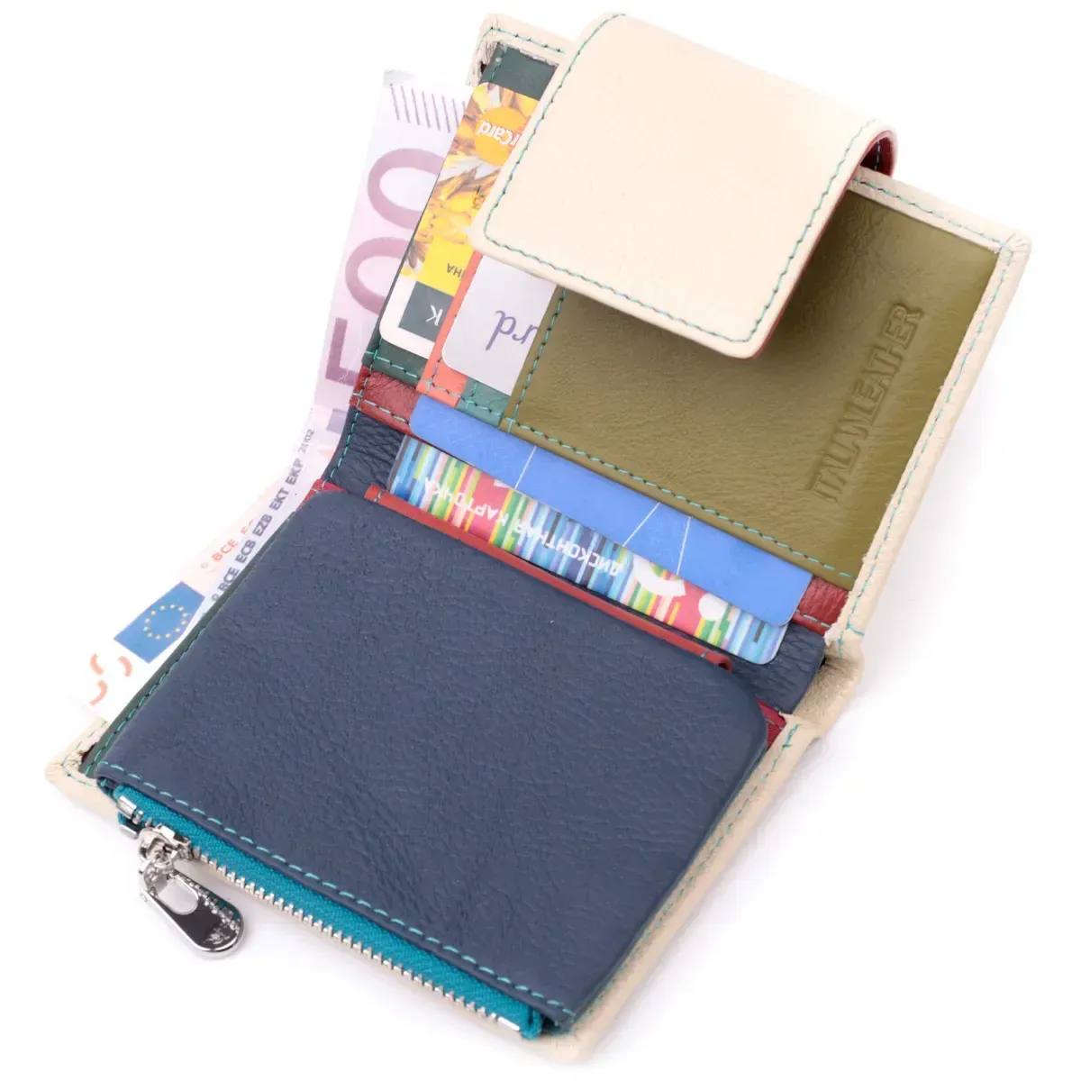 Стильне вертикальне портмоне в два складення зручного розміру з натуральної шкіри найвищої якості. Гаманець кремово-білого кольору зовні та різнобарвний усередині, що дуже стильно та сучасно. Шкіряне портмоне дуже практичне і служить досить довго. Аксесуар складається з основного відділення зі шкіряною перегородкою для купюр, монетниці, чотирьох осередків для карт, прозорого віконця для пропуску та чотирьох прихованих кишень. Портмоне доповнено надійною фурнітурою і прошито по краю рівним рядком бірюзового кольору. Укомплектований гаманець у фірмову картонну коробку білого кольору. Виріб стане ідеальним подарунком для дівчини будь-якого віку.