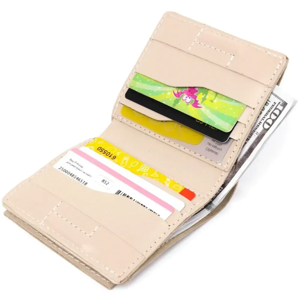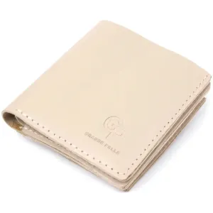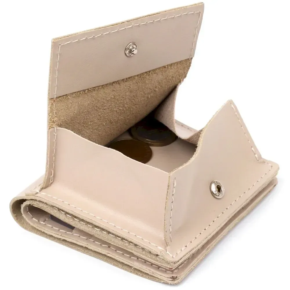 Цікаве жіноче портмоне у бежевому кольорі від українського виробника. Виконано з натуральної шкіри, яка стійка до зношування. Має просторе відділення для купюр, слоти для пластикових карток та оригінальну монетницю на кнопці на зовнішній стороні. Запаковано виріб у фірмову білу картонну коробку.