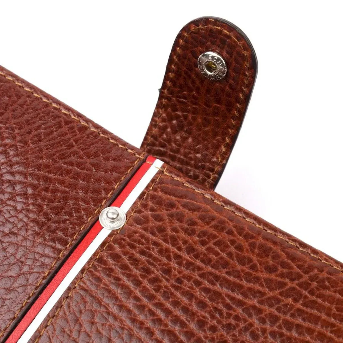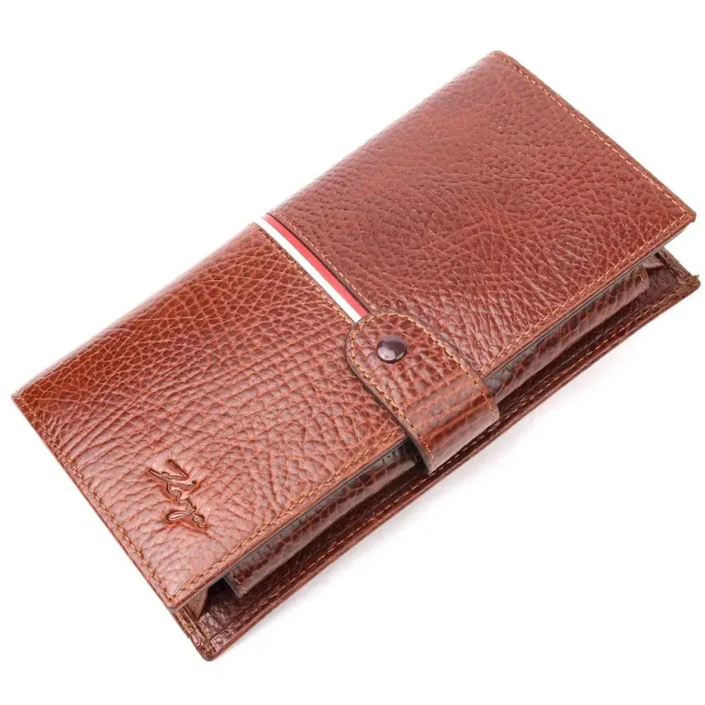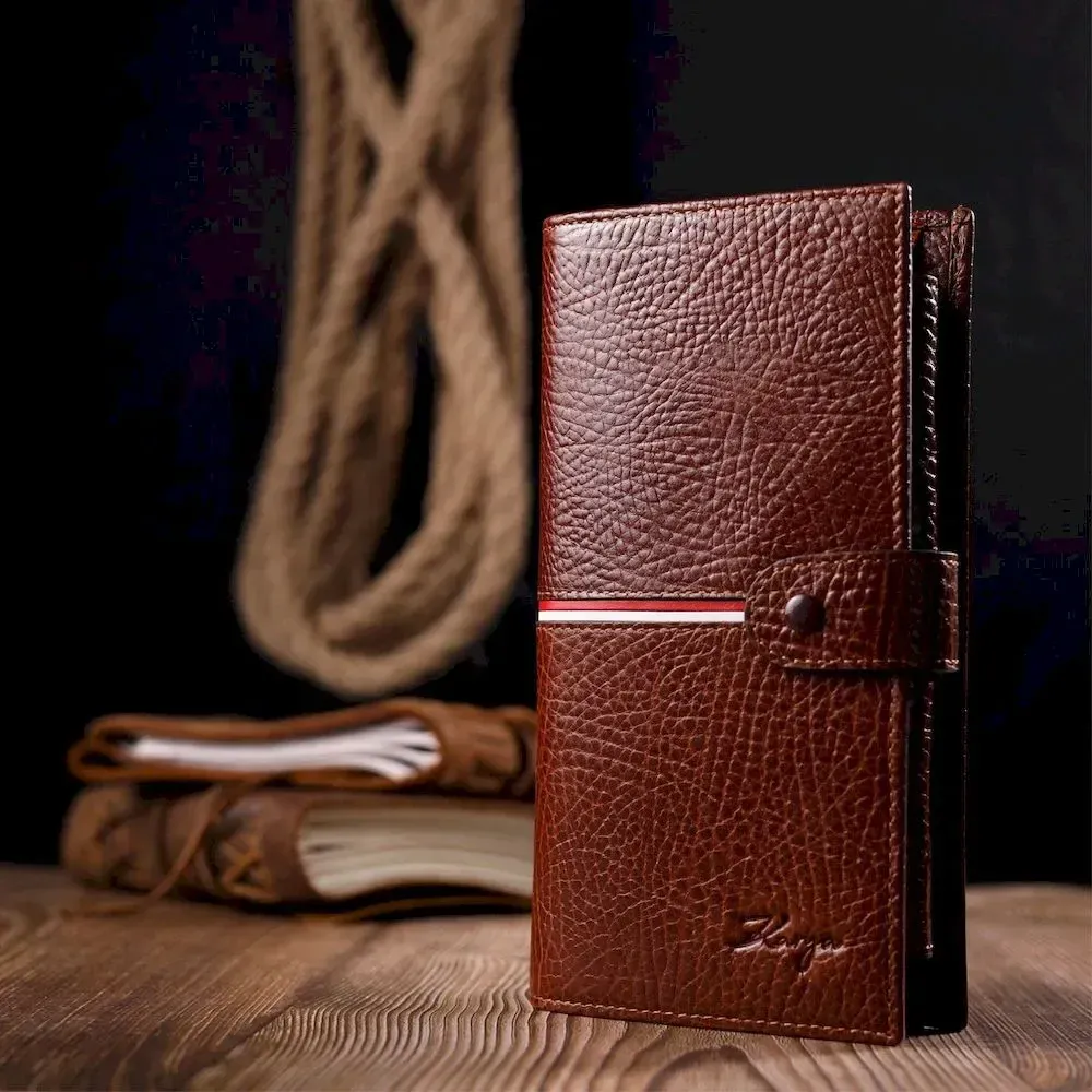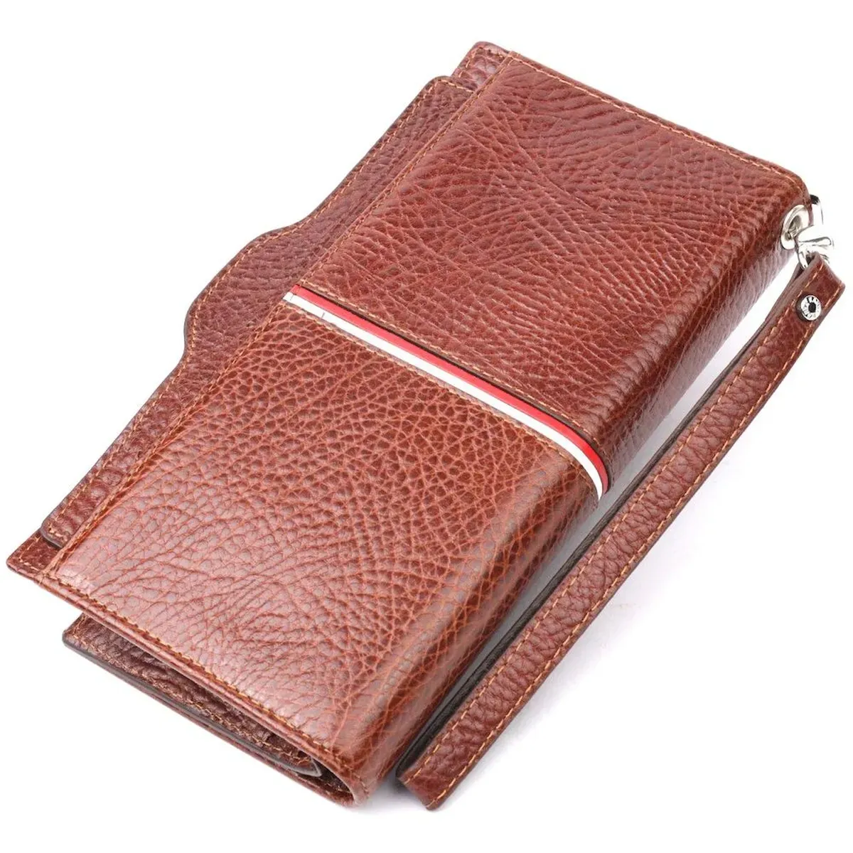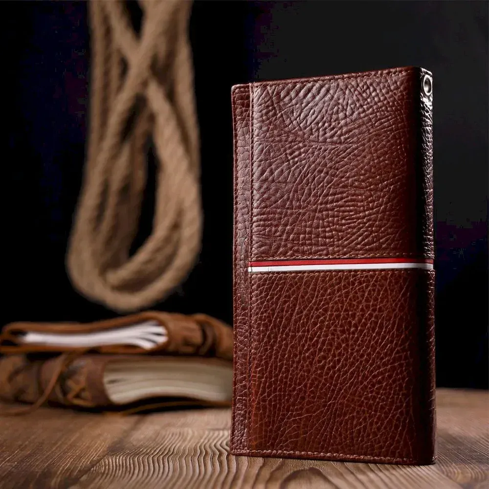 Стильний чоловічий клатч із натуральної фактурної шкіри з використанням добротного текстилю (внутрішня підкладка). Носиться за допомогою ремінця на зап'ясті або просто в руці. Має декоративну вставку червоно-білого кольору. Тип фіксації в клатчі: хлястик із металевою кнопкою. Для зручності в носінні гаманець укомплектований зап'ястним ремінцем. Дуже гідна модель вертикального формату. З таким аксесуаром чоловік буде виглядати солідно і впевненим у собі.