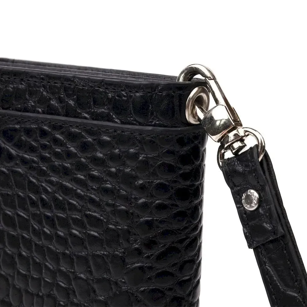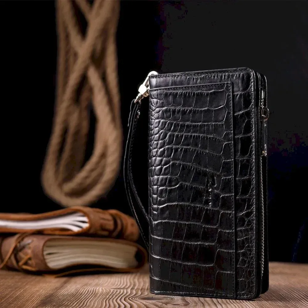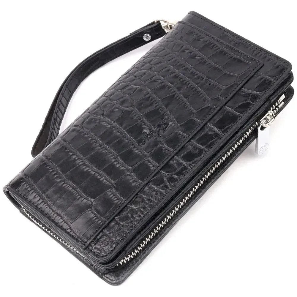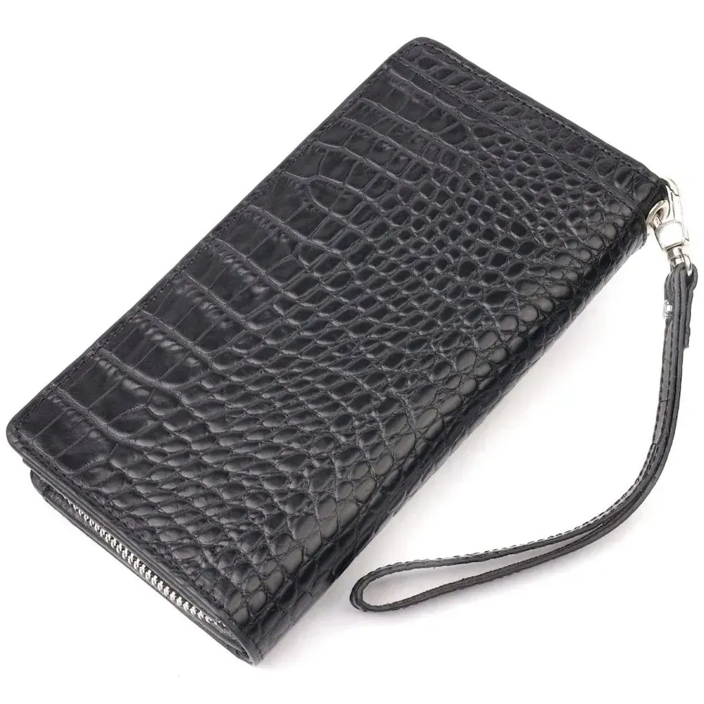 Цікавий клатч з натуральної шкіри, з тисненням під крокодила, в класичному чорному кольорі, з використанням добротного текстилю (внутрішня підкладка) . Особливістю гаманця є наявність блоку для кредитних карток, що закривається на кнопки. Основне відділення аксесуара закривається на блискавку. Носиться за допомогою ремінця на зап'ясті або просто в руці. Використовується якісна фурнітура кольору срібла. Запакований аксесуар у фірмову коробку та пакет бренду. Вироби з натуральної шкіри завжди будуть чудовим подарунком для близької людини.