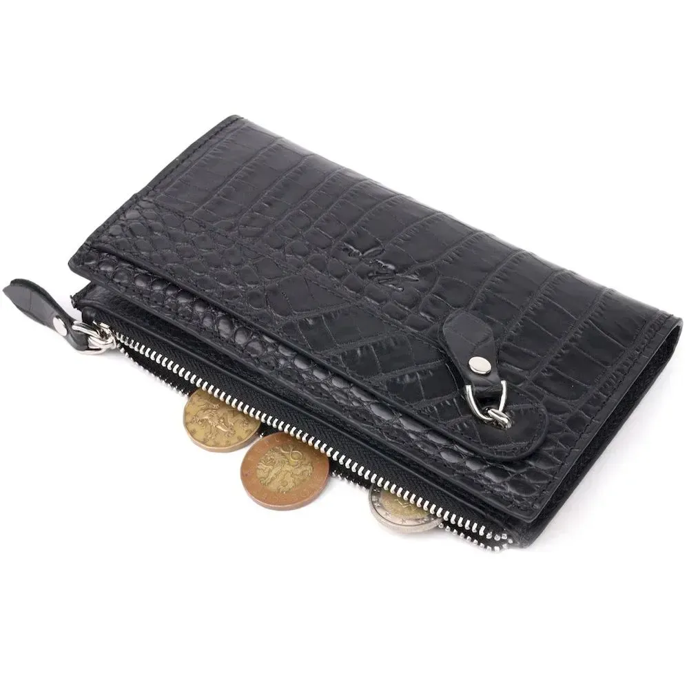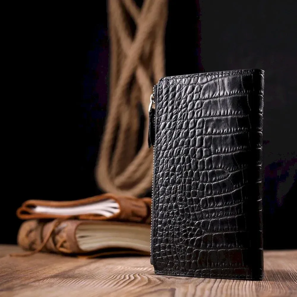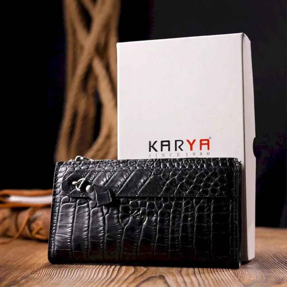 Оригінальний складний гаманець з натуральної шкіри з тисненням під крокодила KARYA 21128 Чорний