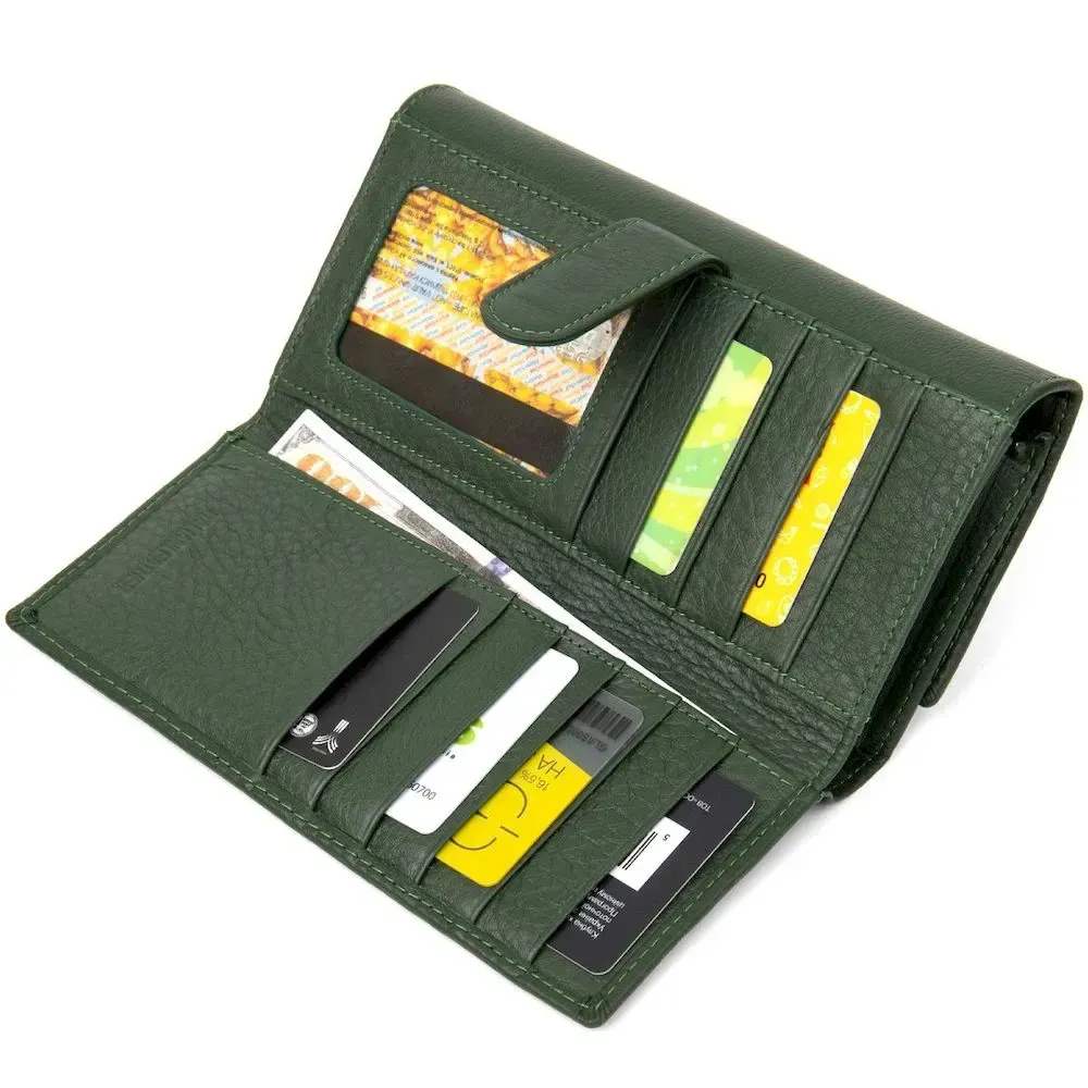 - слоти закриваються на хлястик з кнопкою, яка регулює обсяг його наповнення;<й / Виготовлений із натуральної м'якої шкіри із зернистою фактурою. Наповнення дуже практичне та відповідає всім вимогам сучасної життя. Також це відмінний варіант для тих, хто носити із собою багато карток чи візиток. Всі шви акуратно та надійно прошиті та мають такий же зелений колір. Це чудовий вибір для жінок будь-якого віку.