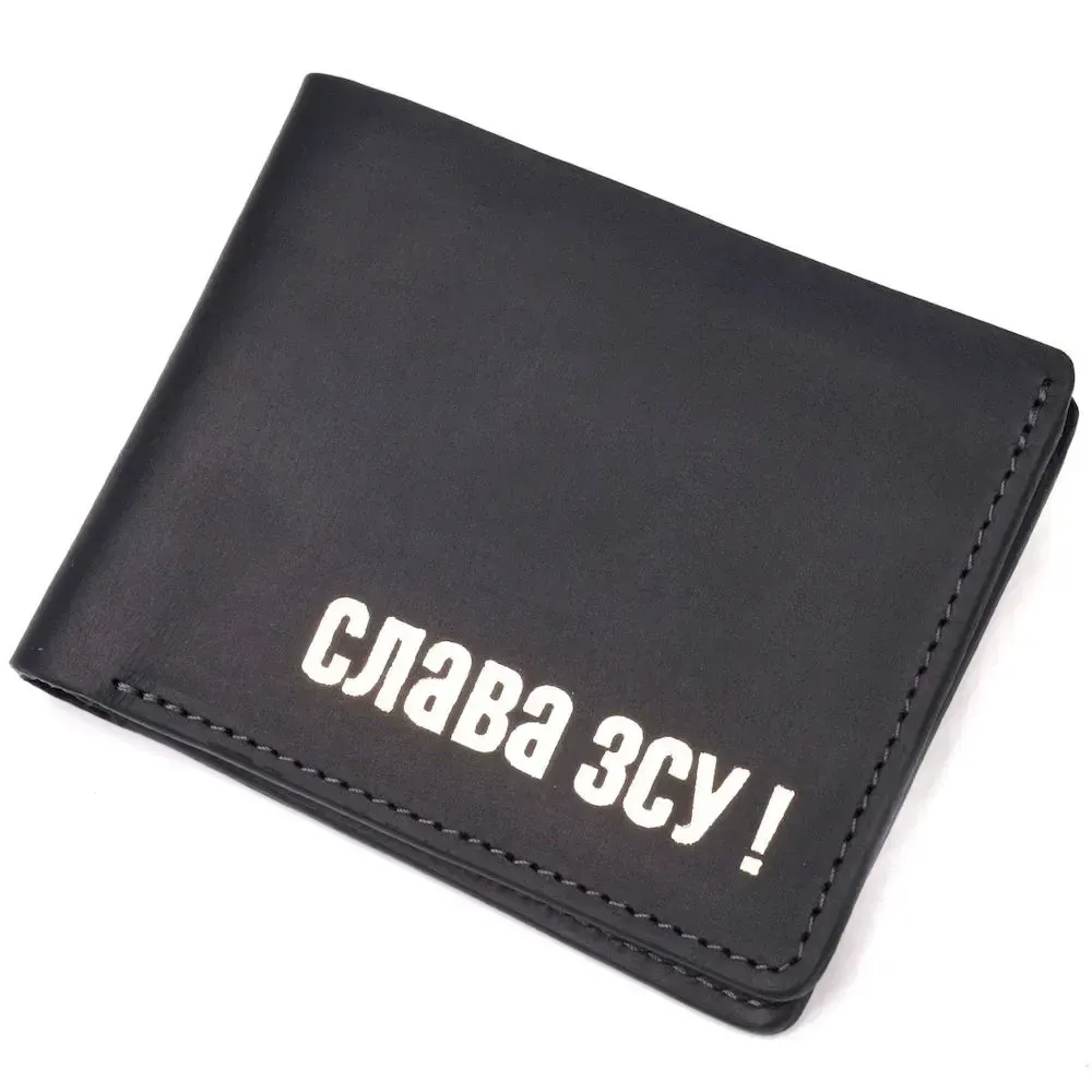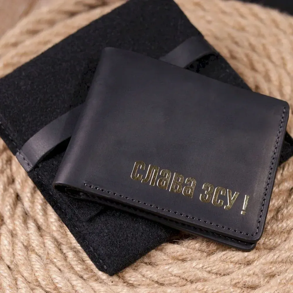 - упаковано у фетровий чохол.< /p> Чудовий шкіряний гаманець чорного кольору, з патріотичним написом “Слава ЗСУ”. Виріб пошитий із якісної вінтажної шкіри, з високими показниками зносостійкості. Портмоне має одне велике відділення для купюр усіх номіналів, а також достатню кількість відділень для карток, без застібки. Шкіряний гаманець стане чудовим подарунком на всі випадки життя.