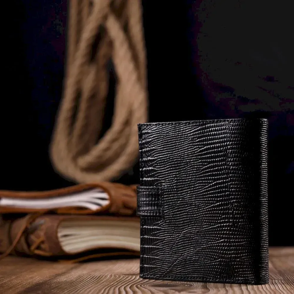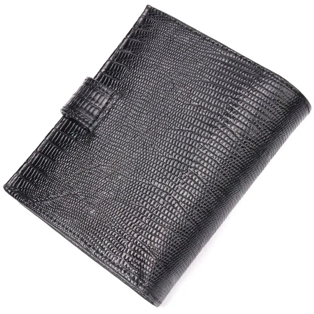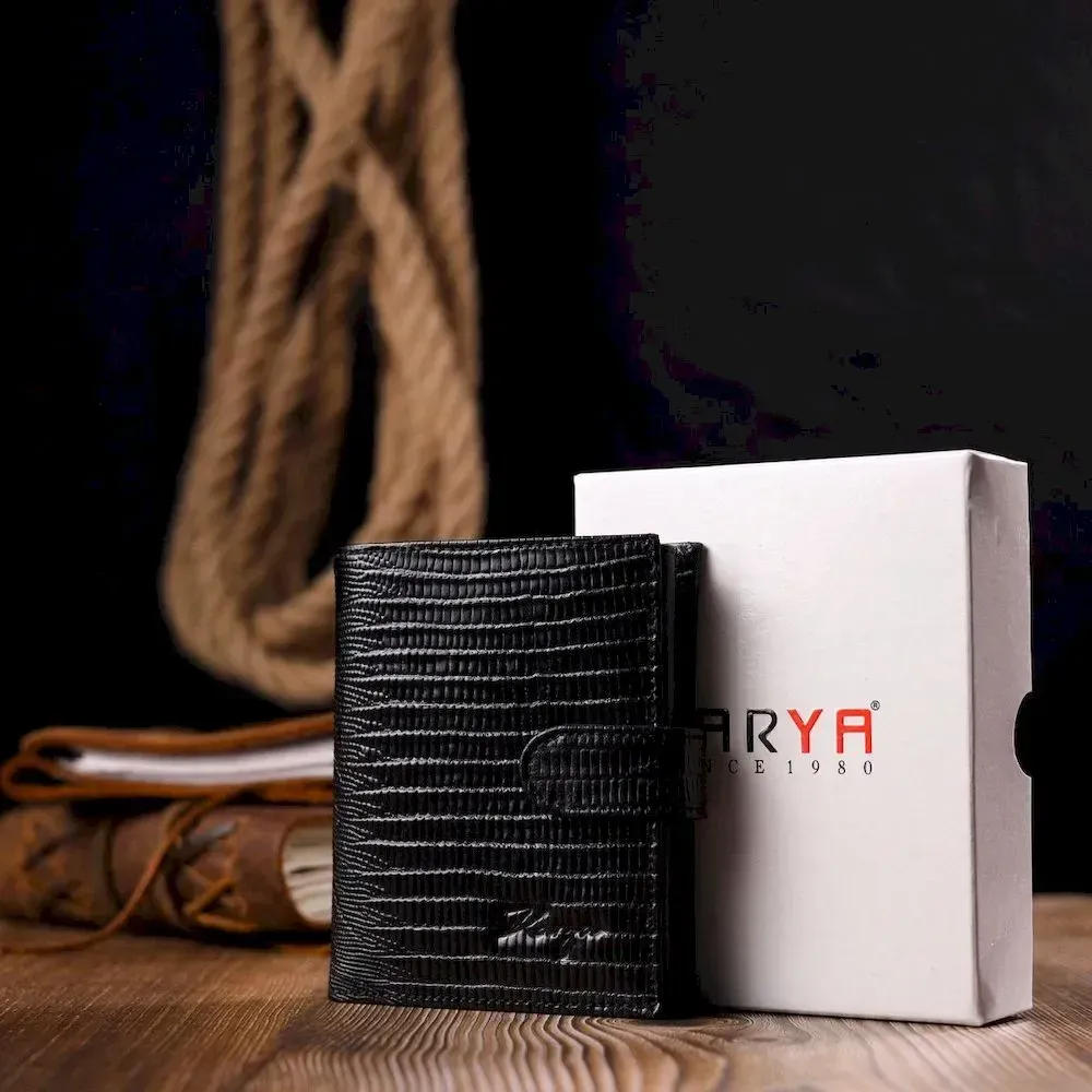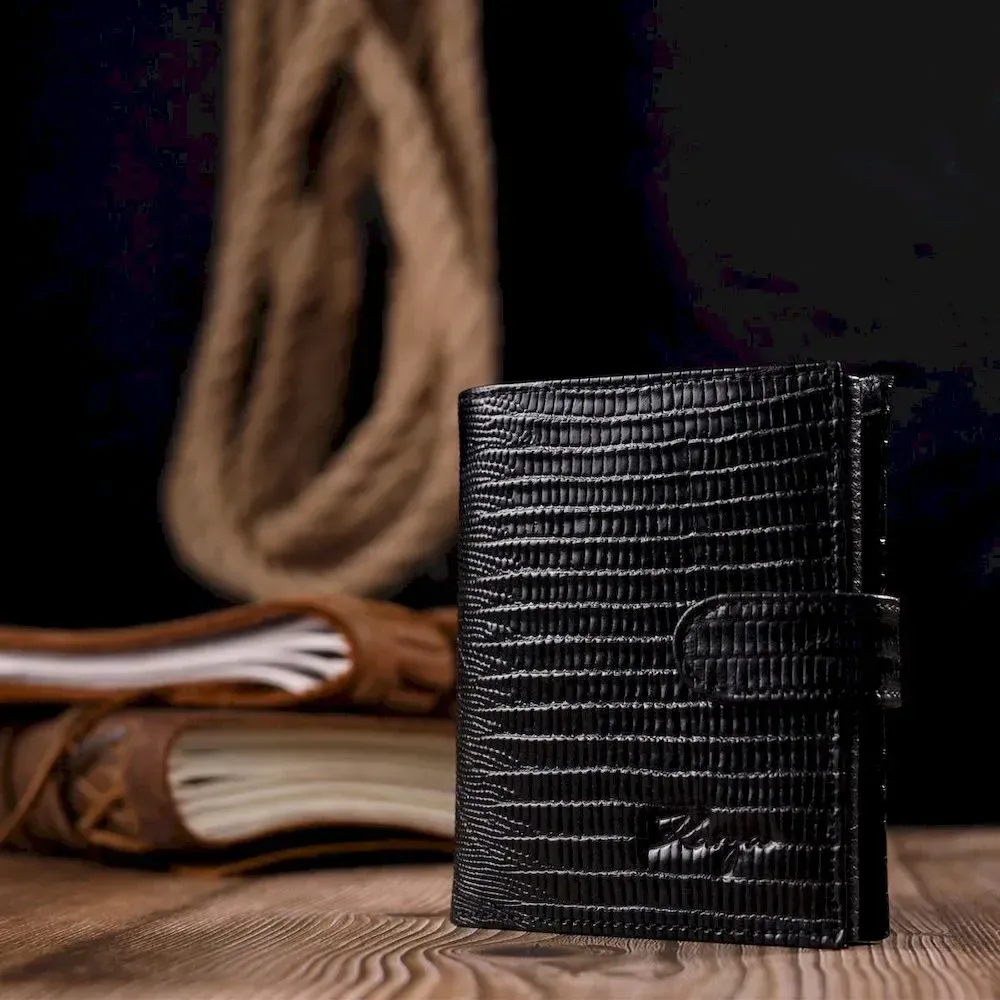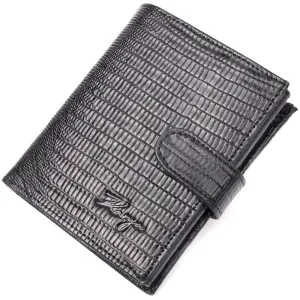Невеликий чоловічий гаманець із натуральної шкіри з тисненням під рептилію, у чорному кольорі. Особливістю цього аксесуара є наявність блоку для кредитних карток, що закривається хлястиком на кнопку . Виріб закривається на хлястик із кнопкою . На лицьовій стороні у вигляді декору розташований металевий логотип виробника. Аксесуар упакований у фірмову коробочку. Вироби з натуральної шкіри завжди будуть чудовим подарунком для близької людини.