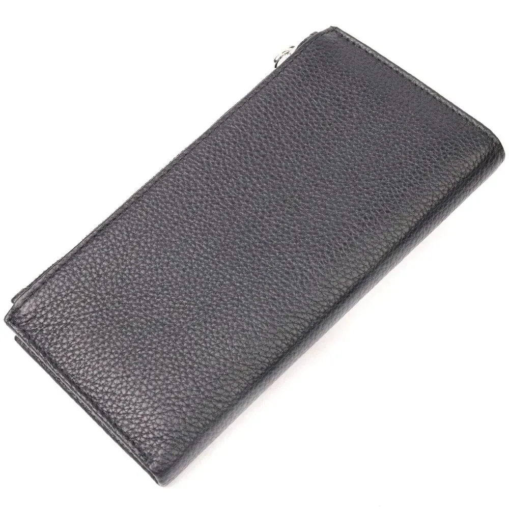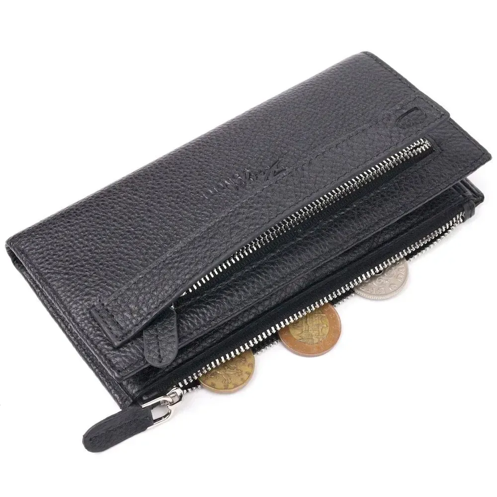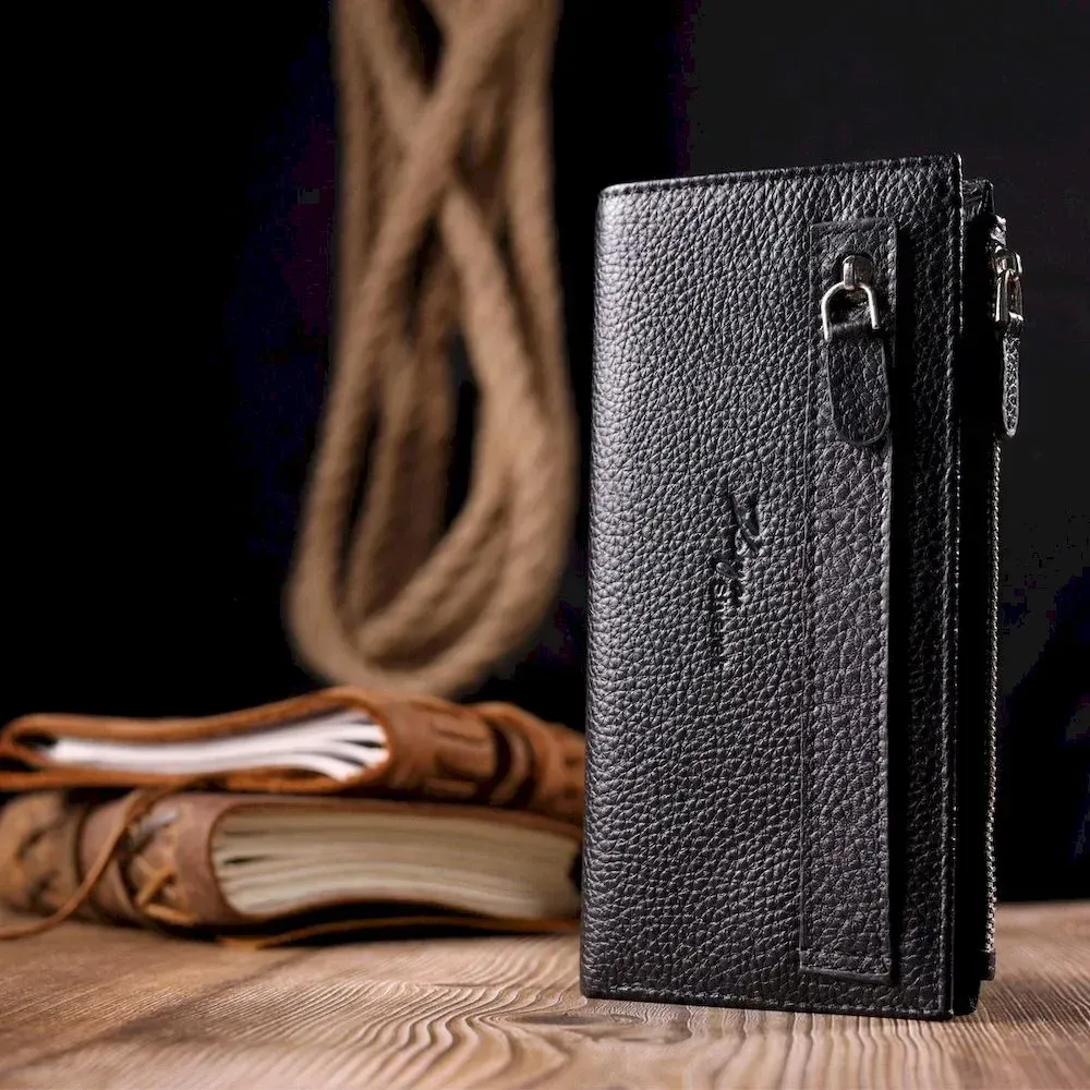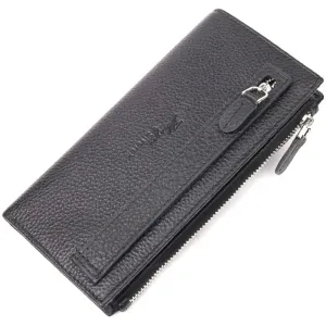 Багатофункціональний гаманець з натуральної шкіри у класичному чорному кольорі. Складається аксесуар навпіл, закривається на кнопку. Якісна фурнітура доповнює та прикрашає виріб. Такий гаманець з натуральної шкіри - це ідеальний варіант на кожен день для тих, хто цінує якість, зручність та комфорт, а також чудово доповнюватиме Ваш повсякденний образ. Запакований аксесуар у фірмову коробку та пакет бренду. Вироби з натуральної шкіри завжди будуть чудовим подарунком для близької людини.